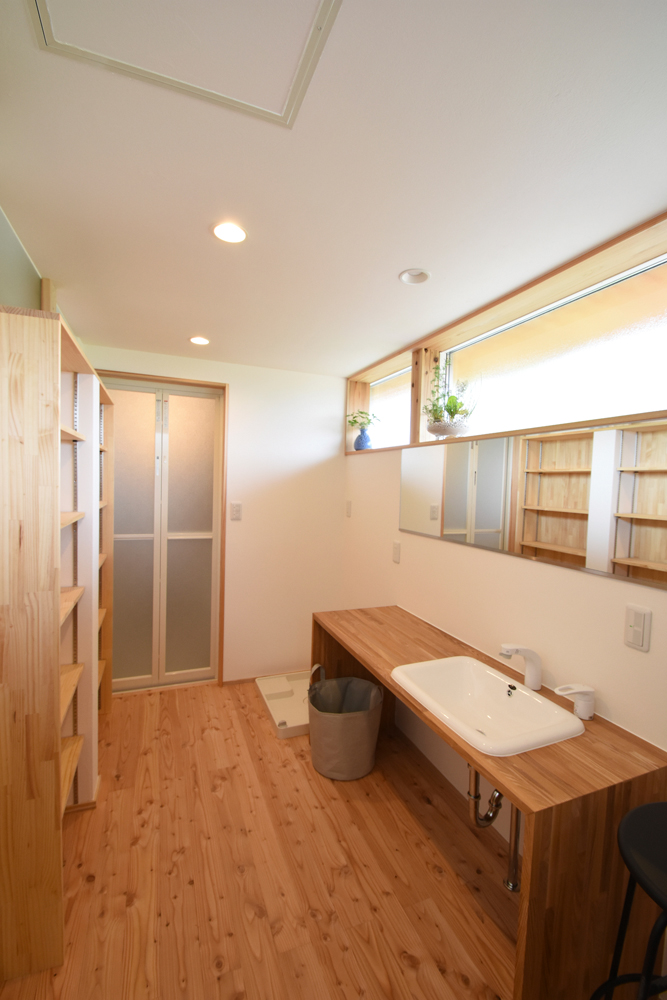 明るさを確保するため、高い位置に窓を設けた洗面脱衣室。大きな鏡を配した洗面台と棚はすべて造作