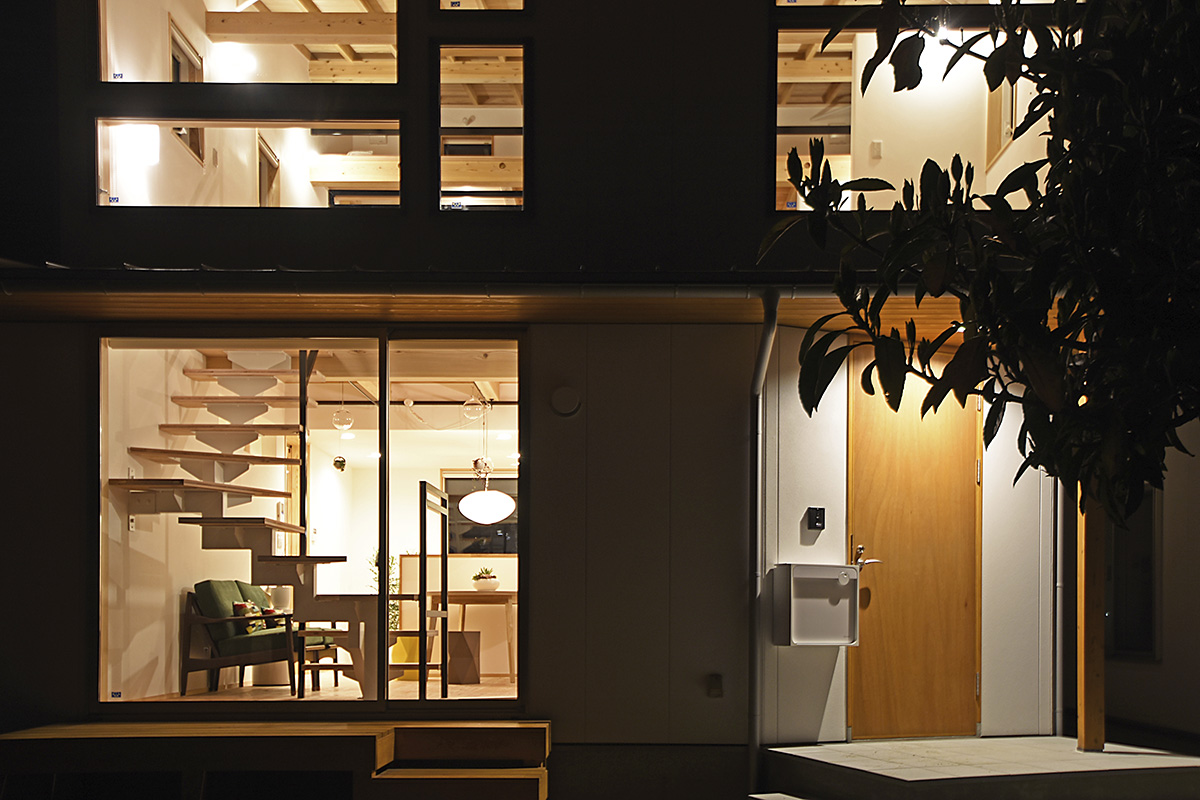 夜の外観は照明が室内を柔らかく包み込み、家族の楽しい日常を想像させてくれる