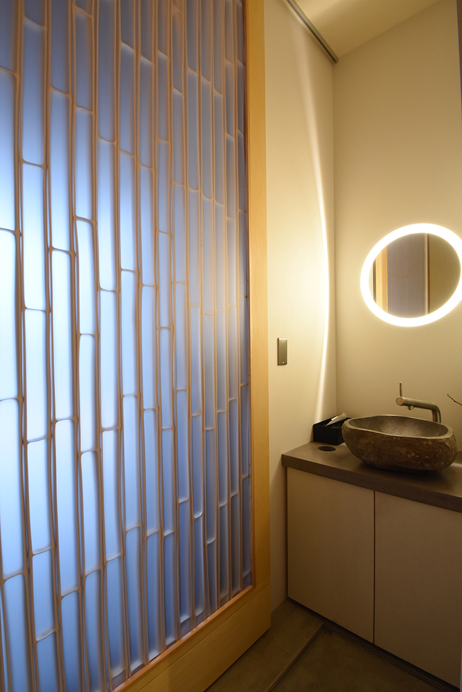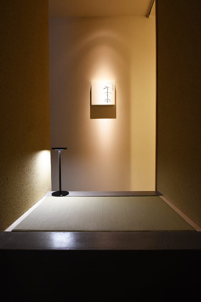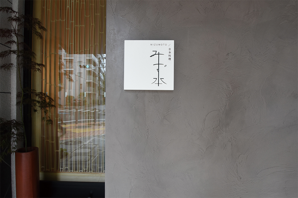 食材の可能性と新たな日本料理の探求をテーマに、店主おまかせの日本料理を提供する「日本料理 みず本」。外観からはあえて店内の様子が見えない設計で、扉を開く楽しみを演出しています。「また来たくなる高級感」を意識した店内は、木、石、土壁、竹、畳などの自然素材からなる上質な空間。入り口に設けられた手洗いから、店主の心遣いを感じることができます。
