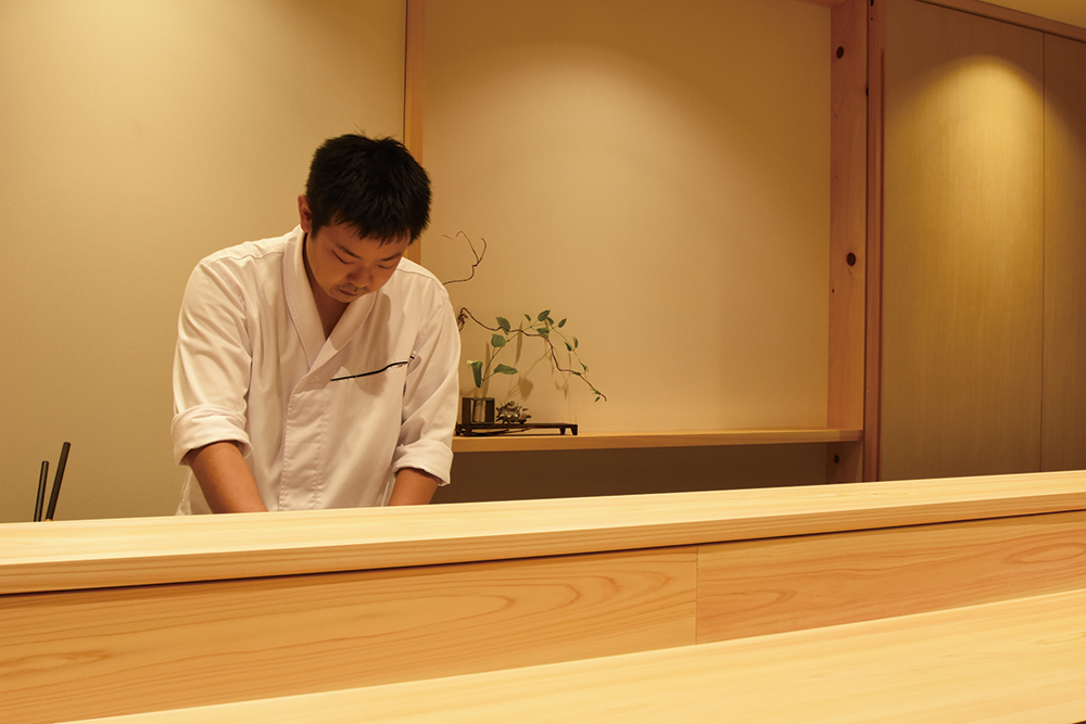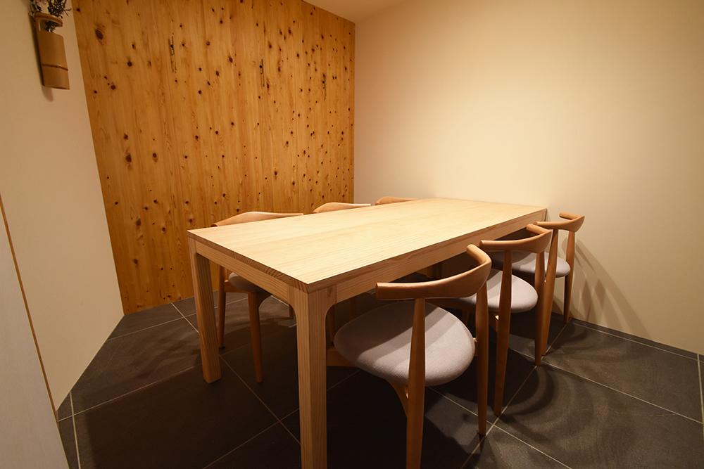 店主と会話をしながら食事を楽しめるカウンターは、檜の白木を用いて造作したもの。丹誠で清々しい佇まいが、洗練された料理をより引き立ててくれます。一方、個室は同じ檜でも節が際立つ板材を壁にあしらうことで、また異なる趣を演出しました。働くスタッフの動線までも考慮した店内は、落ち着いて料理が楽しめる雰囲気に満ちています。