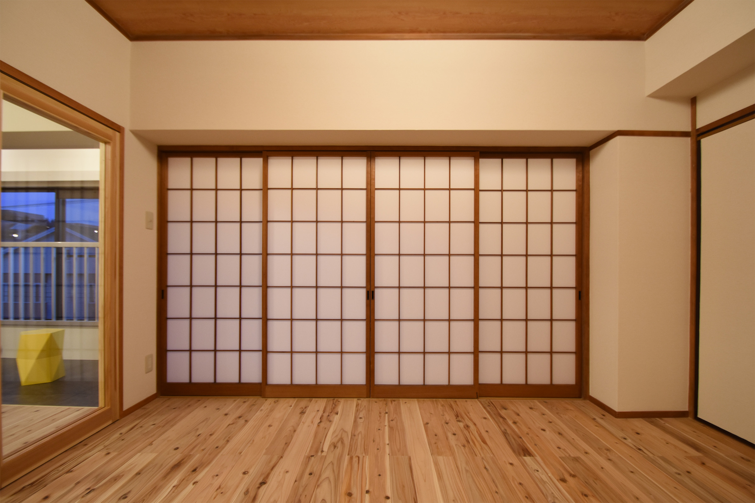 青葉区上杉に建つ、当時築38年のマンションを木のぬくもりが心地よい空間にフルリノベーションしました。自然素材と国産無垢材をふんだんに使用した住まいは、もともと仕切られていたリビングと和室をつなげることで、光と風が駆け抜ける開放感のある間取りに。床には屋久杉、壁は米杉とドイツの本漆喰を採用するなど、素材にもこだわりを感じるプランをご覧ください。