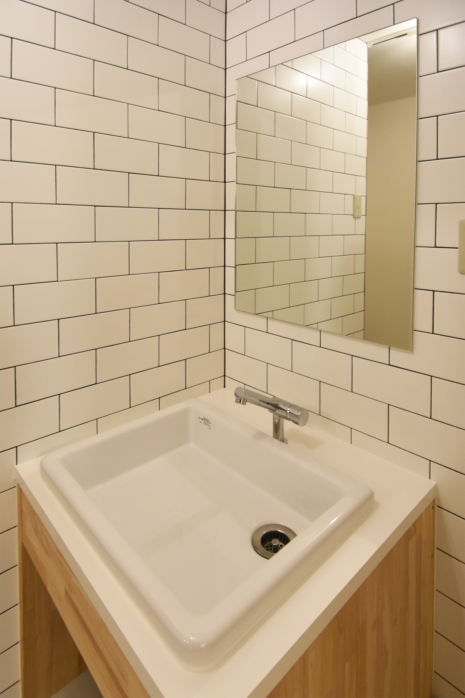 白いタイルですっきりとした印象の洗面脱衣室。幅広の使いやすい造作洗面台を設置