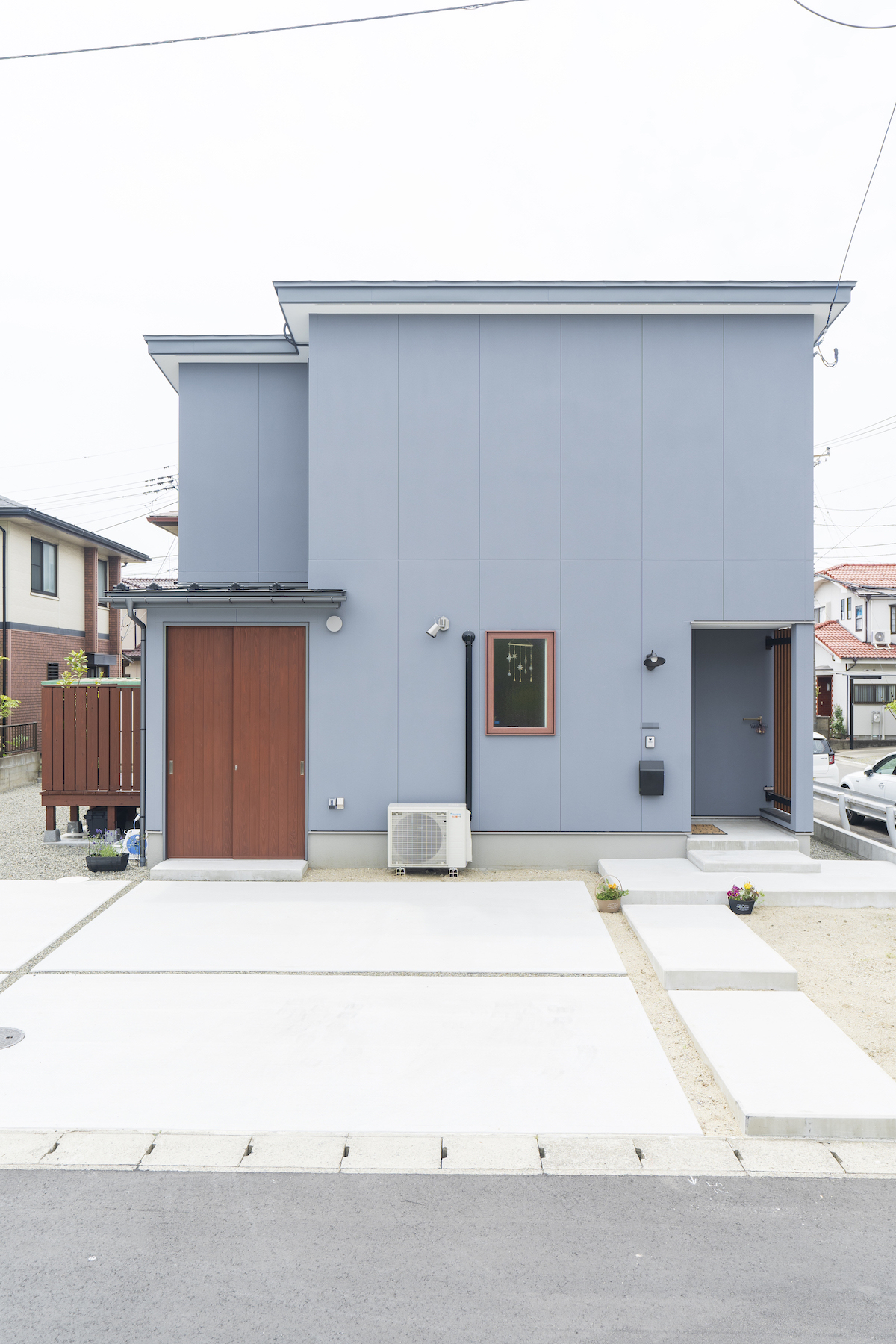 無駄を省いたシンプルな箱型の外観。建物の配置を工夫し、周囲に計5台分の駐車場スペースを設けた