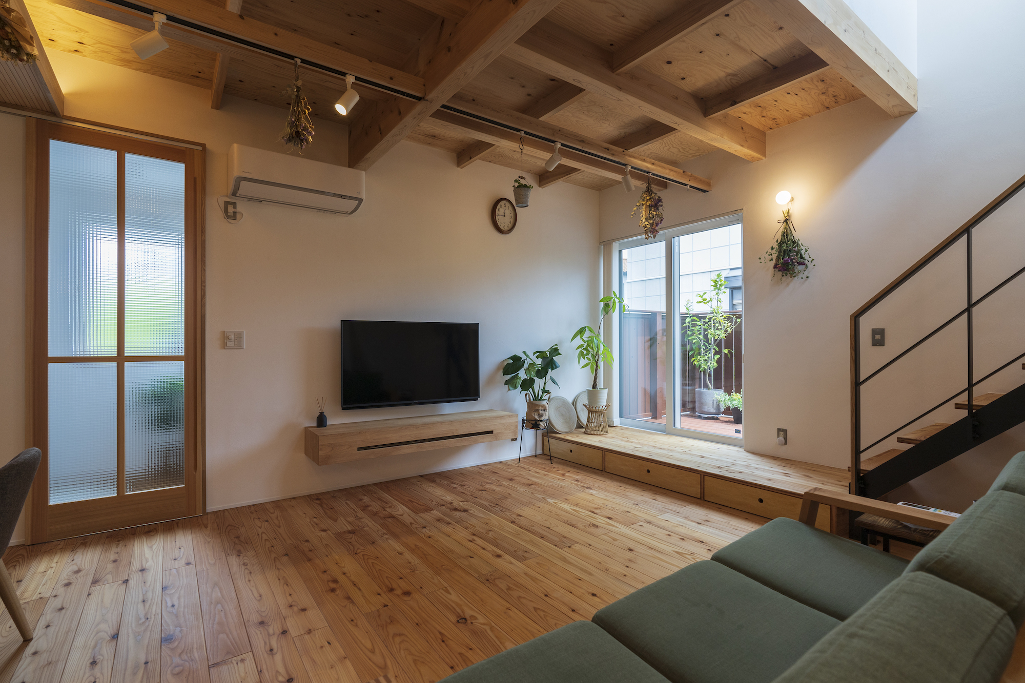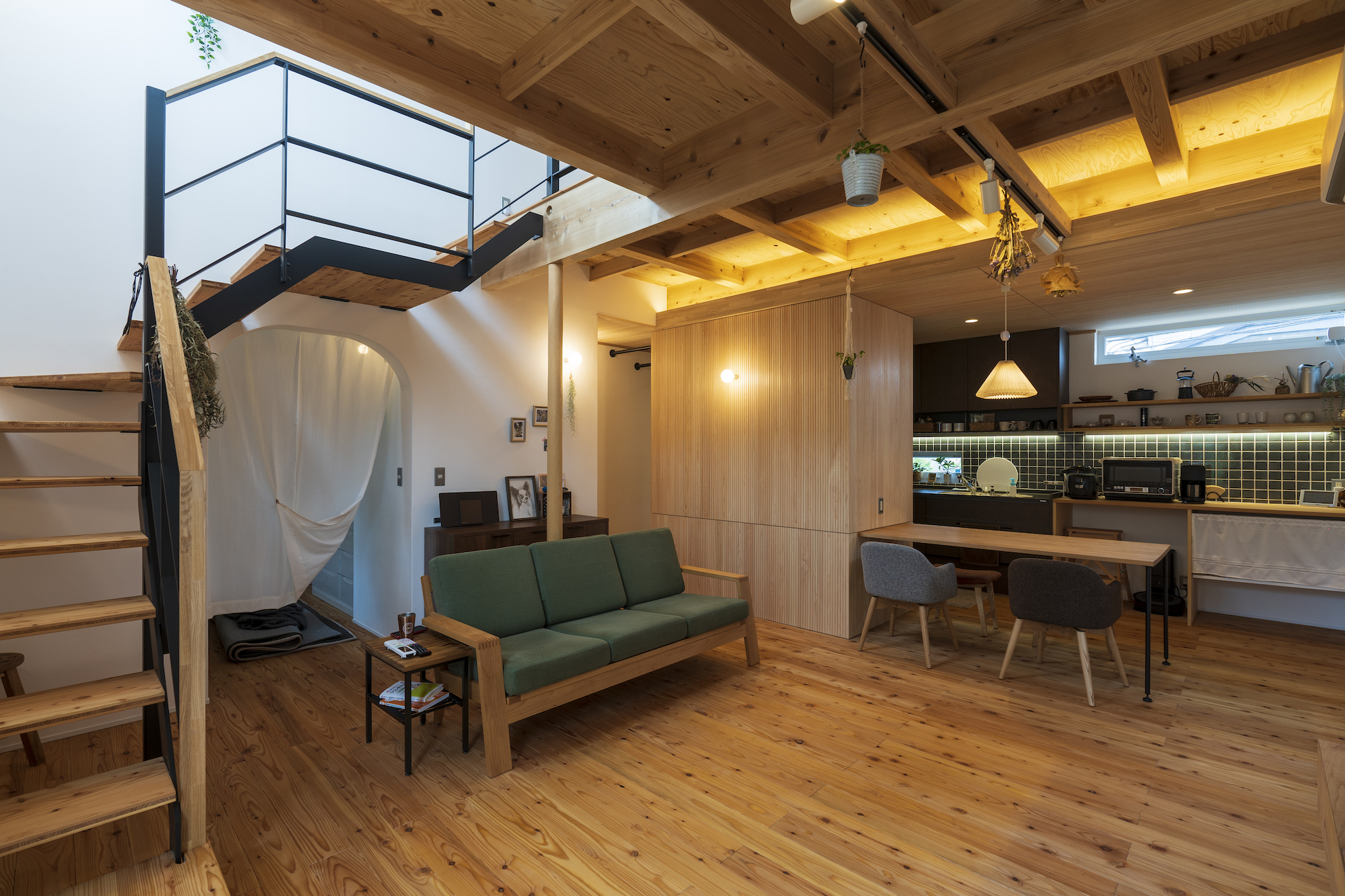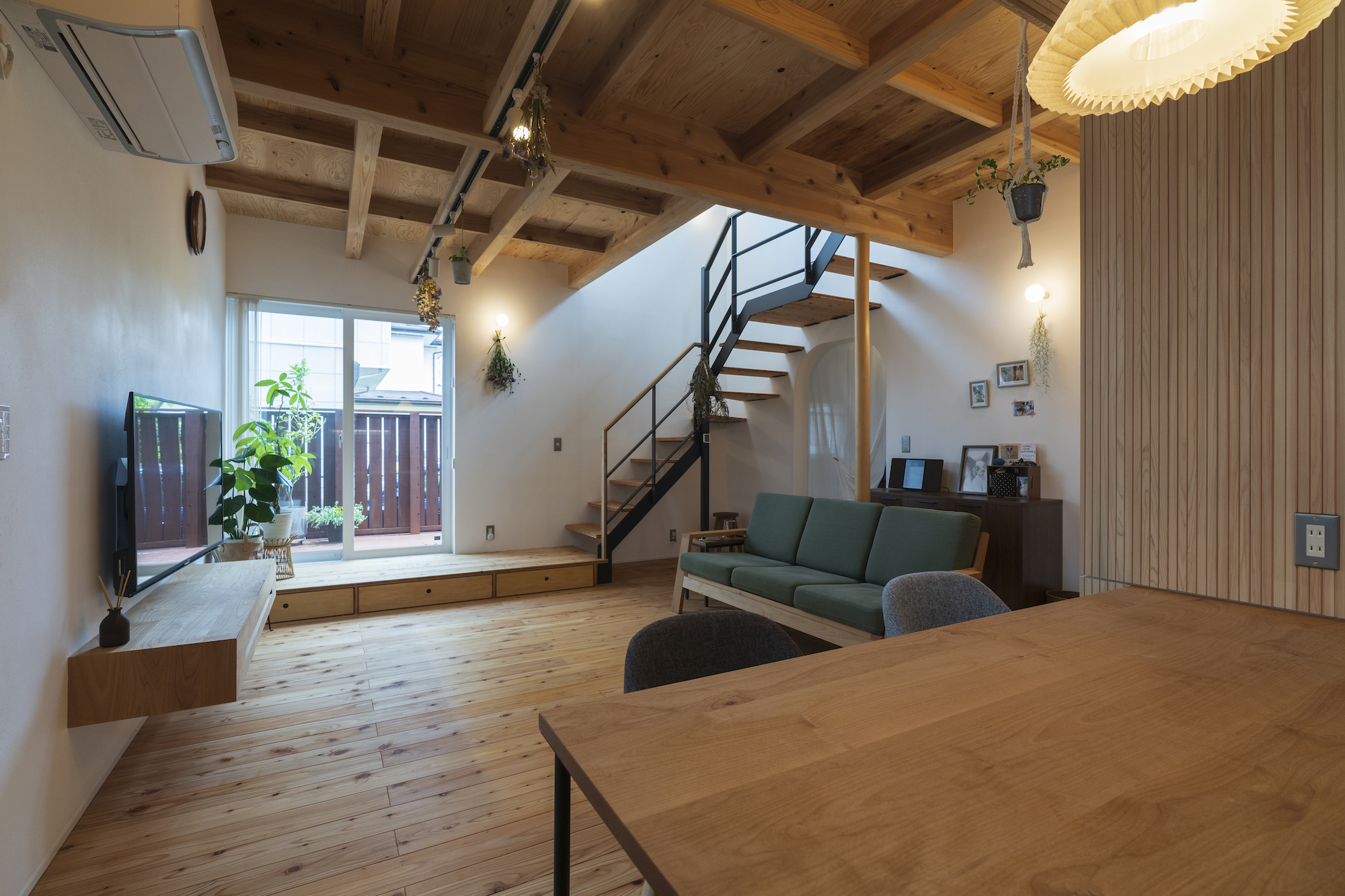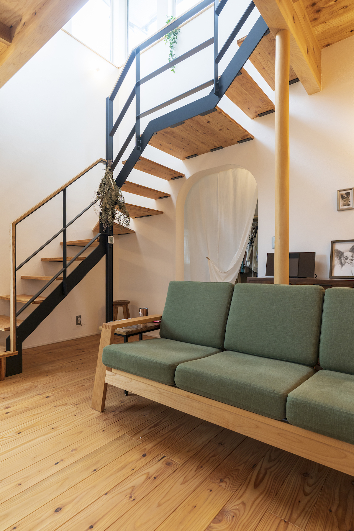 リビングには2階へと続くアイアン手摺りのスケルトン階段を設置