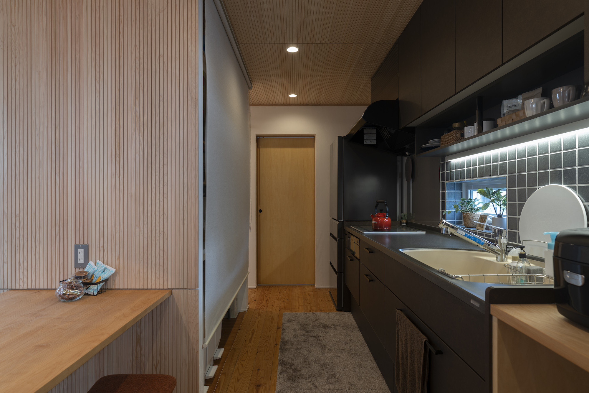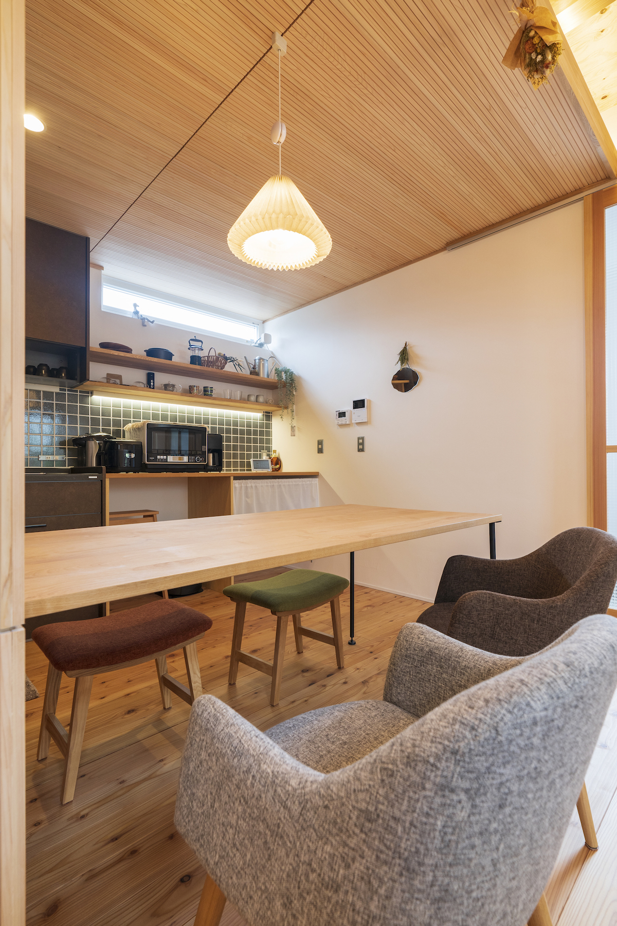細い無垢杉スリットが美しい木壁の奥は大容量のキッチン収納になっており、このキッチン収納を中心に回遊できる動線を採用した