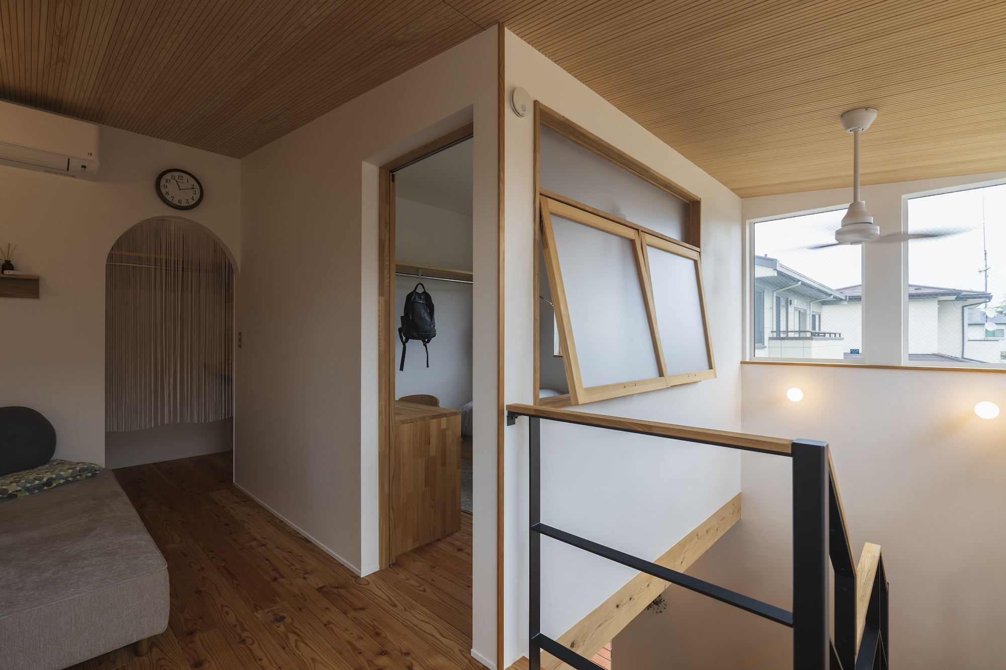 時折訪れる娘たちのために設けた子の間には横すべり窓を設置。通気だけでなく吹き抜けを介して家族がお互いに気配を感じられるよう配慮されている