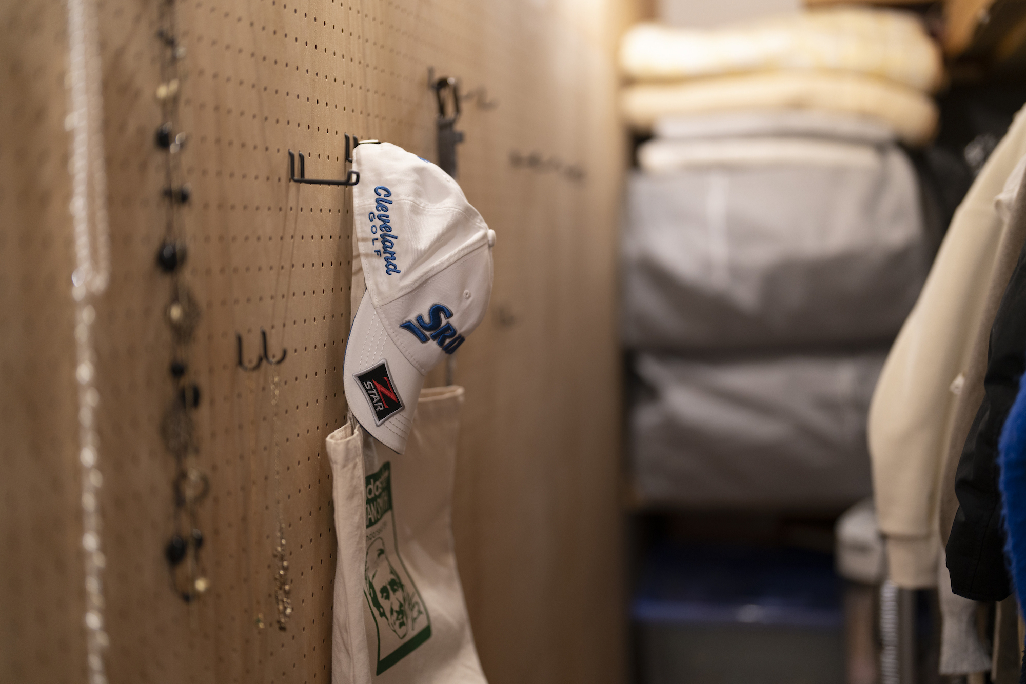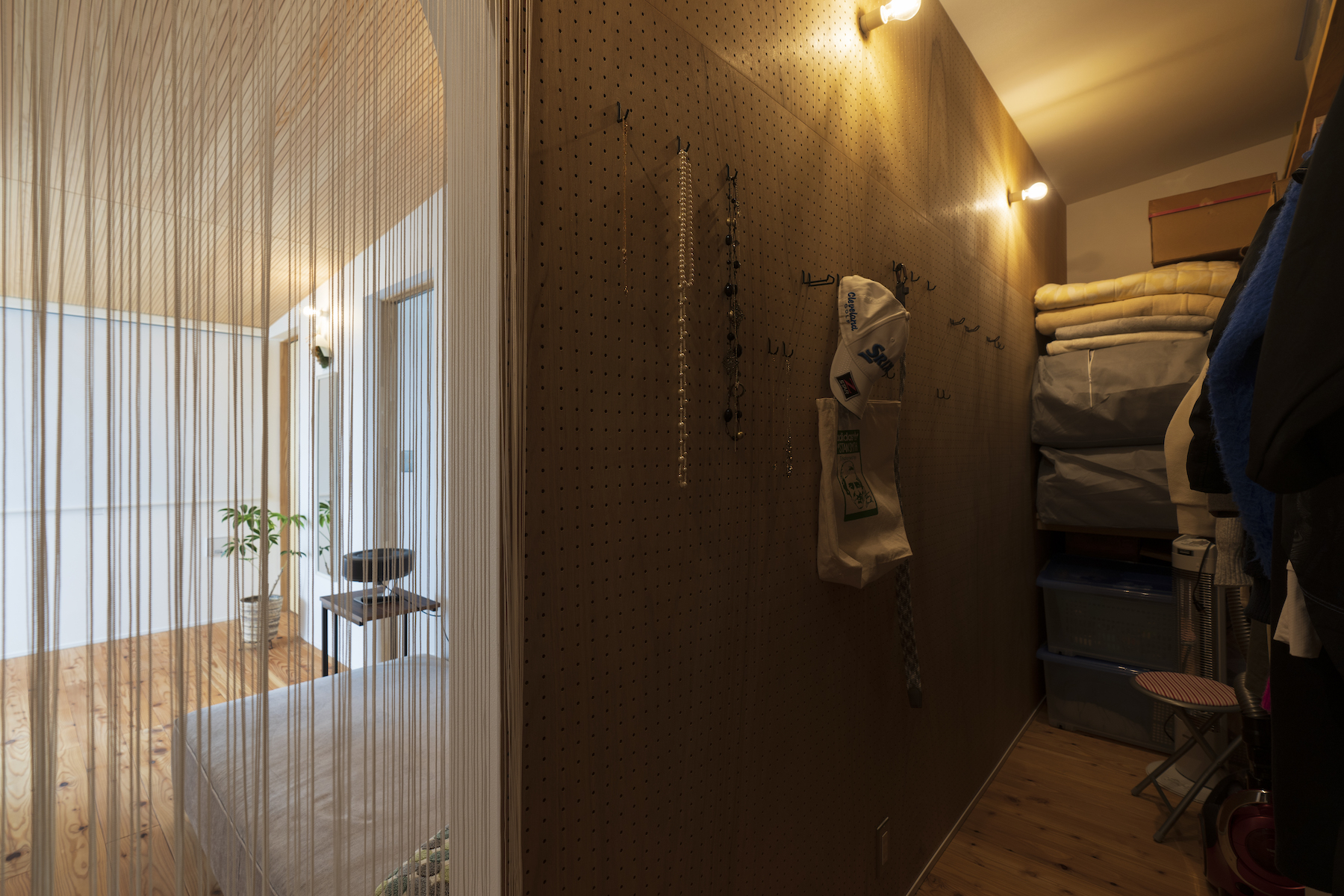 壁には有孔ボードを採用し、キャップやアクセサリーなどもオシャレに収納
