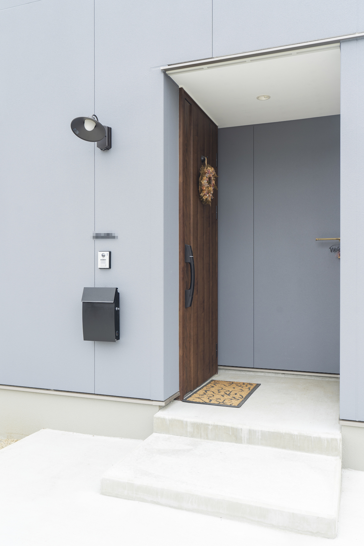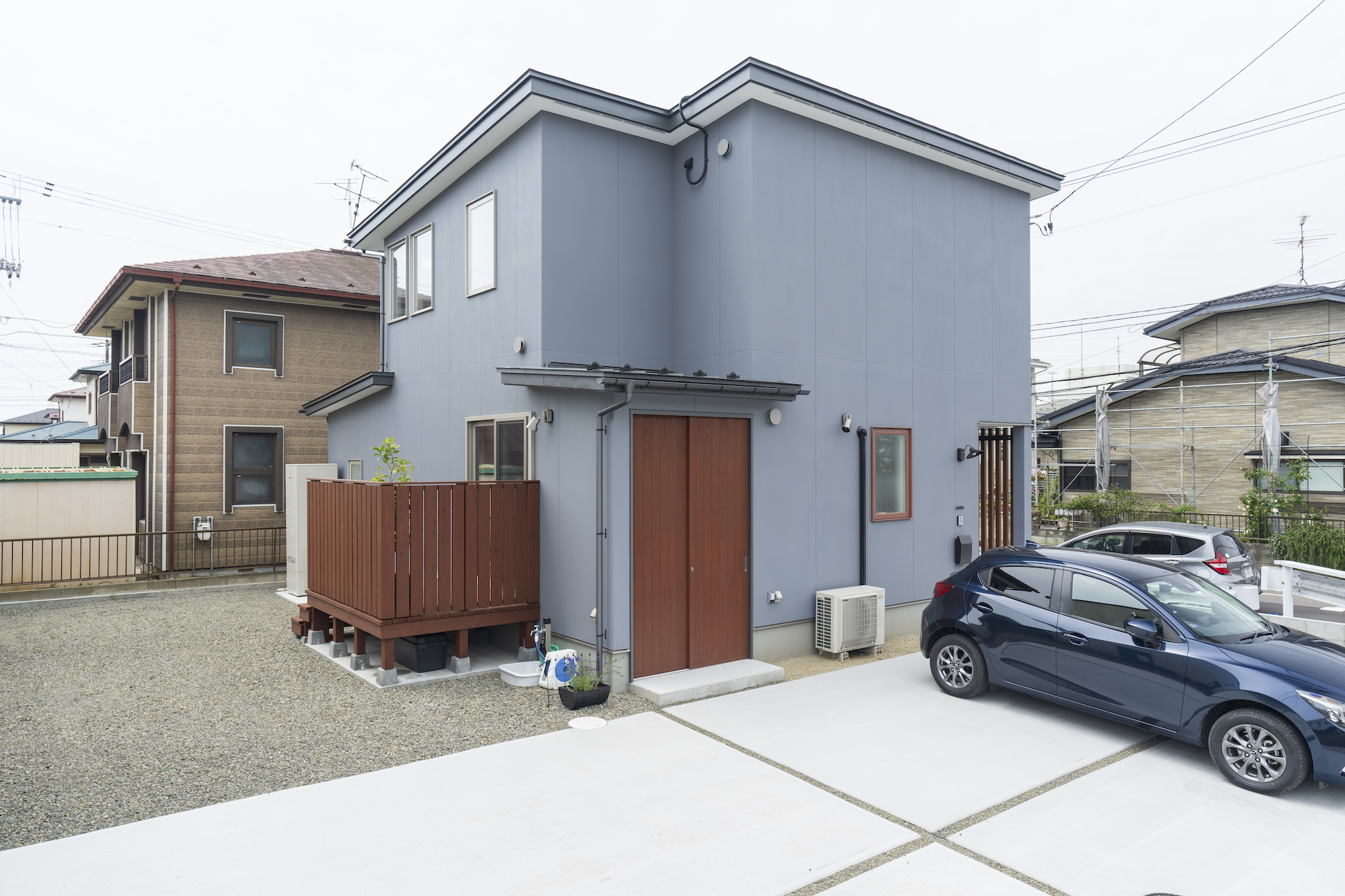 無駄を省いたシンプルな箱型の外観。建物の配置を工夫し、周囲に計5台分の駐車場スペースを設けた