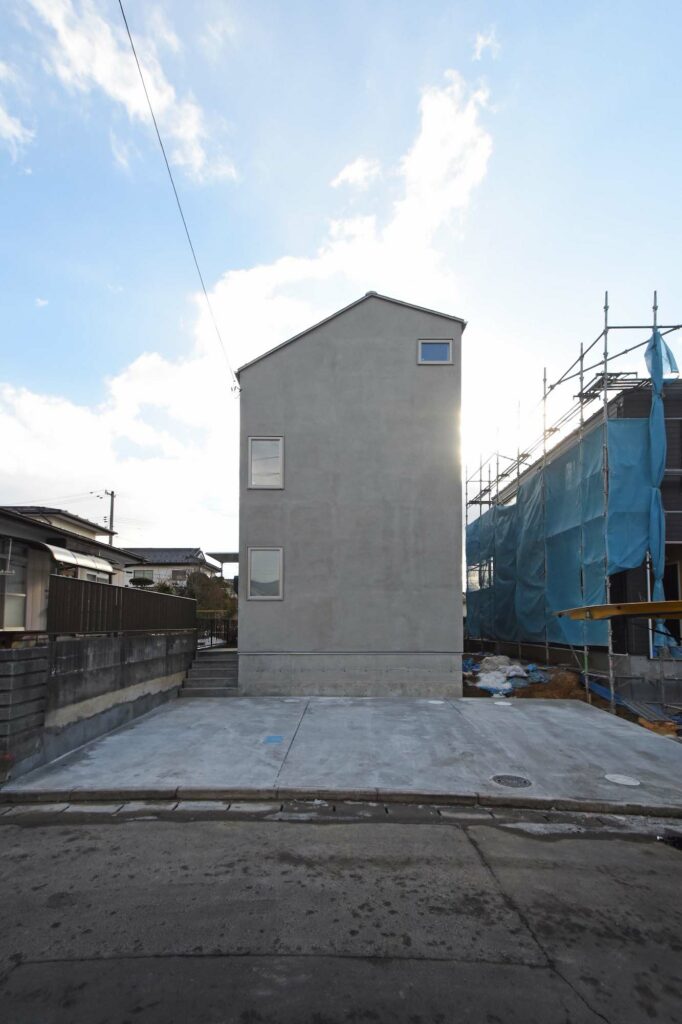 モルタルの質感の外壁と縦に延びる細長い形状が目を惹く外観