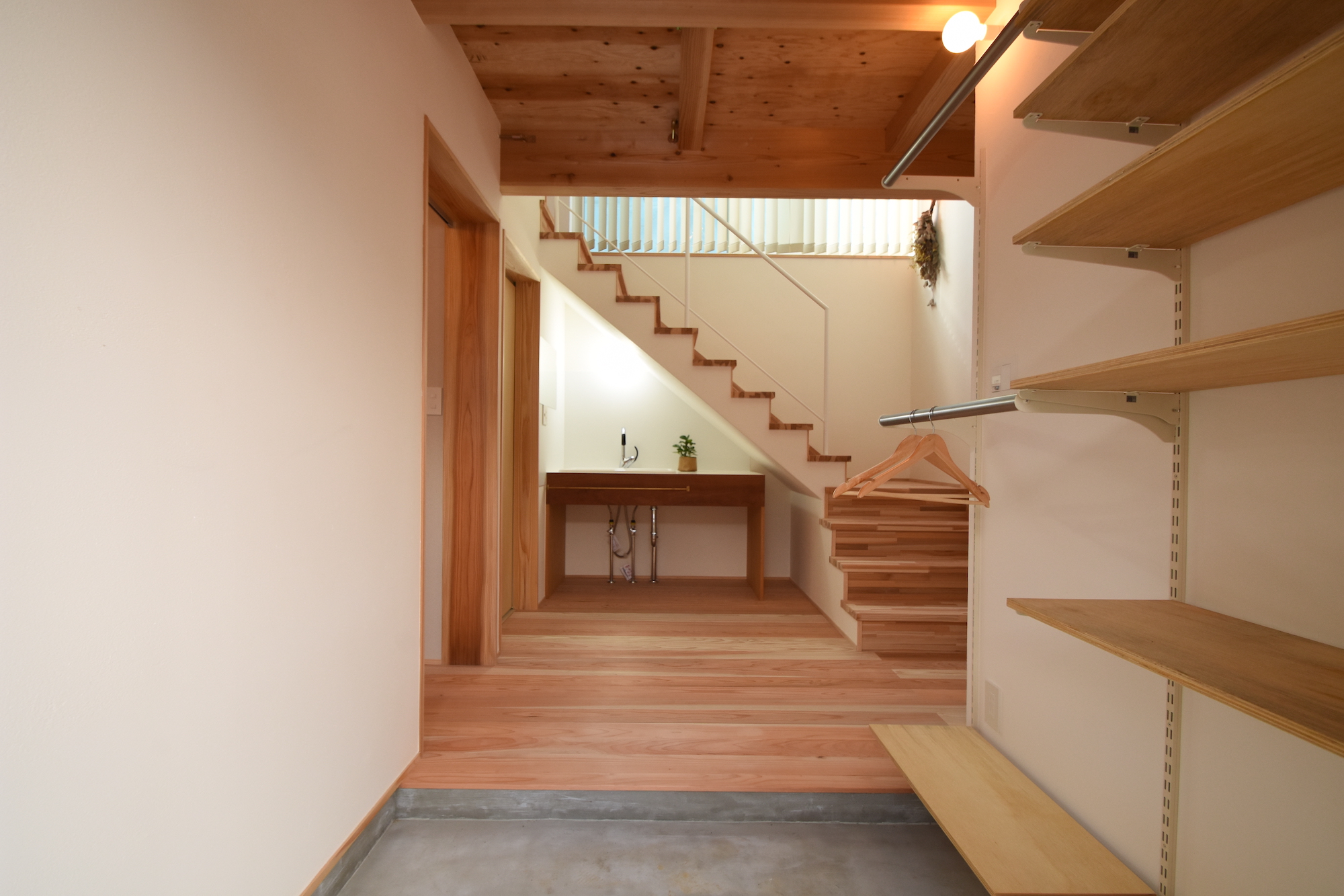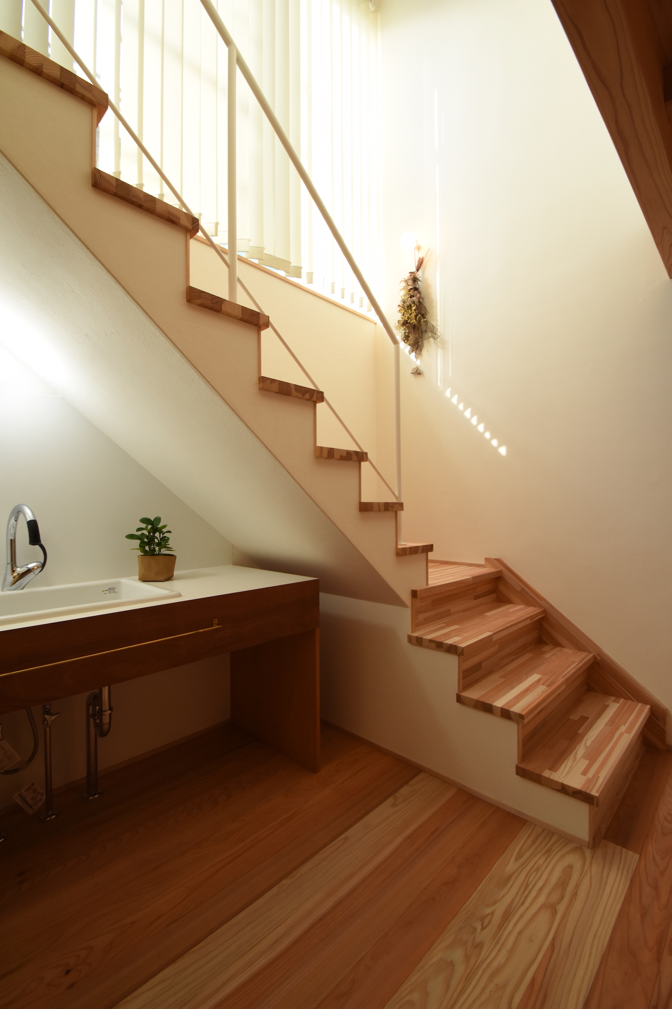 心地よい無垢の木に包まれた1階玄関ホール。階段下には手洗い場を設置