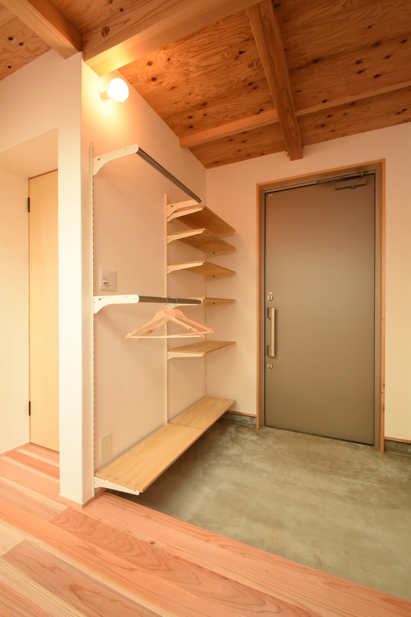玄関ドアの脇には用途に合わせて高さを変えられるシューズクロークとハンガーラックを設置した