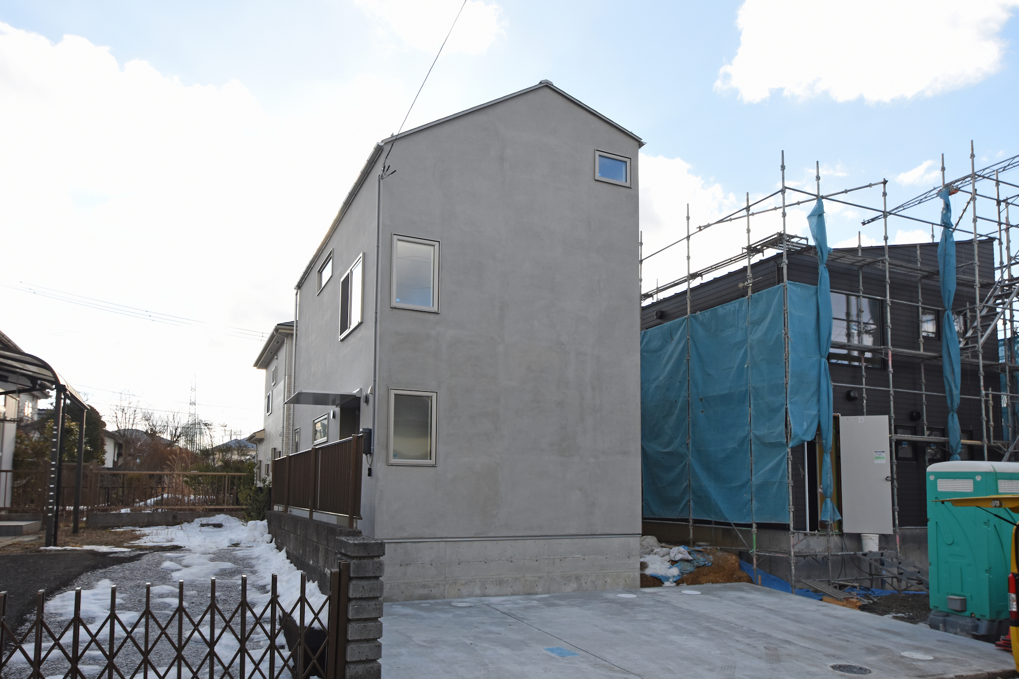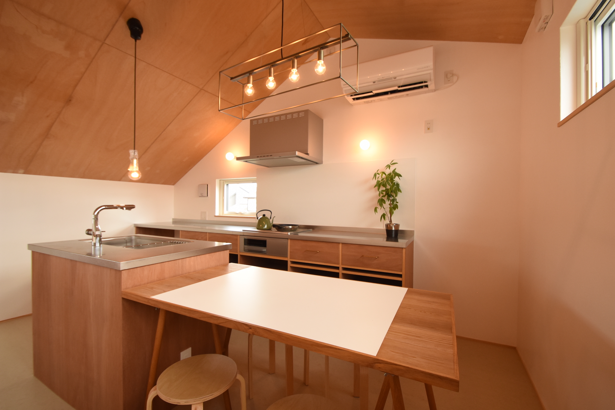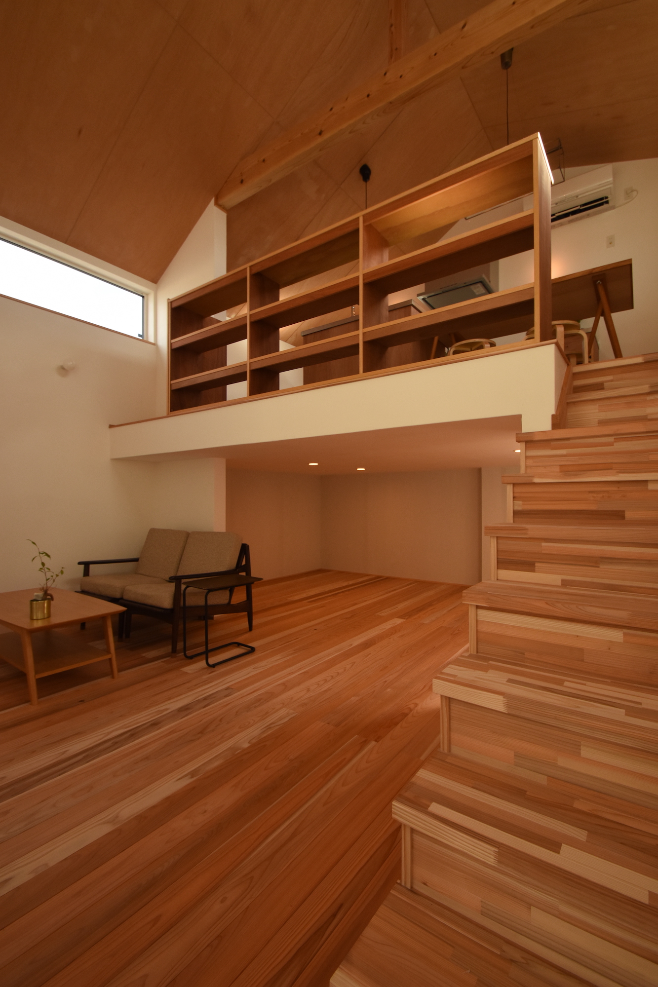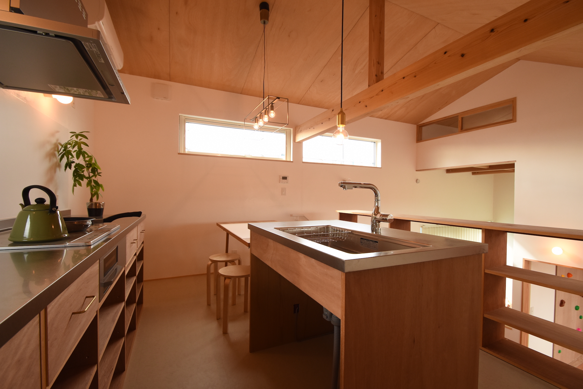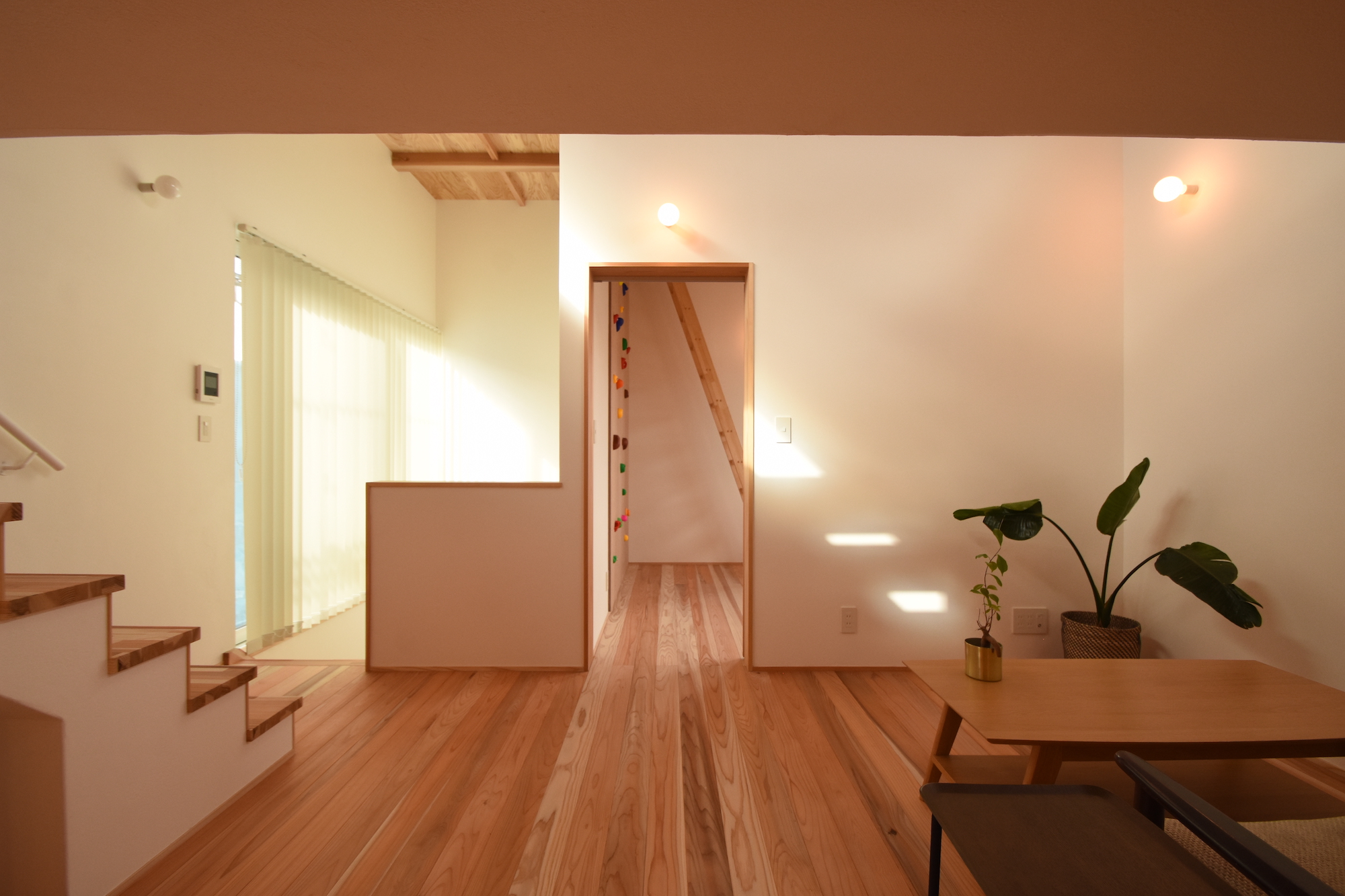 もともと建売用地だった大きな土地を3つに分割した狭小地に完成したお住まいです。利便性の高い住宅密集地であることと、将来的に南側に住宅が建つことを想定し、陽光を存分に取り込めるよう2階リビングを採用しました。また、2階の階高を上げることで外からの目線も合わないよう設計されています。空間の中に少しずつ段差を設け、その中で最も明るい場所にキッチンを配置。1階南側に洗濯室から室内物干しスペース、浴室などの水回りを集約したことで湿気を抑える効果も。その他、遠くに泉ヶ岳が望める隠れ家を思わせるロフトも見どころです。
