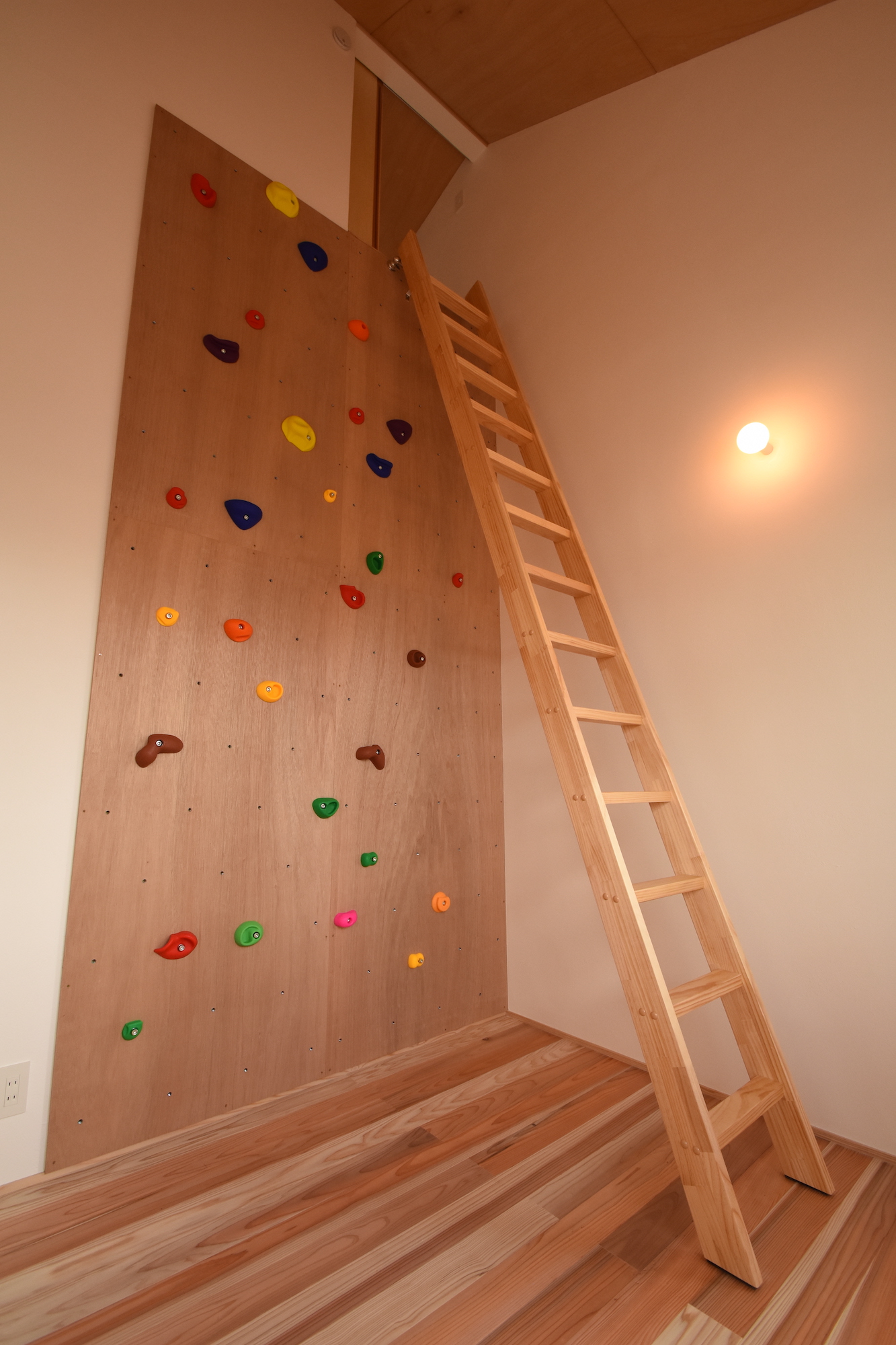 子ども部屋の壁にはボルダリングウォールを設置。上った先には、まるで秘密基地を思わせるロフトを配した