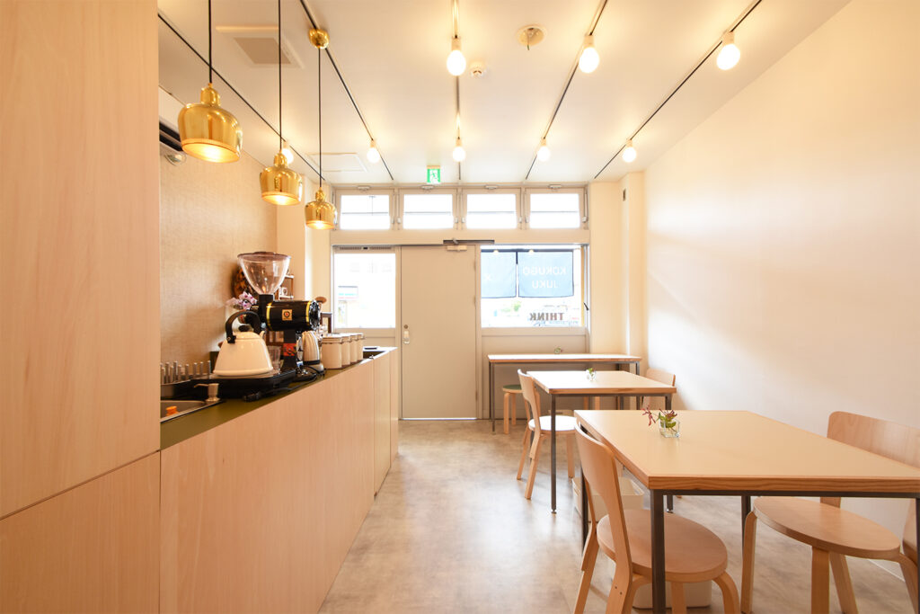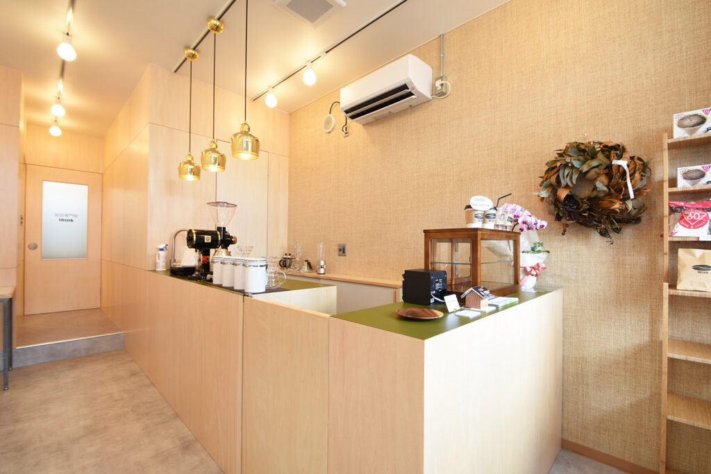 空き店舗をリノベーションし、奥さんが営むカフェ、ご主人が営む国語専門塾を併設しました。室内はご夫婦の好みに合わせナチュラルテイストに。空間分割(ゾーニング)は人の動線などを考慮し、塾を奥側に配置しています。カフェスペースのキッチンはシナ合板で仕上げ、テーブルも木で造作。店内では焙煎コーヒーとマフィンを中心においしいおやつを提供しており、全8席のコンパクトなお店ながら、明るい色合いの内装もあいまって居心地の良い空間となっています。