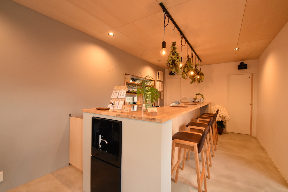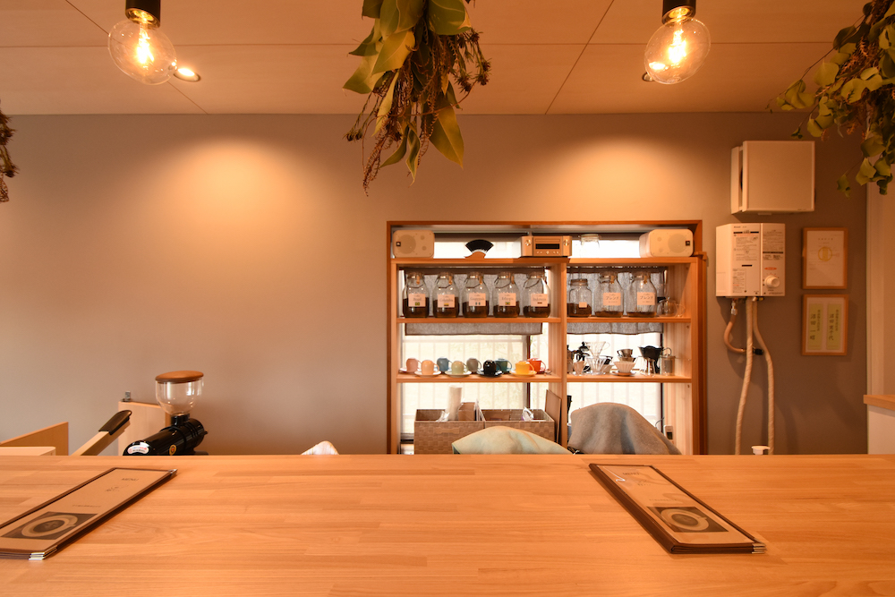閑静な住宅街にあるカフェ・コーヒー専門店。以前、書道教室だった1階部分をリノベーションしてオープンしました。住居のプライバシーに配慮し、お店と住居の間には木柵を設置。内部は和室でしたが、白を基調に上品で洗練された内装に一新しました。床はモルタル、壁・天井は塗り壁仕様とし、キッチン側にはグレーを取り入れてメリハリと清潔感、落ち着いた雰囲気をプラス。光の当たり方や見る角度によって優しい陰影が生み出されるのも魅力です。