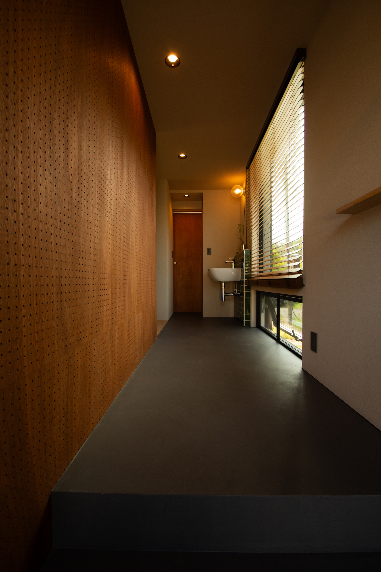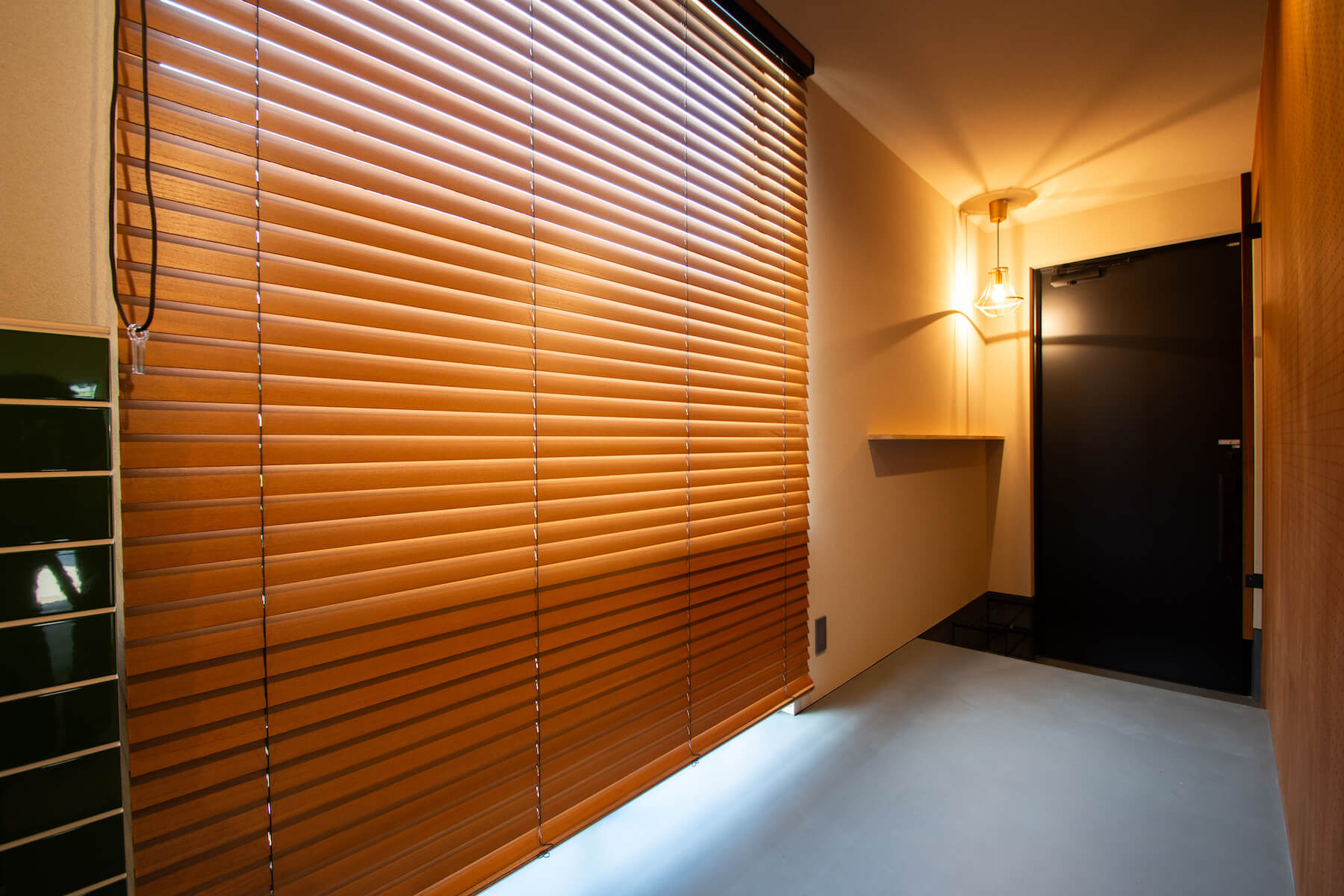 玄関ホール。大きなFIX窓に設置した木製ブラインドから柔らかな光が差し込む