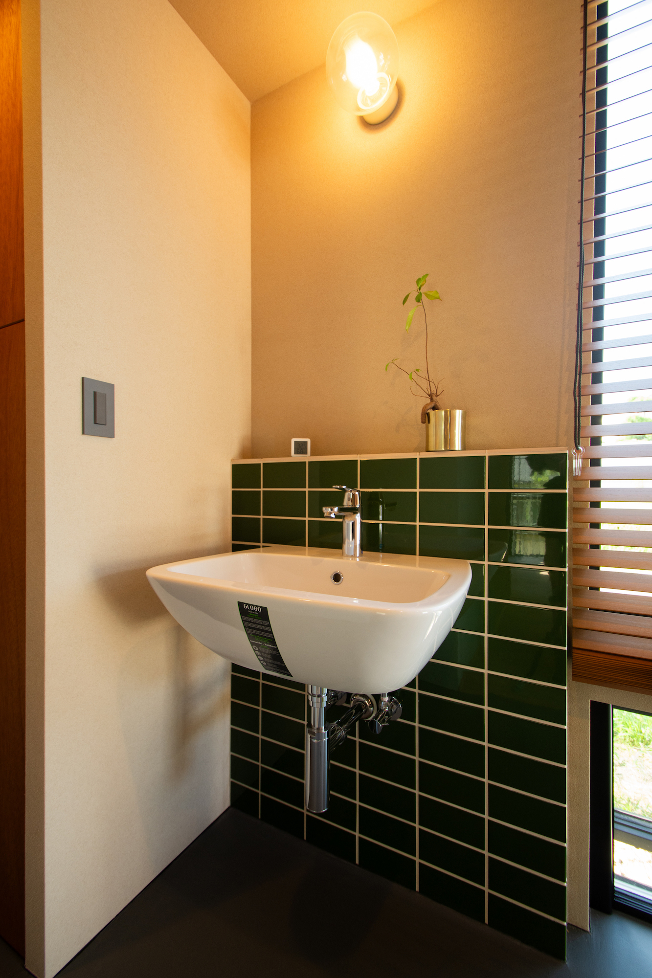 玄関ホールを進んだ先にはグリーンのタイルで遇らった手洗い場を設置