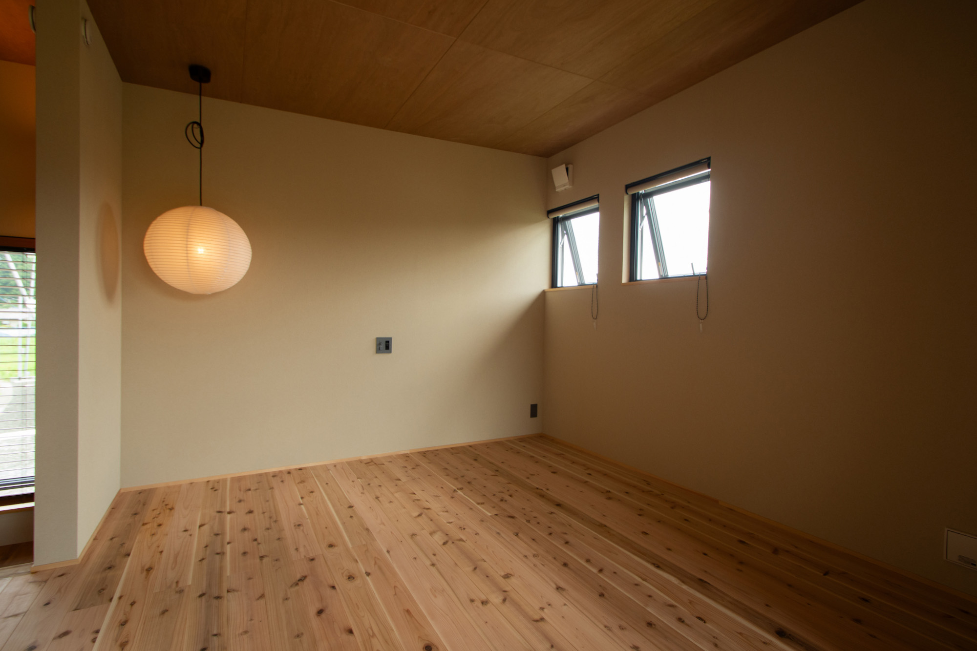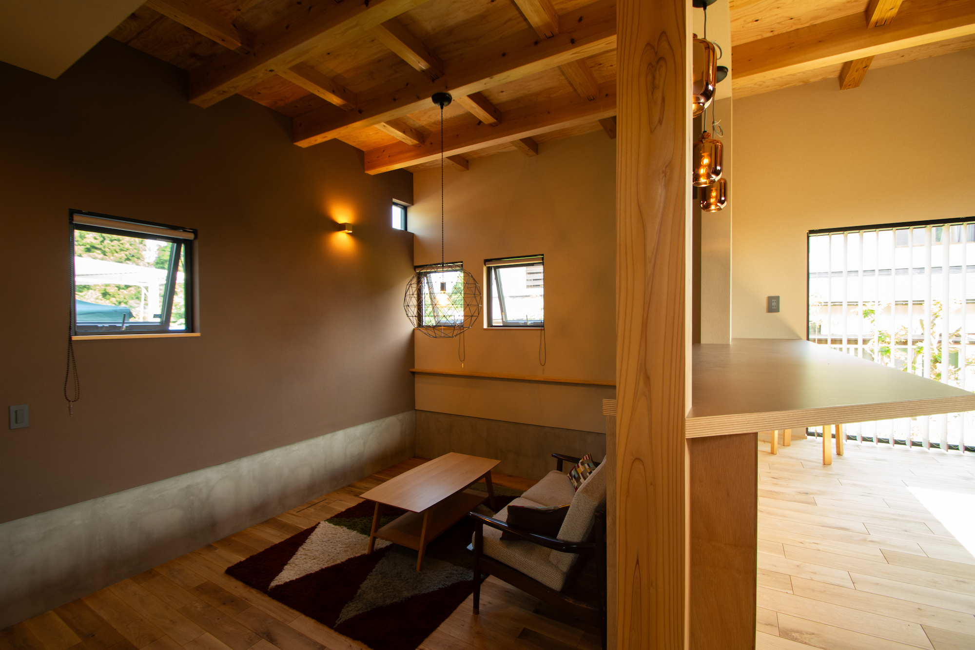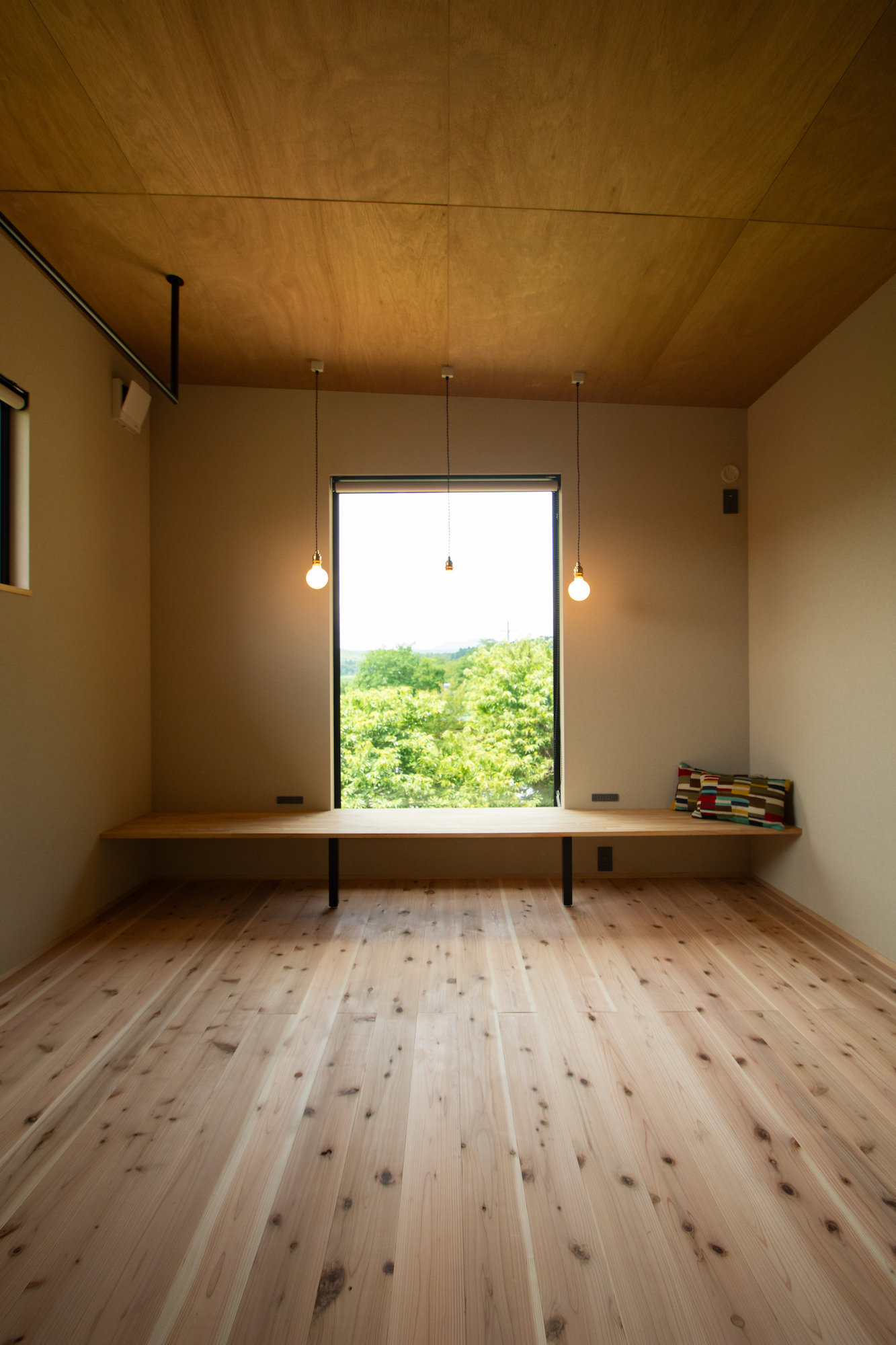 2階フリースペース。大きなFIX窓からは外の景色をまるで切り取られた絵画のように楽しめる
