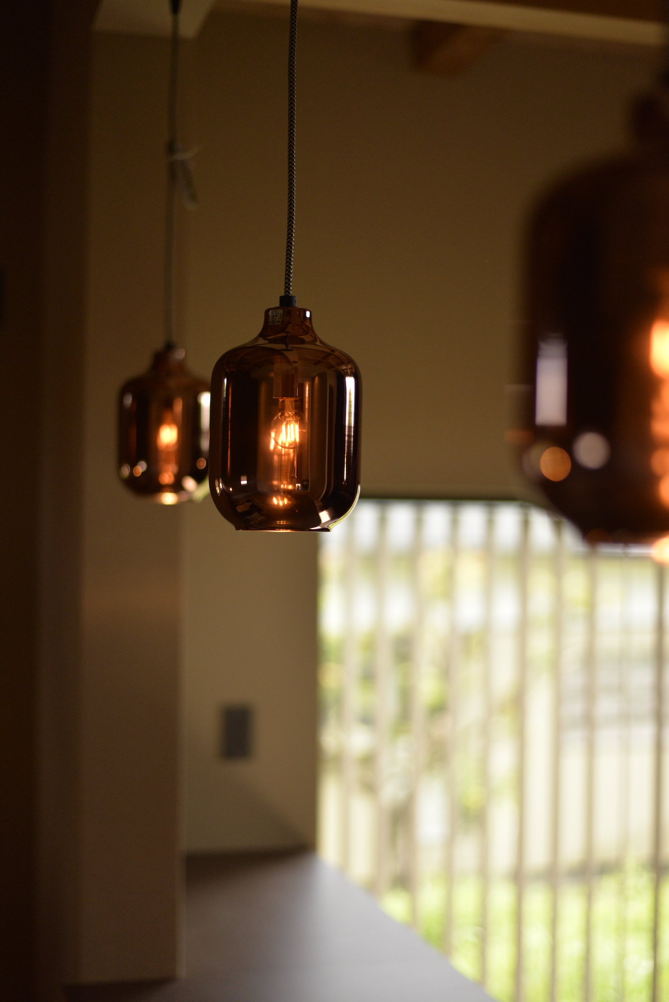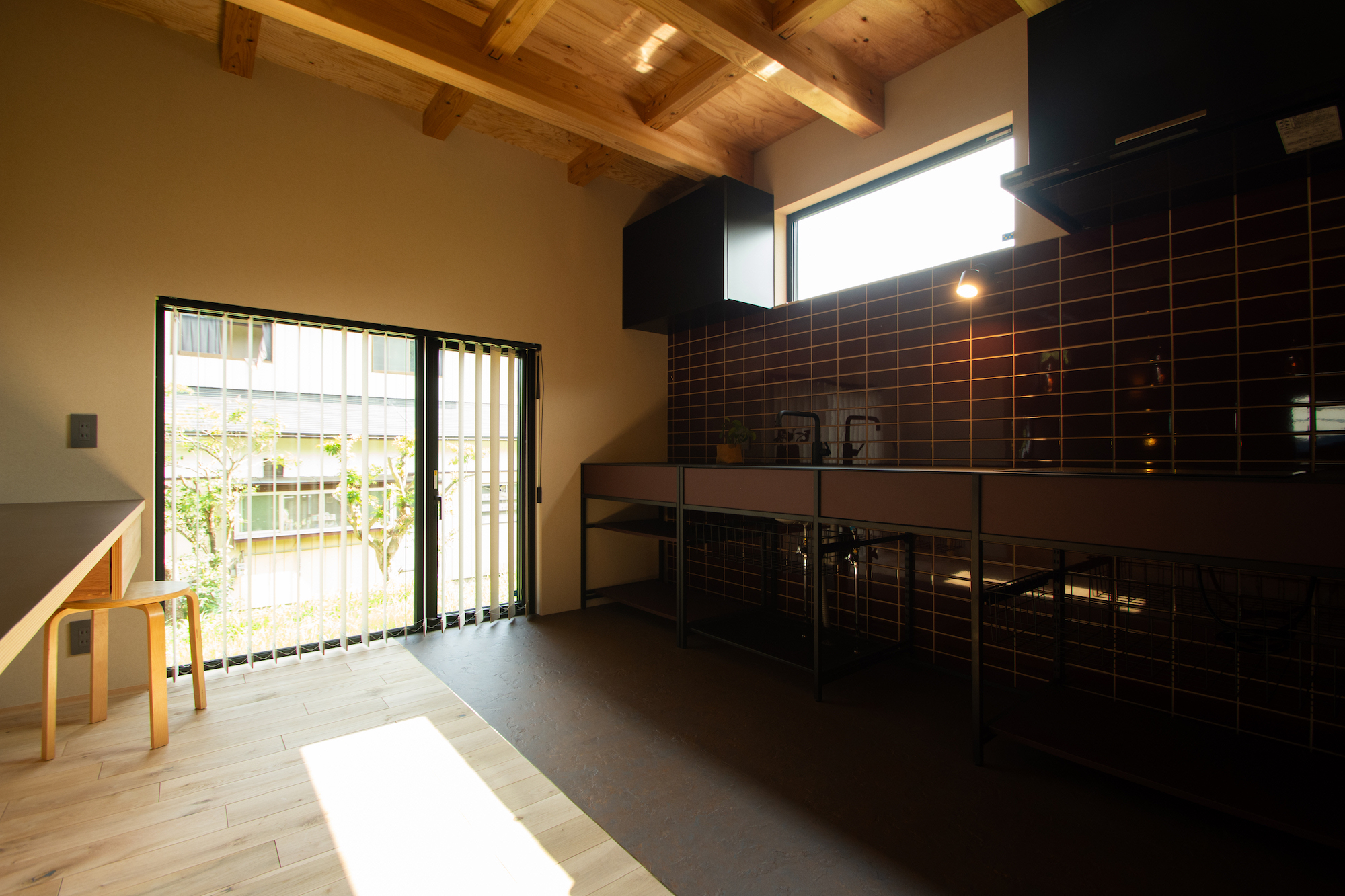 キッチンは壁付タイプを採用。深みのあるブラウンのキッチンタイルが印象的