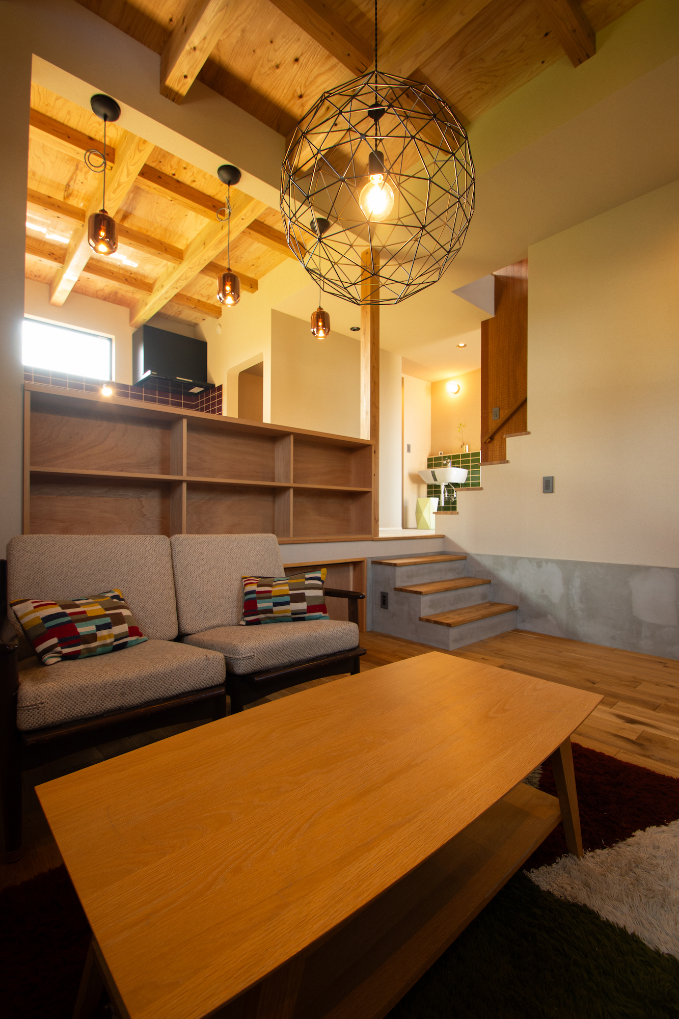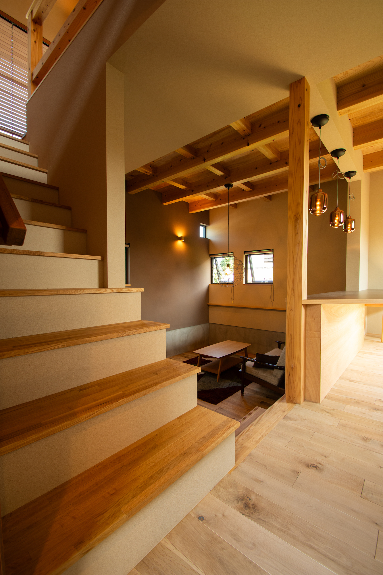 階段脇に配した一段下がったダウンリビングフロア。写真右側はダイニングキッチンスペース