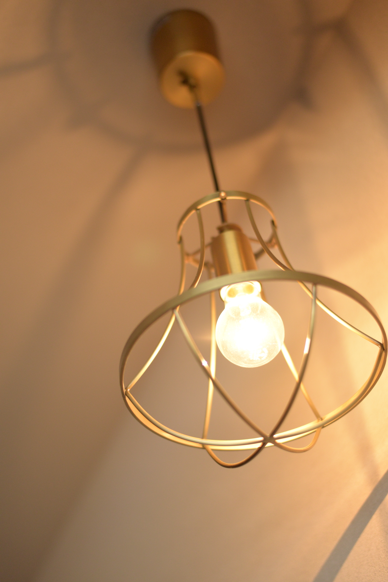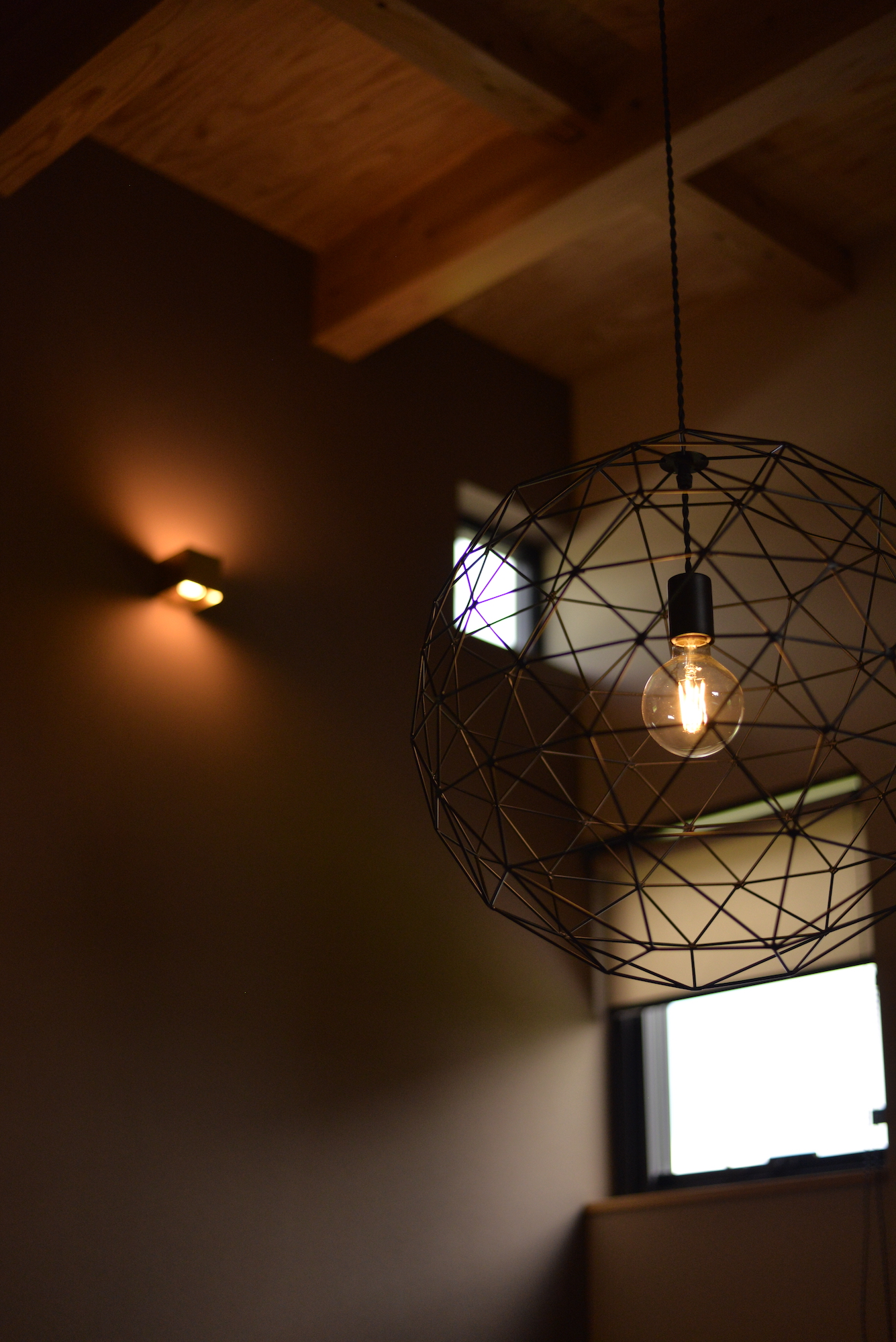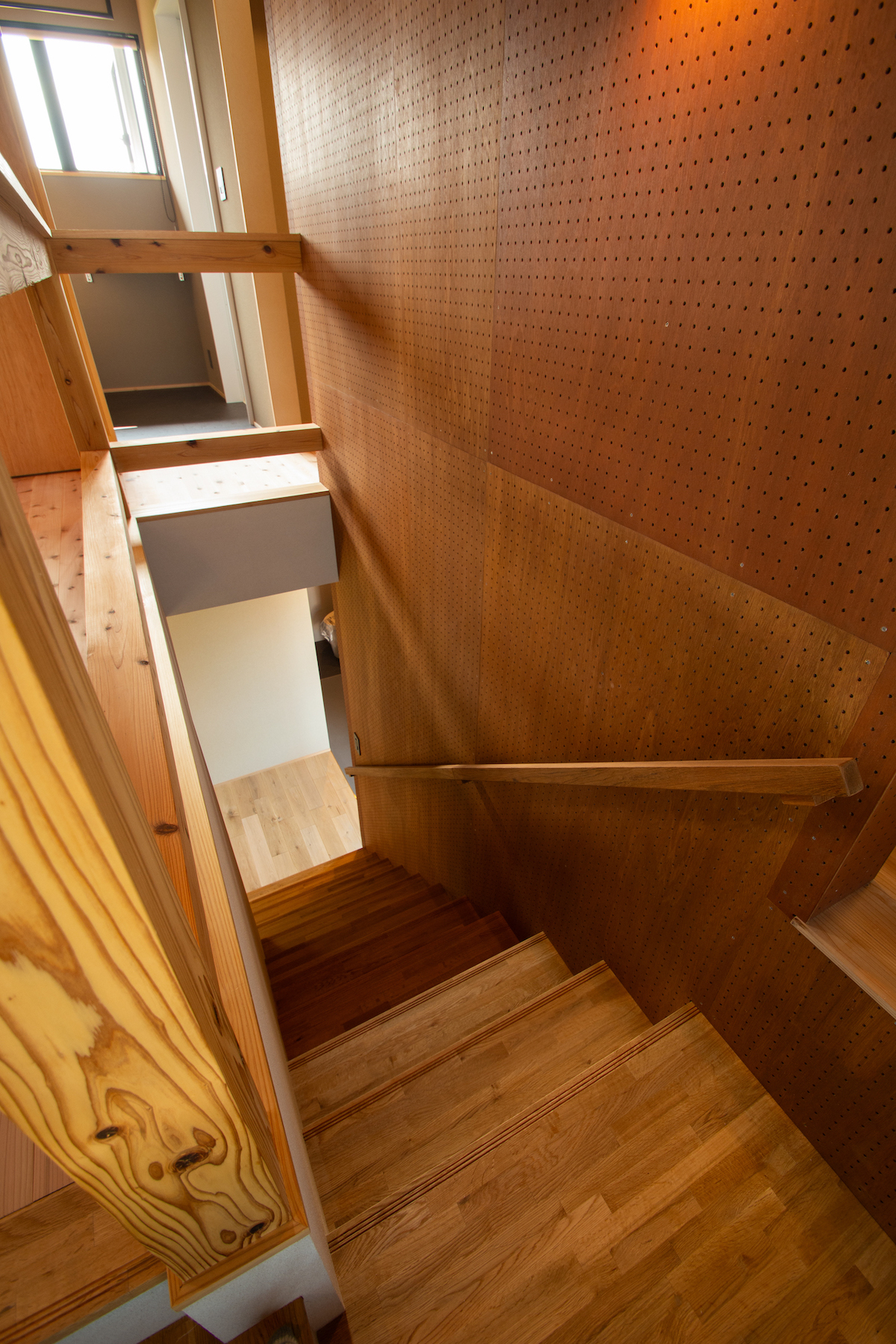 階段の壁面にもフックや棚を設置することでおしゃれに収納できる有効ボードを採用