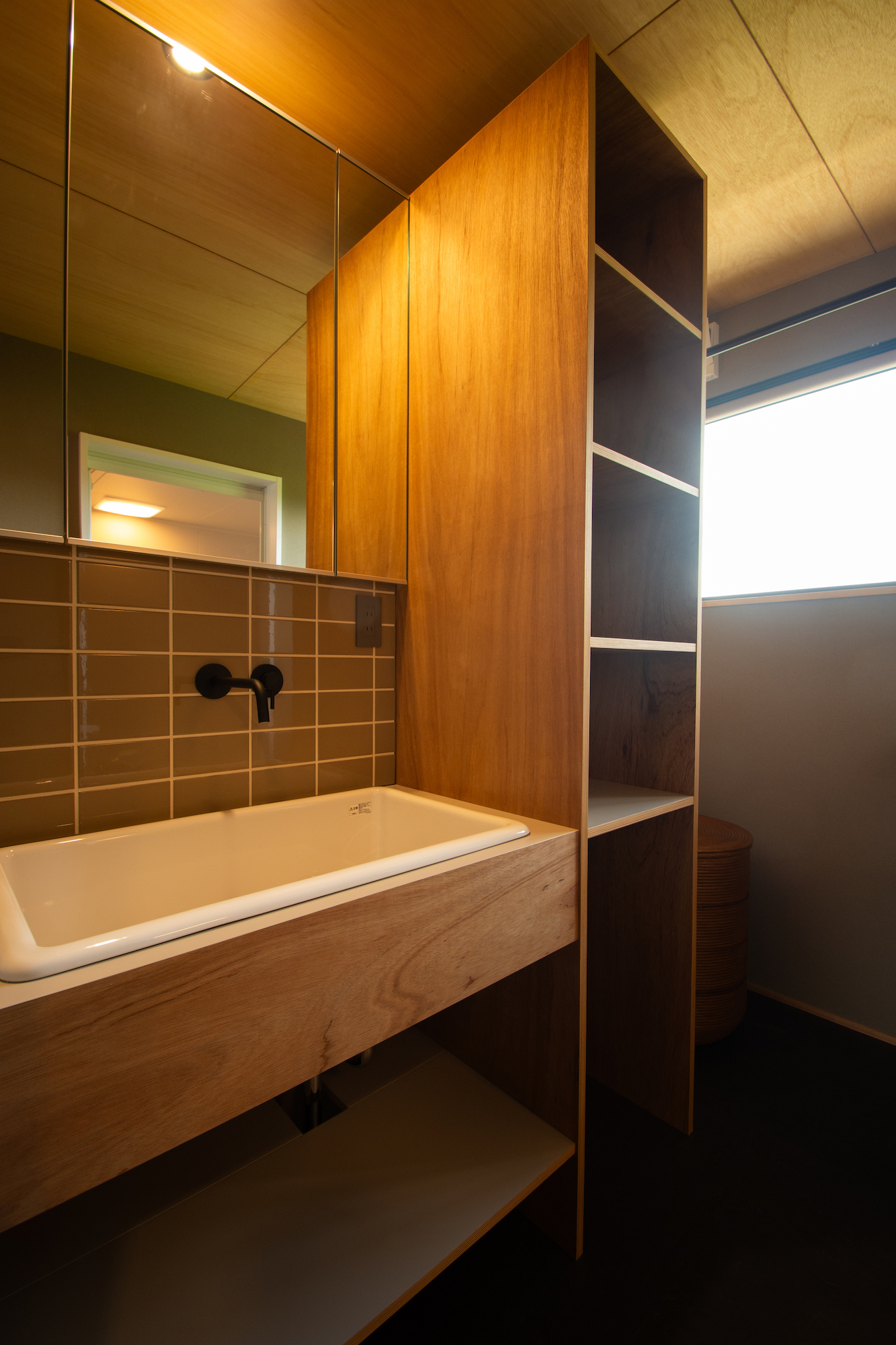 洗面脱衣室の洗面台は使い勝手の良い幅広タイプを採用。収納力の高い造作棚も設置した