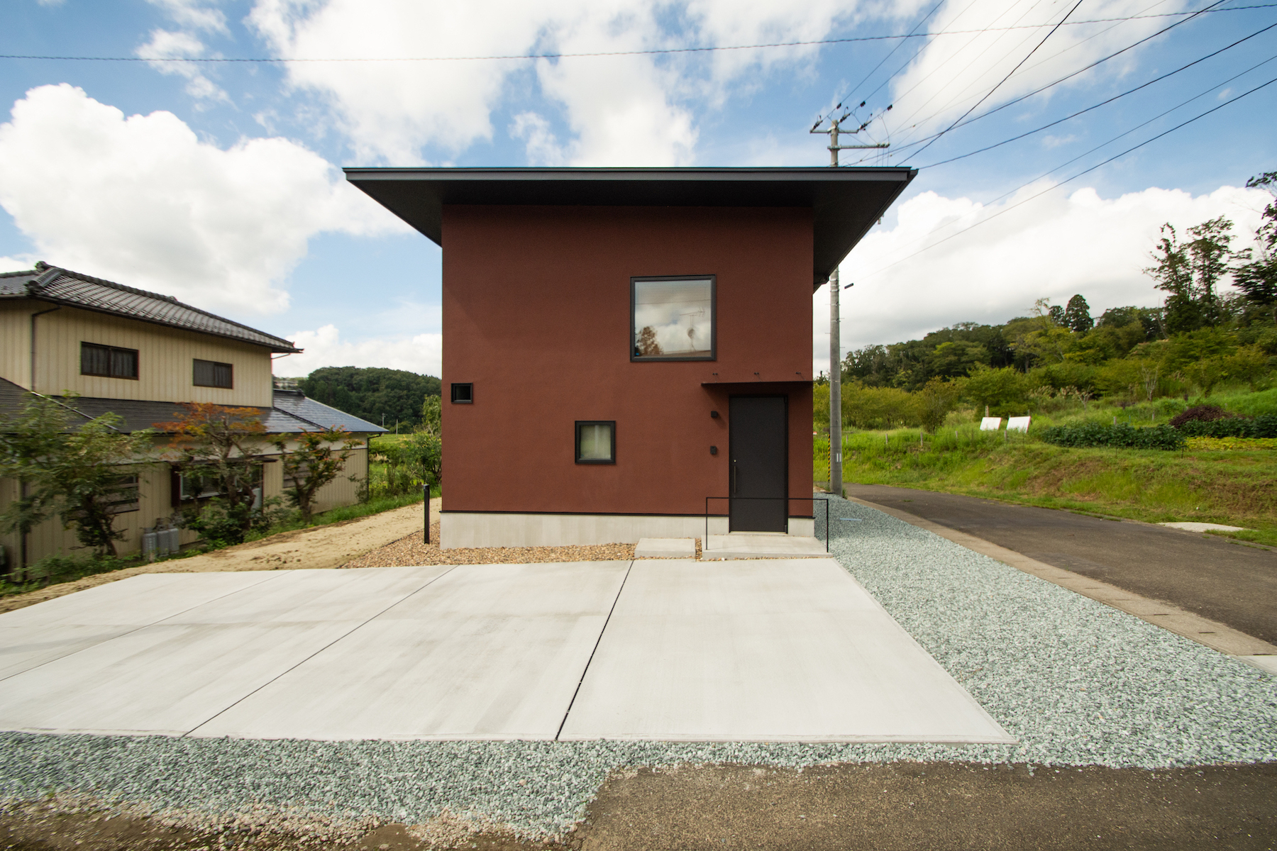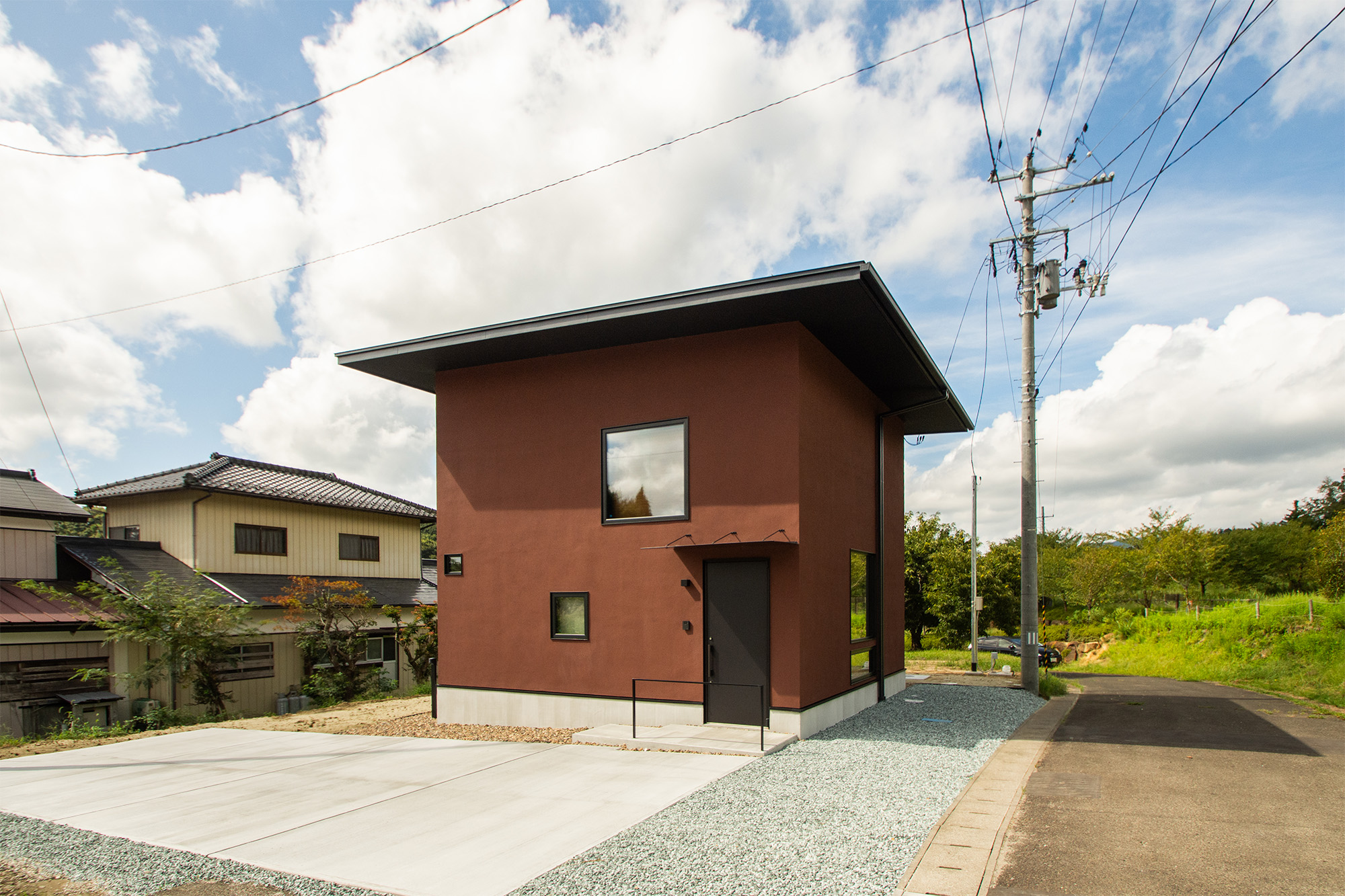 外壁のバーガンディーカラーが周囲の緑によく映えるシンプルな箱型の外観