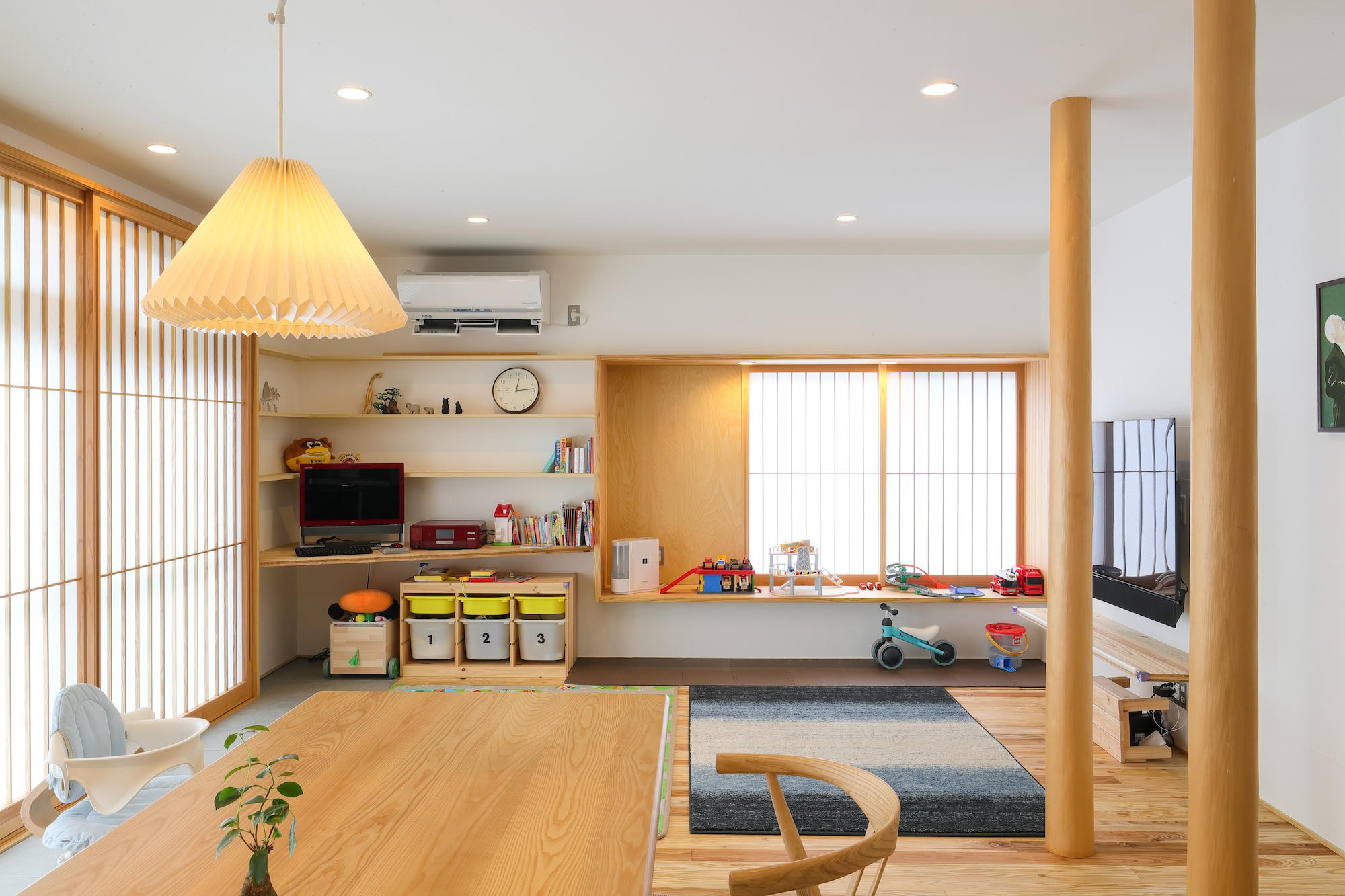 ダイニングと続き間のリビングルーム。子どもの成長とともに建物の経年変化を楽しめるのも無垢材の良さ。子どもが遊びまわって付けた傷や落書きも家の歴史に感じられる