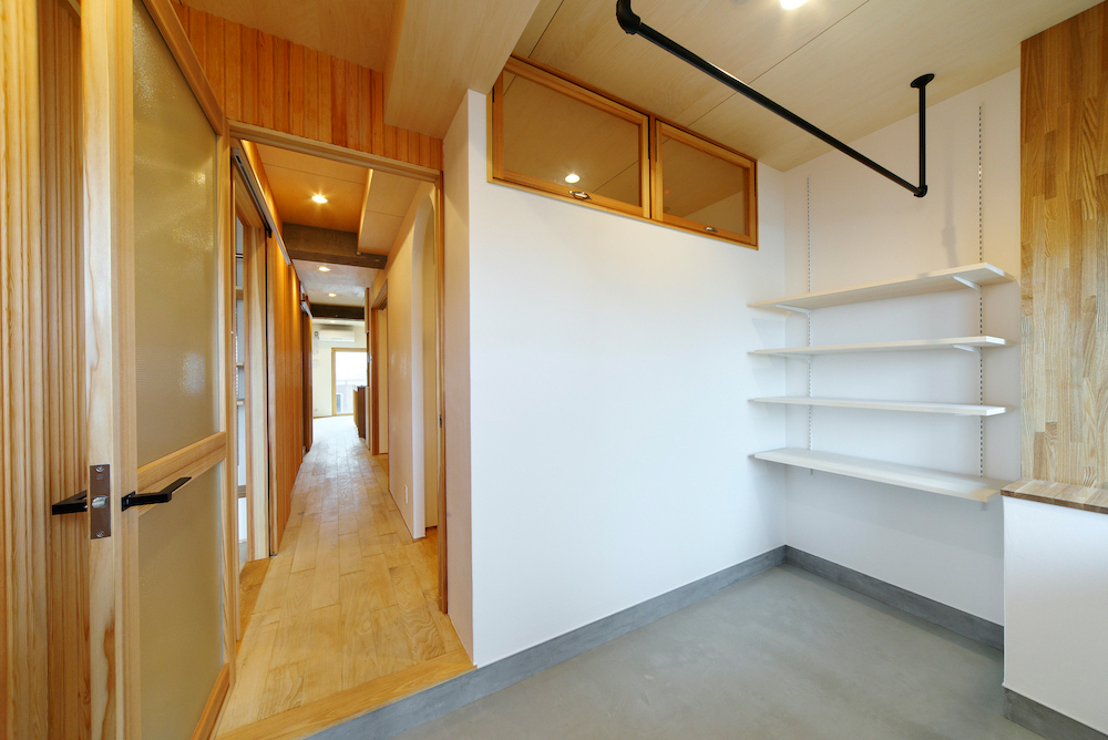 ハンガーラックや棚を造作した多様性のある玄関土間。上部に設けた風通しの窓も心地よい住環境を演出