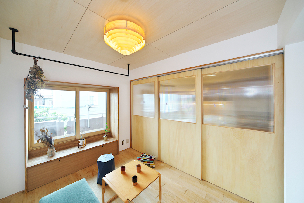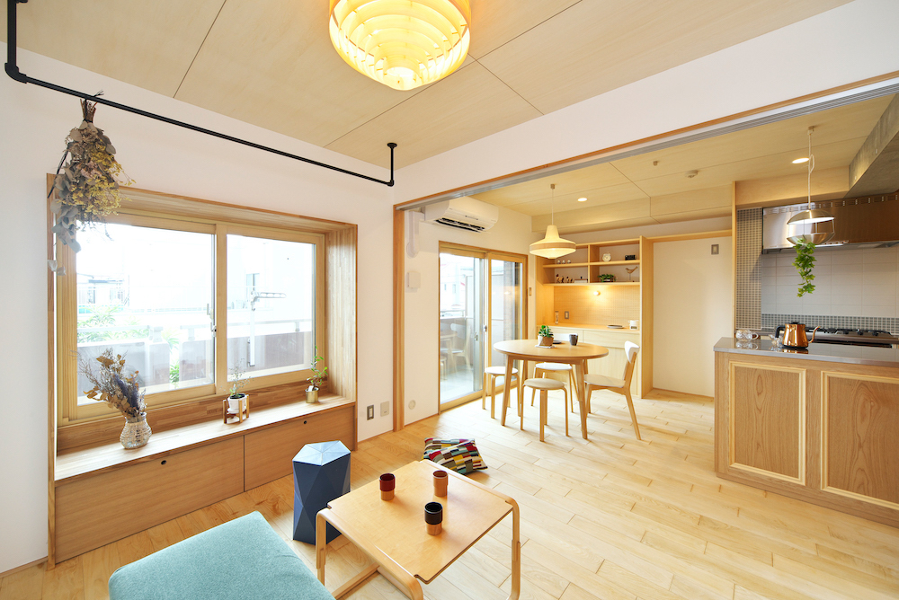 元の間取りは各部屋の壁に分断されており、光も風も通りにくいという難点があったため、間仕切りを減らし、上部に窓を設ける工夫を施しています。キッチンとダイニングの間も壁をなくし、ひと続きのLDKとすることで、家族のコミュニケーションが深まる空間を実現しました。