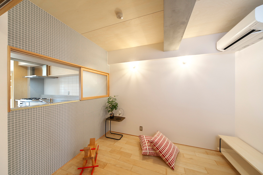 間の壁をなくし大空間のワンルームとなったLDK。「コペンハーゲンリブ」の壁がアクセントに