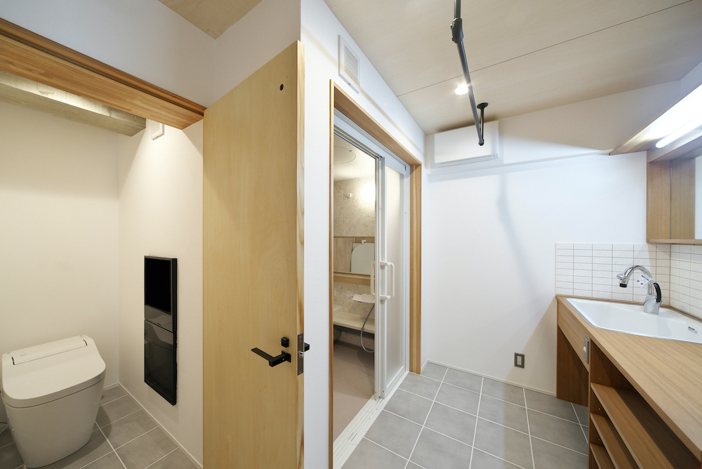 位置を変更し、室内干しスペースとしても十分な広さを確保した洗面脱衣室。造作の洗面台は使い勝手の良さも抜群