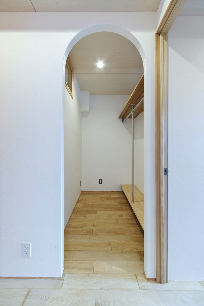 家族の衣類を収納するウォークインクローゼット。入り口にアールの垂れ壁を採用し、空間を緩やかに仕切っている