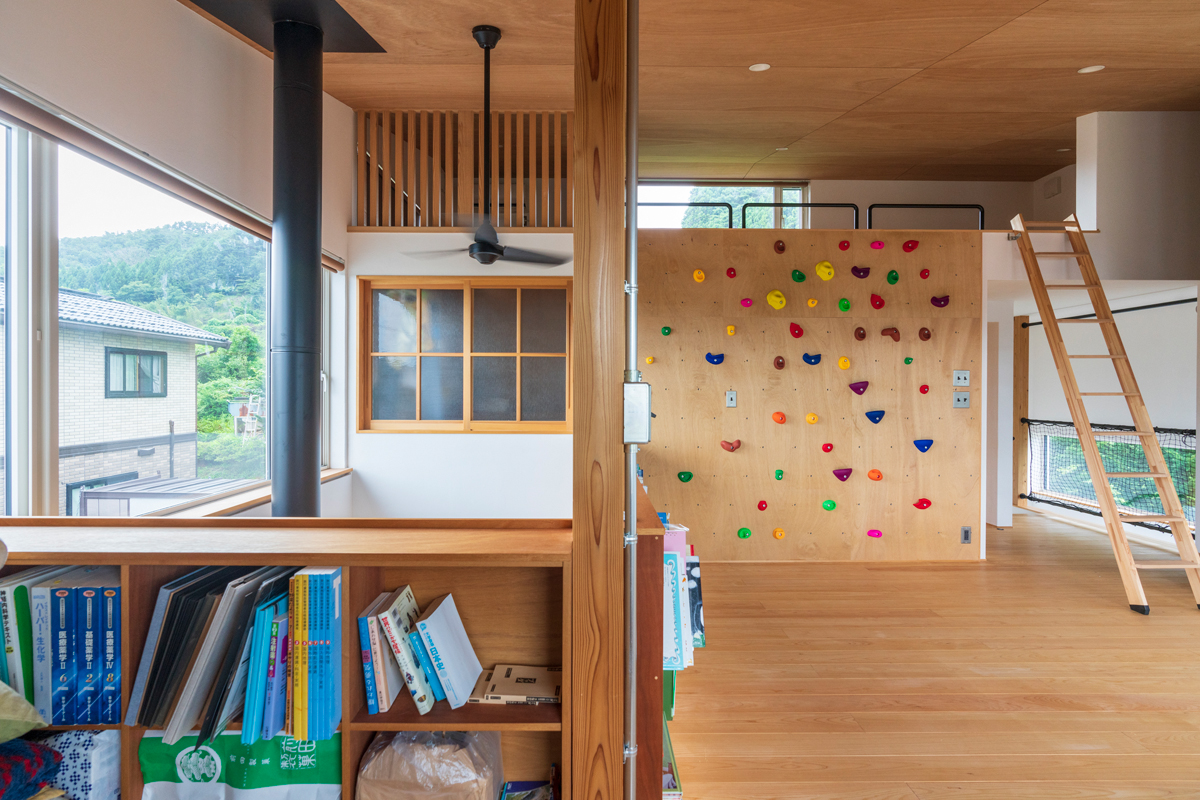 リビングは1階の中心に置き、その周りに水まわりを配置。2階には主寝室や広々としたフリースペースをレイアウトしました。フリースペースの東面の大窓からは太平洋を見渡すことができ、開放感満点。ロフトに続く壁面にはお子さんたちが体を使って遊べるボルダリングボードを造作するなど、充実したおうち時間を楽しめる仕掛けも散りばめられています。