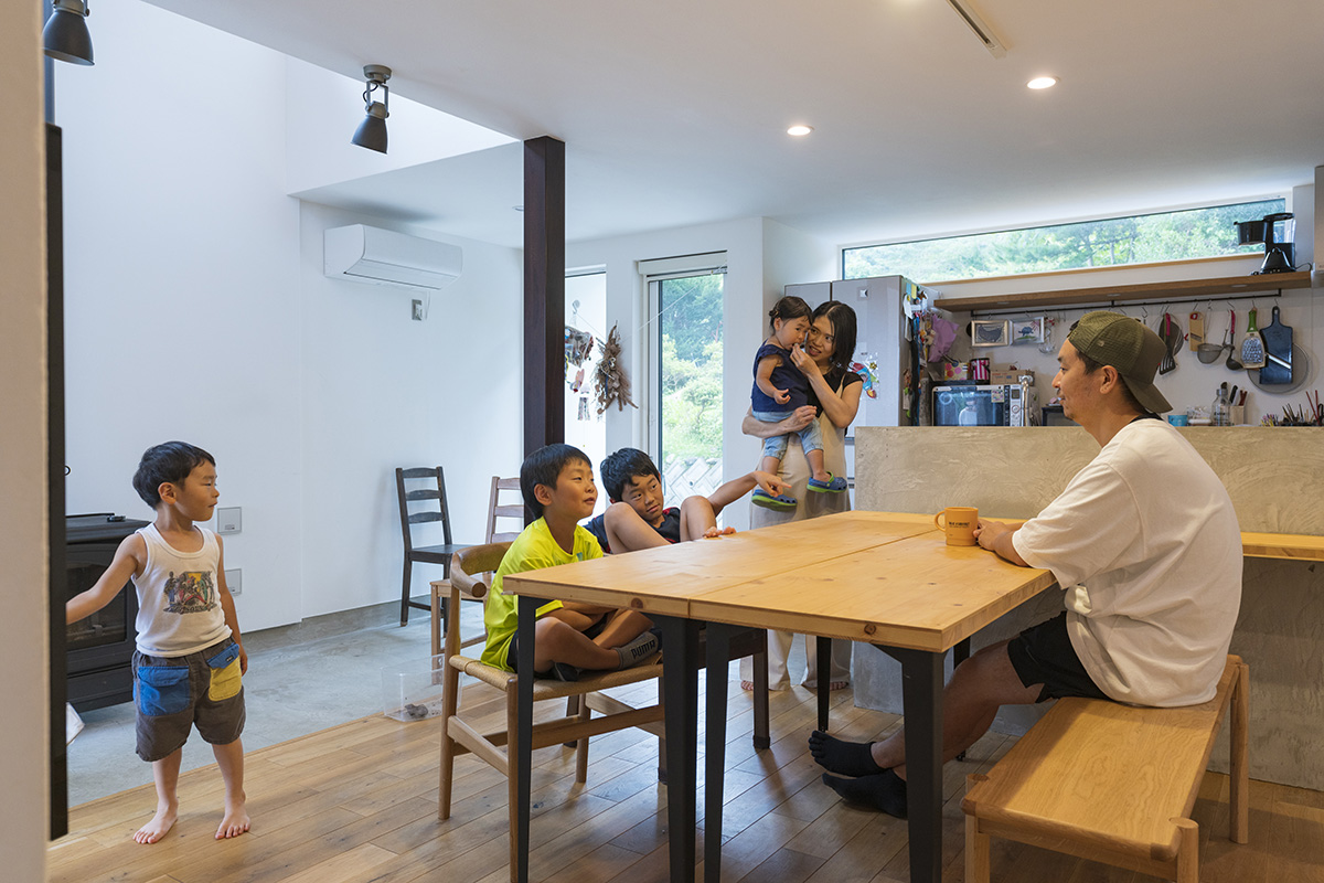 住宅性能の良い家を求めて当社完成見学会に来場されたYさん。見学した広い土間と薪ストーブのある家に惹かれ、ご自分の住まいにも取り入れられました。靴を脱がずに手洗いができる玄関空間、リビングに面し、キッチンまで続く広い土間、この2つの土間がYさん宅の特徴です。広い土間の上部は吹き抜けとし、憧れの薪ストーブも設置しました。