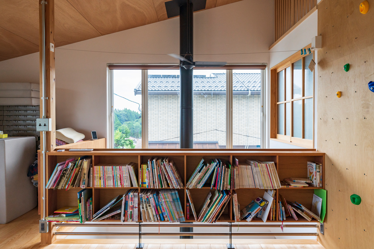 吹き抜けを通して薪ストーブの暖気が2階にも行き渡る。フリースベースには本棚も造作