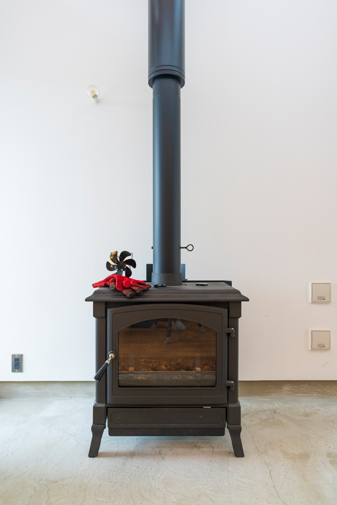 ご主人こだわりのカナダ・パシフィックエナジー社の薪ストーブ。シンプルなフォルムが土間空間になじむ