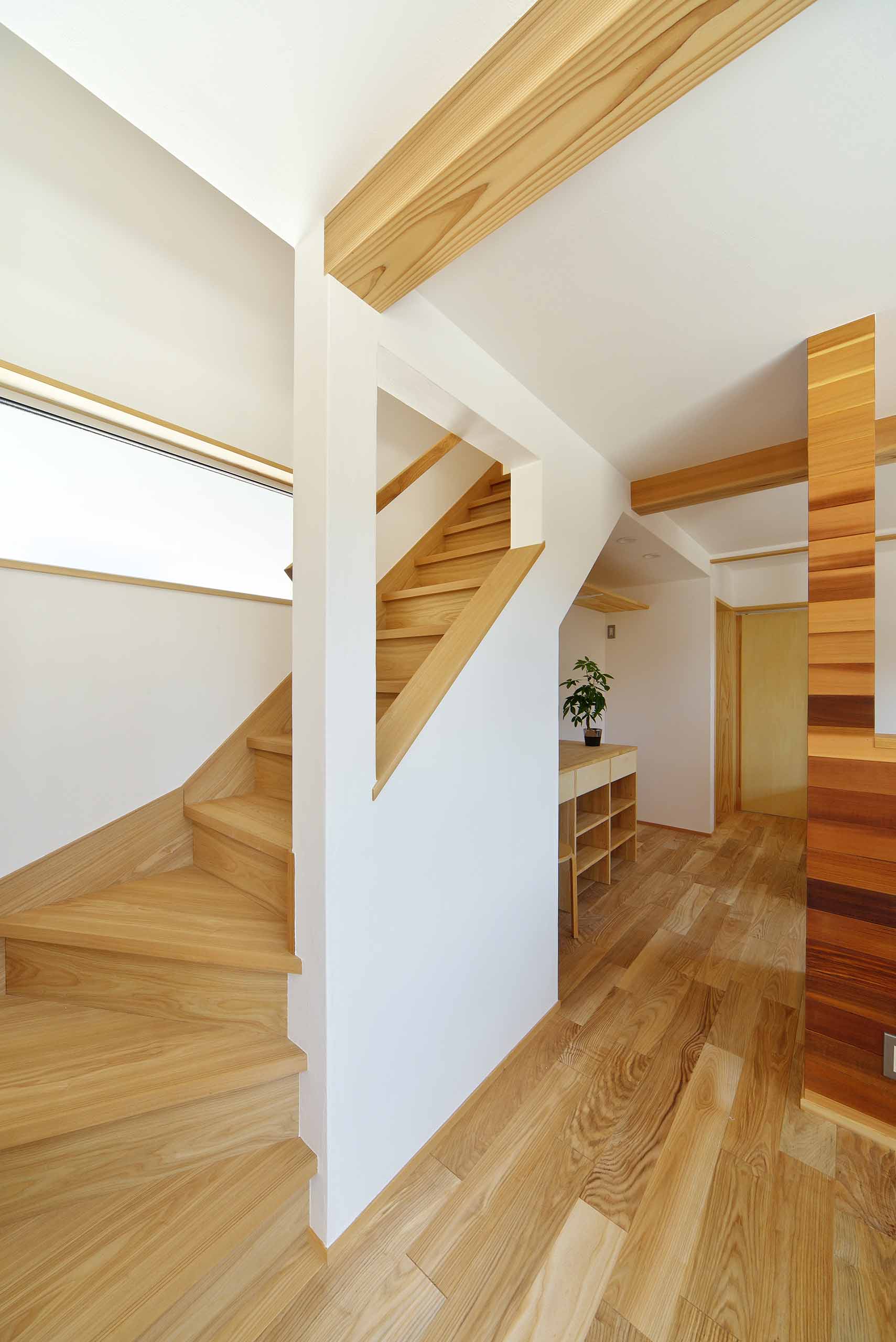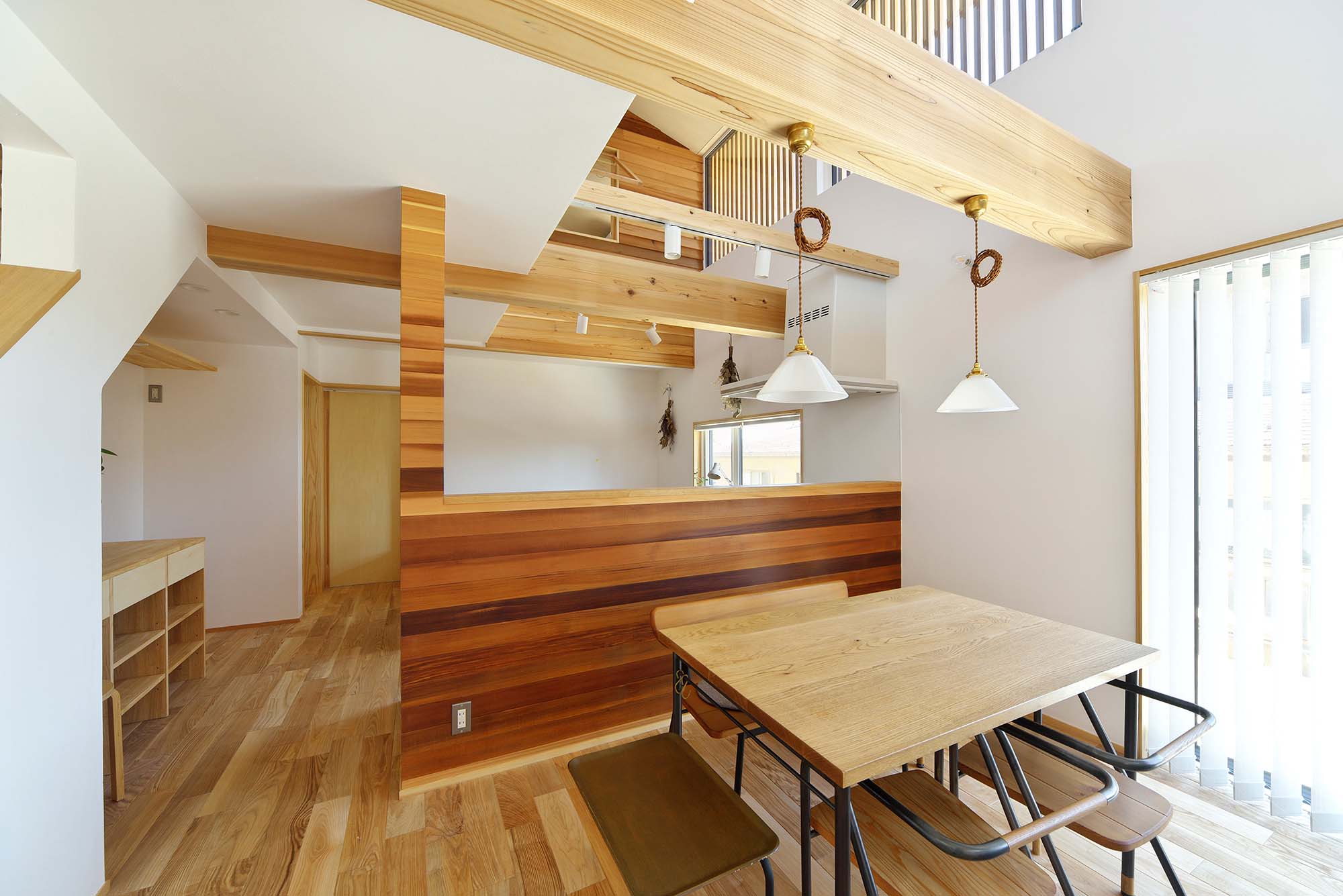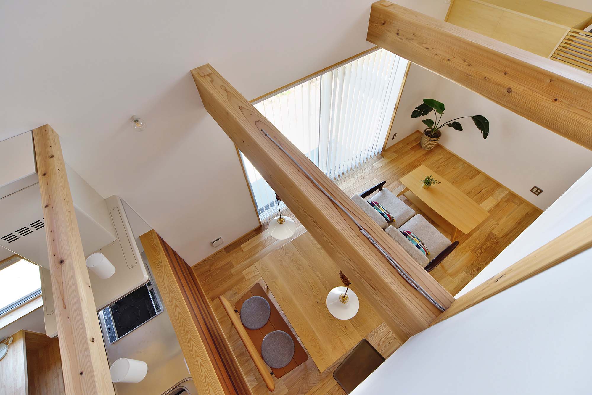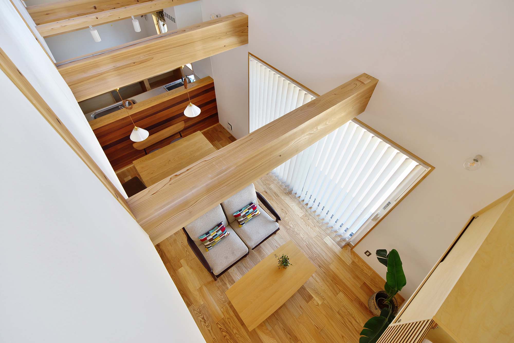 自然光と上質な空気で満ちた木の温もり溢れるLDK。吹き抜けを介して暖気や涼気が家中に循環する高気密・高断熱な住まいに。リビングのエアコンは木製の格子で目隠ししすっきりと