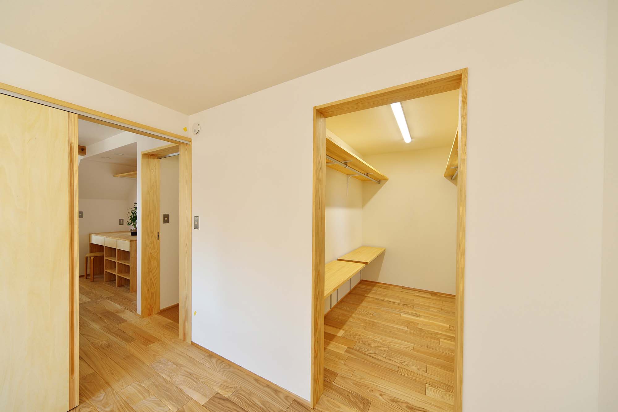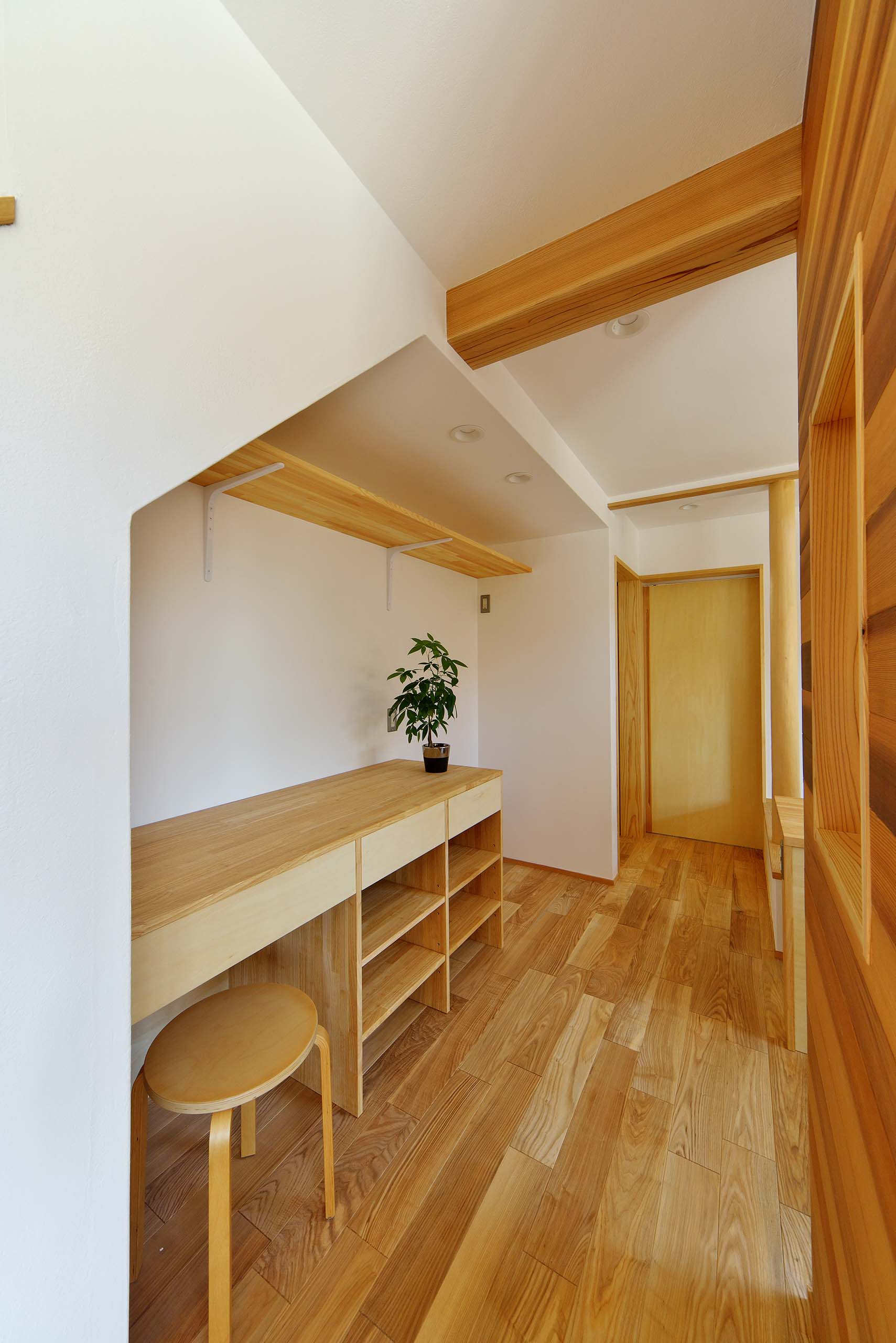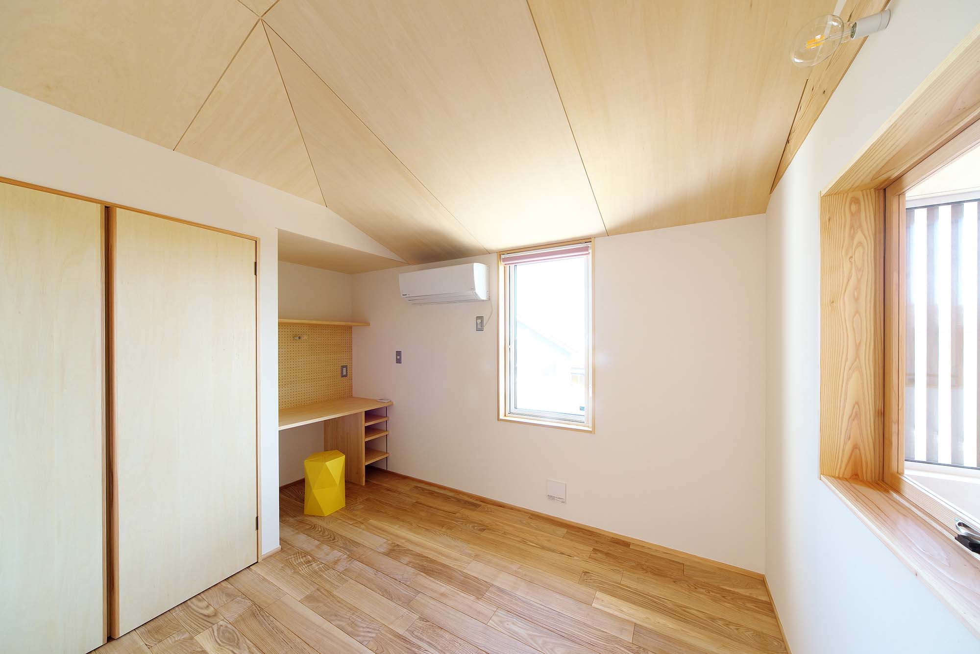 勾配天井でゆったりとした子ども部屋には、造作の机を設置