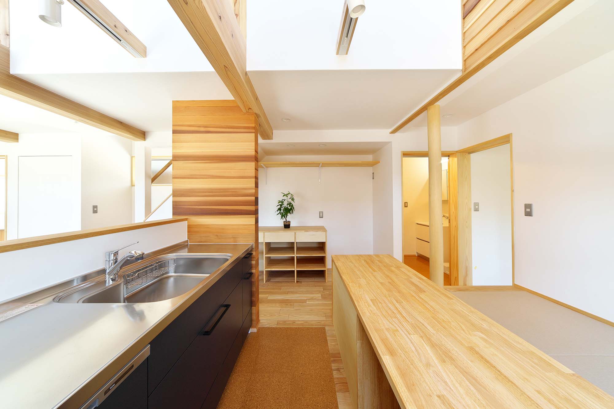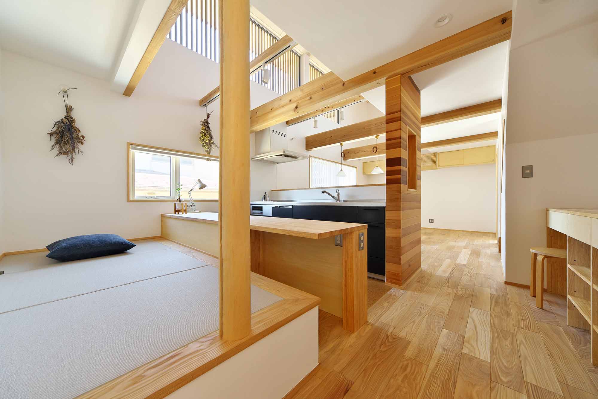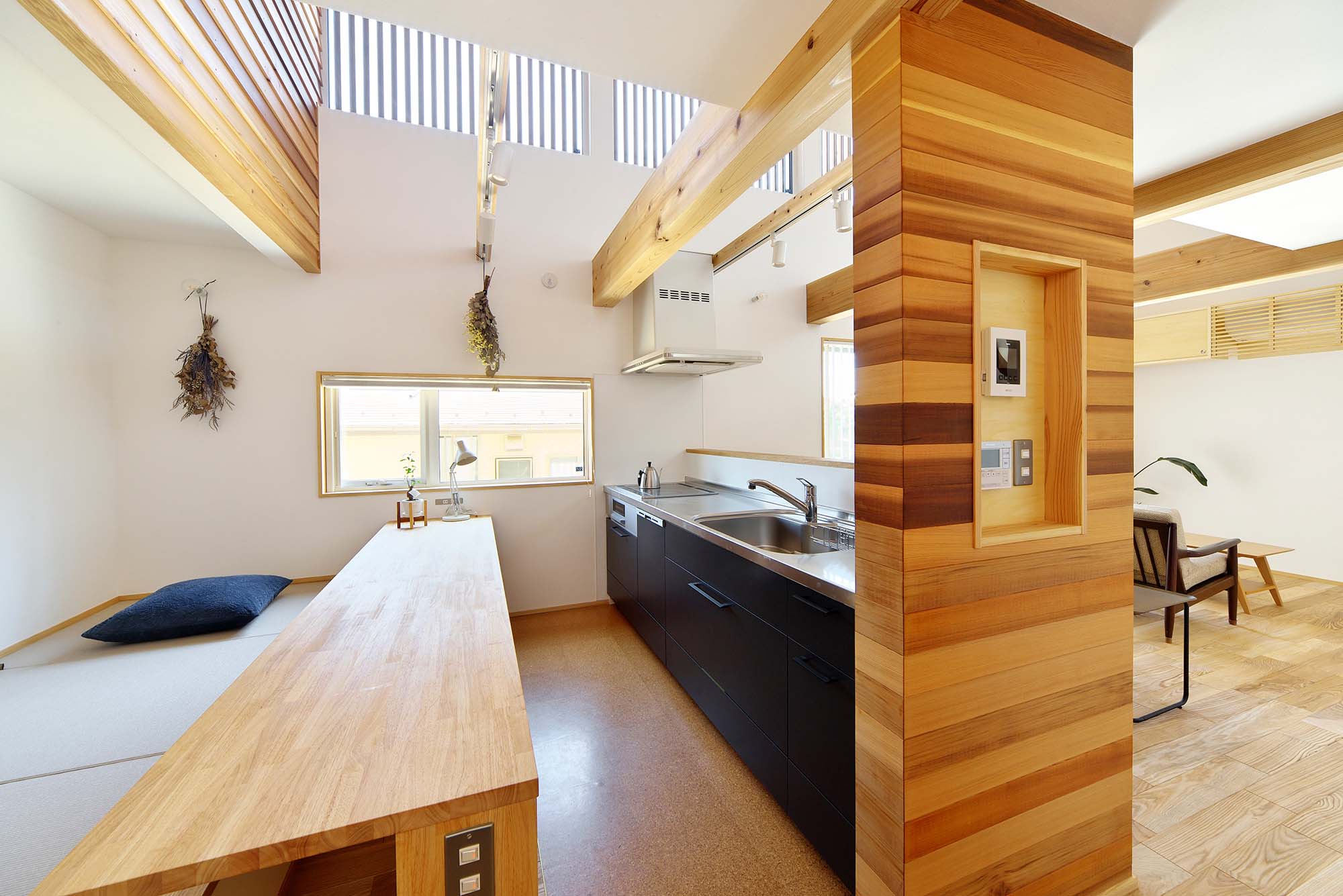 キッチンからカウンター越しに配した小上がり畳スペース。キッチンカウンター兼スタディカウンターとして両方向から使うことができ、調理中はもちろん、仕事や宿題をしながら家族間でコミュニケーションが取れる。キッチンの袖壁のレッドシダーがアクセントに