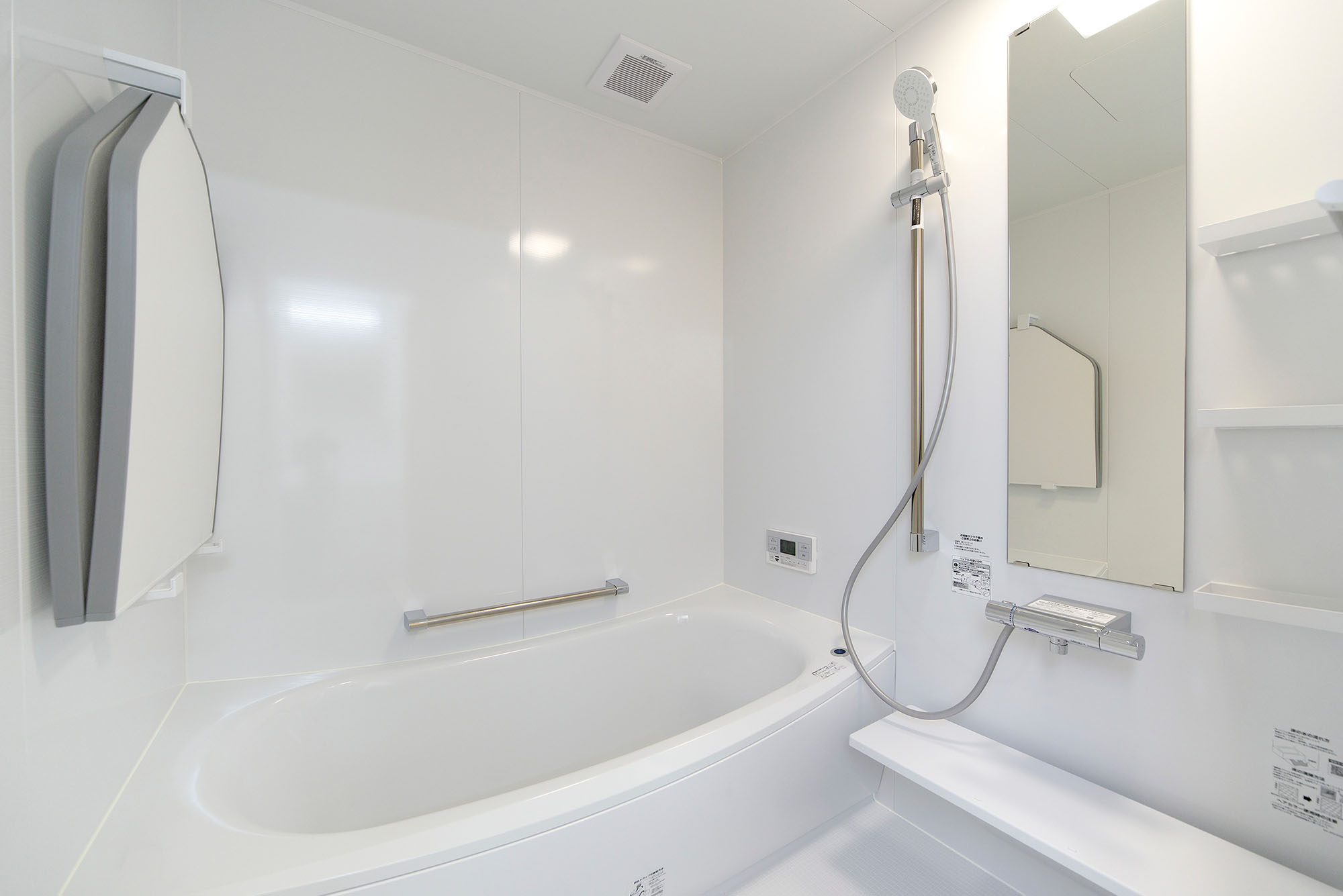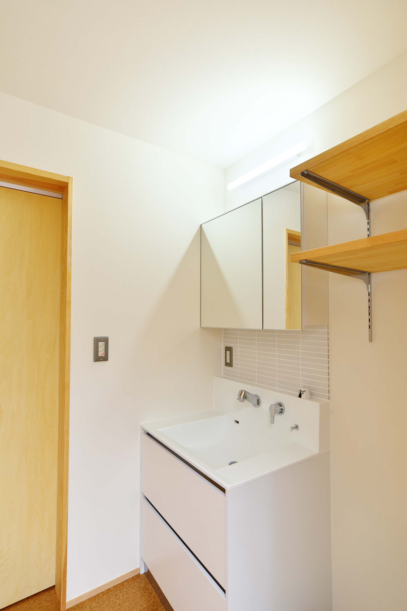 鏡と洗面台の間の壁に、タイルをあしらった明るい洗面スペース