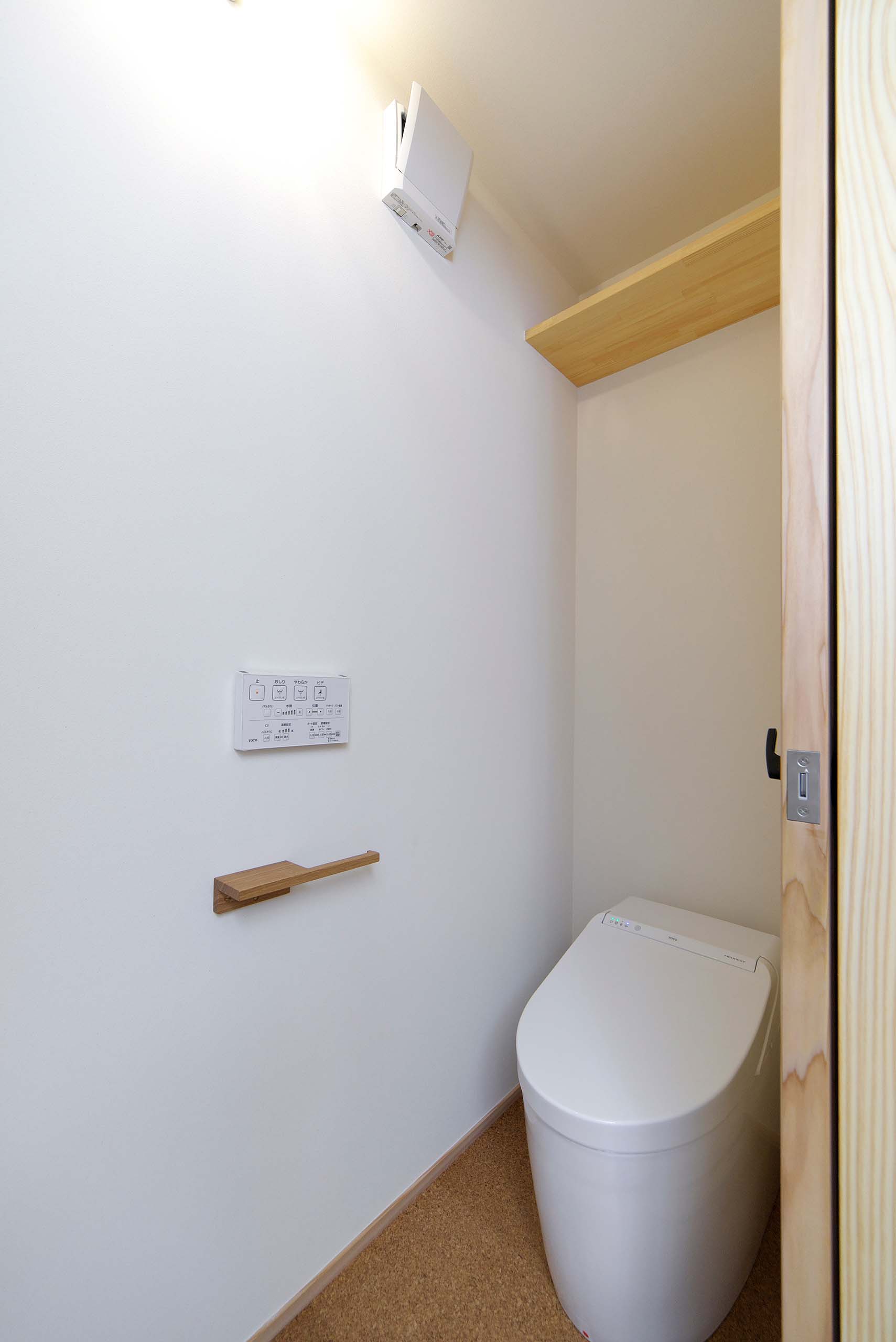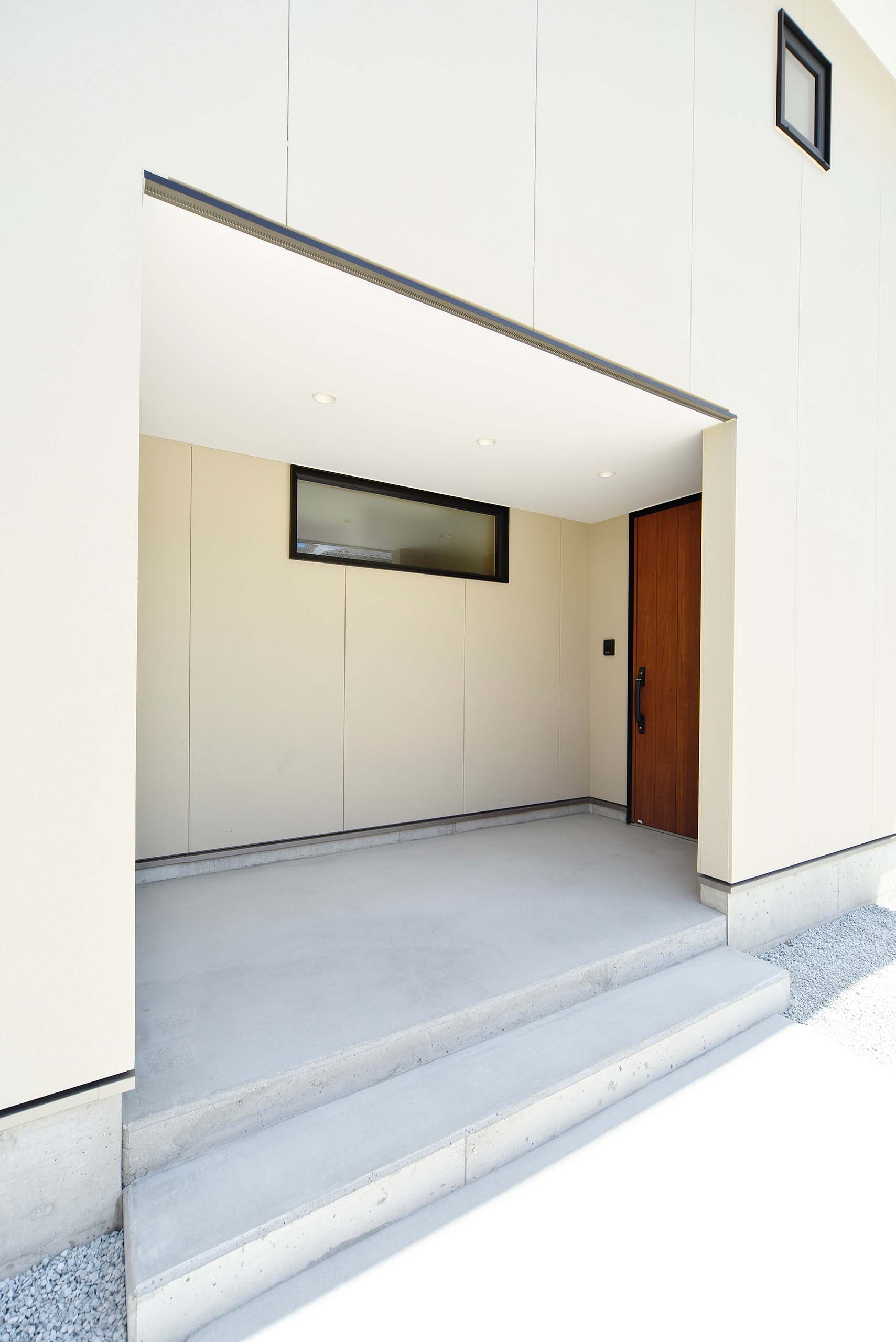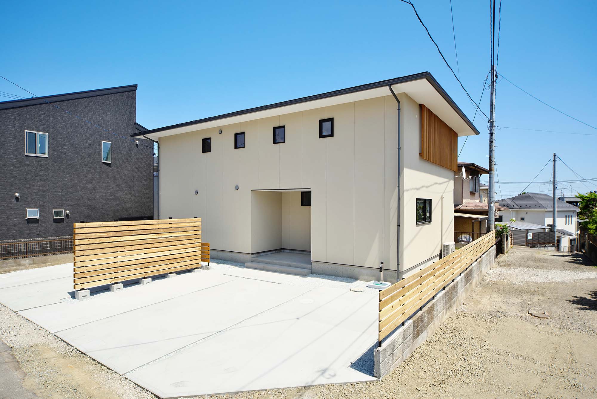 白を基調としたシンプルな総二階建ての外観。北西側の正面は、住宅性能や道路側からの目線にも配慮し、窓の数やサイズを抑えた。遮光と目隠しの役割を持たせた建物の木製ルーバーも印象的。車4台分の駐車スペースを確保した
