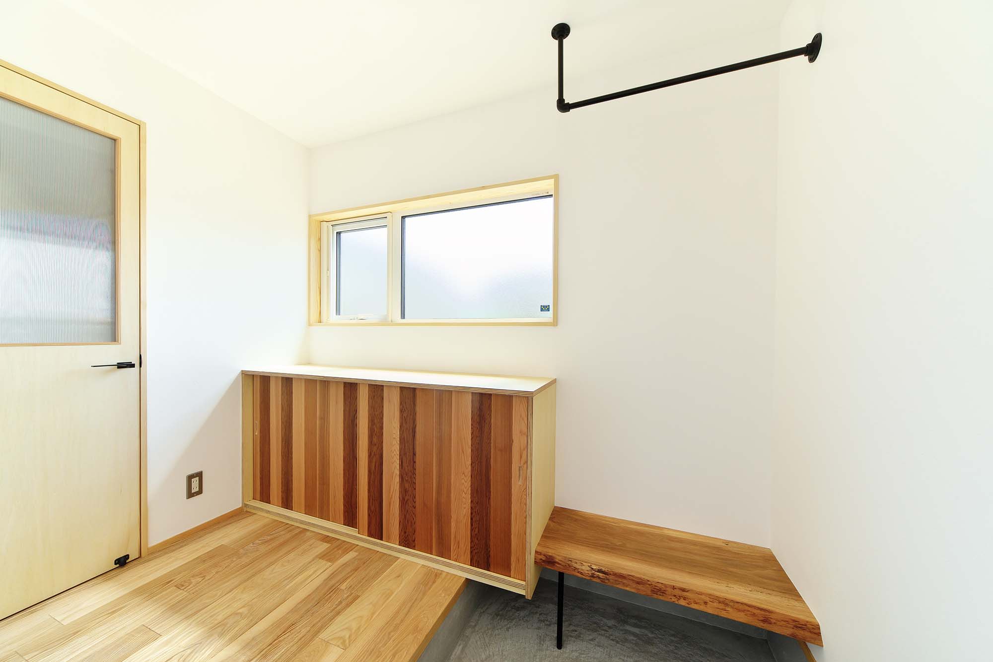 造作の靴箱やベンチを備えた玄関。アイアンバーはアウター掛けに