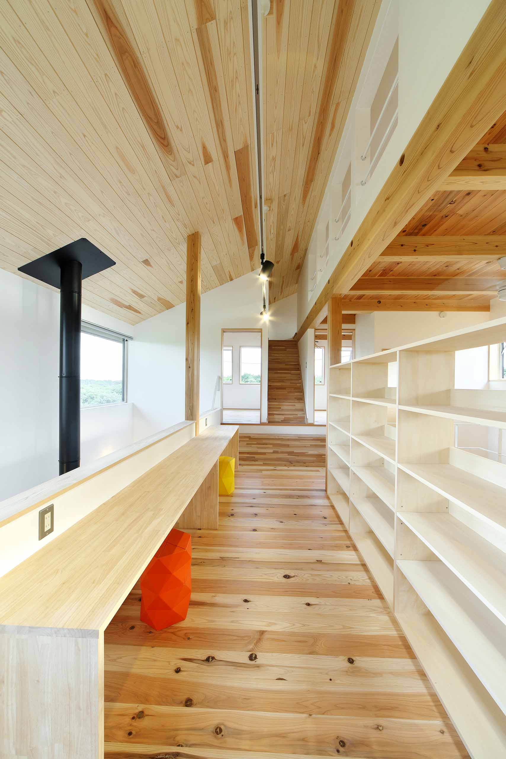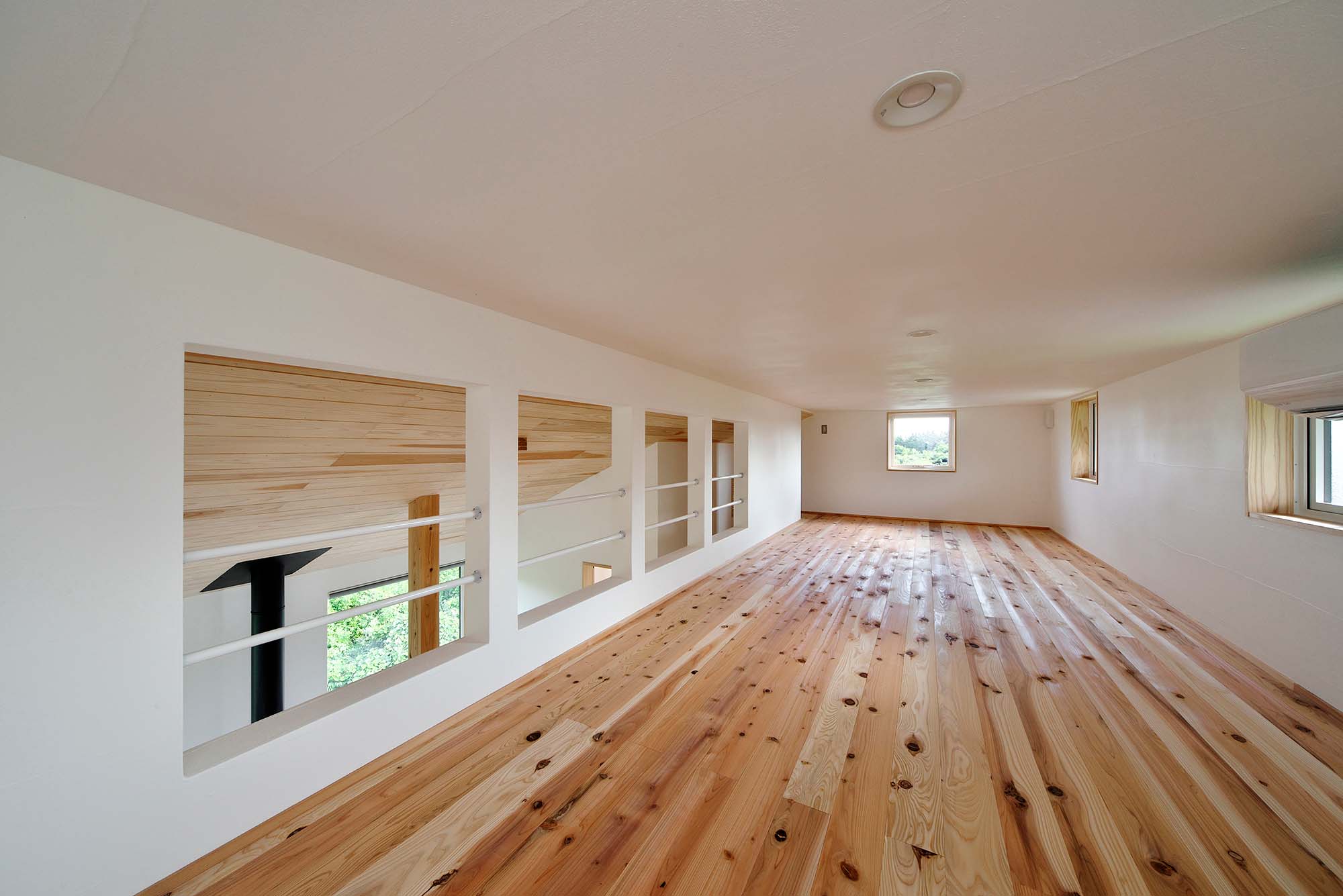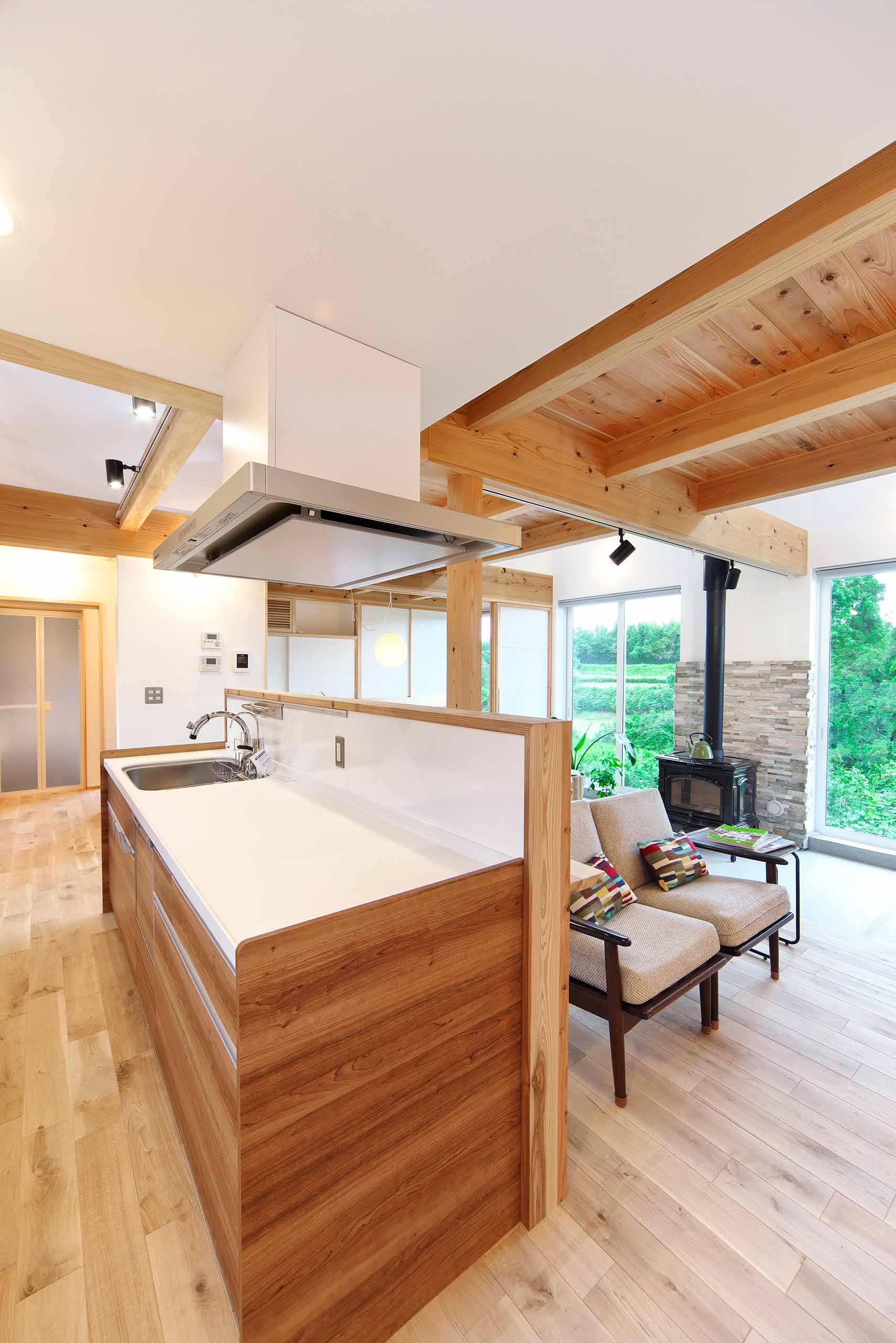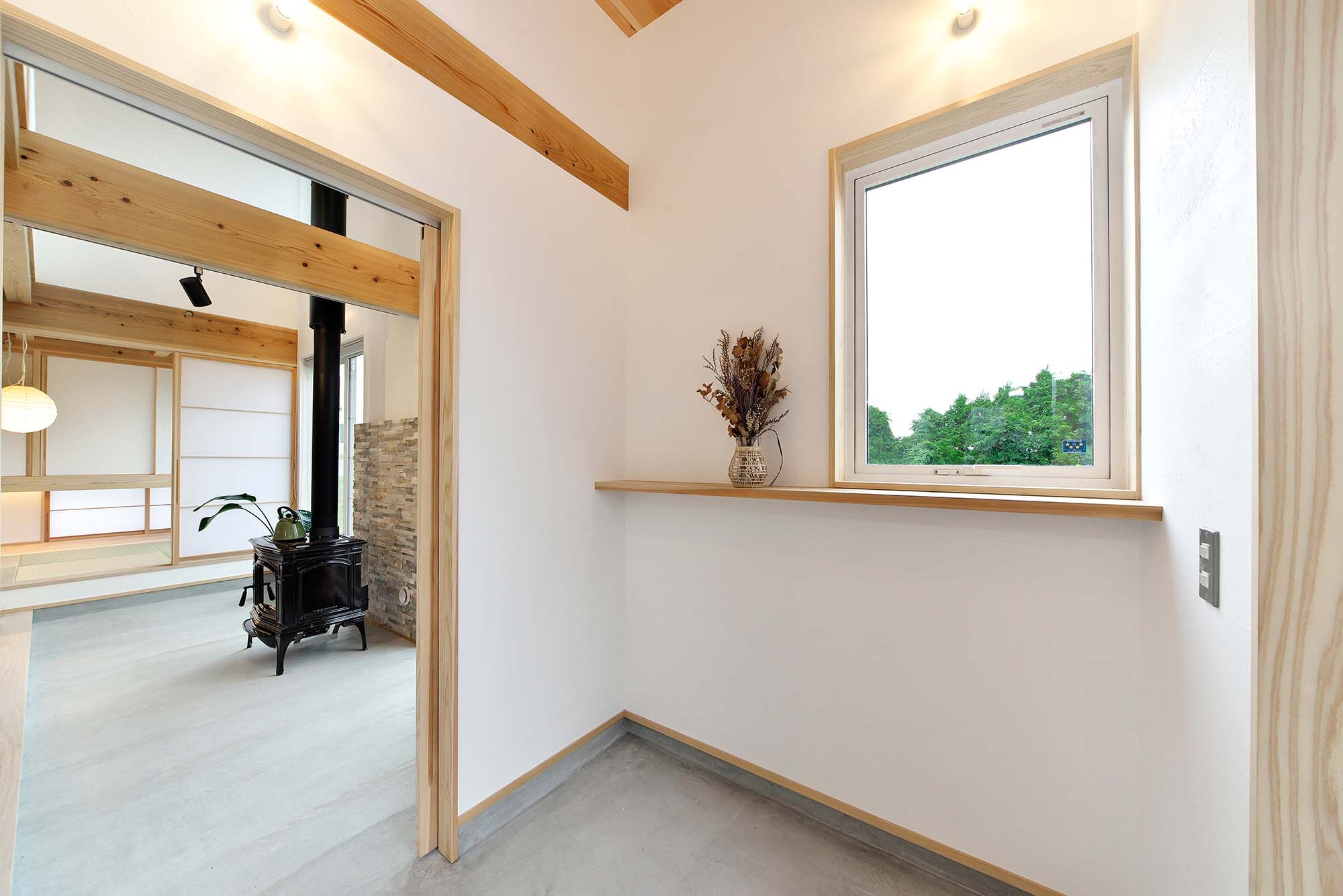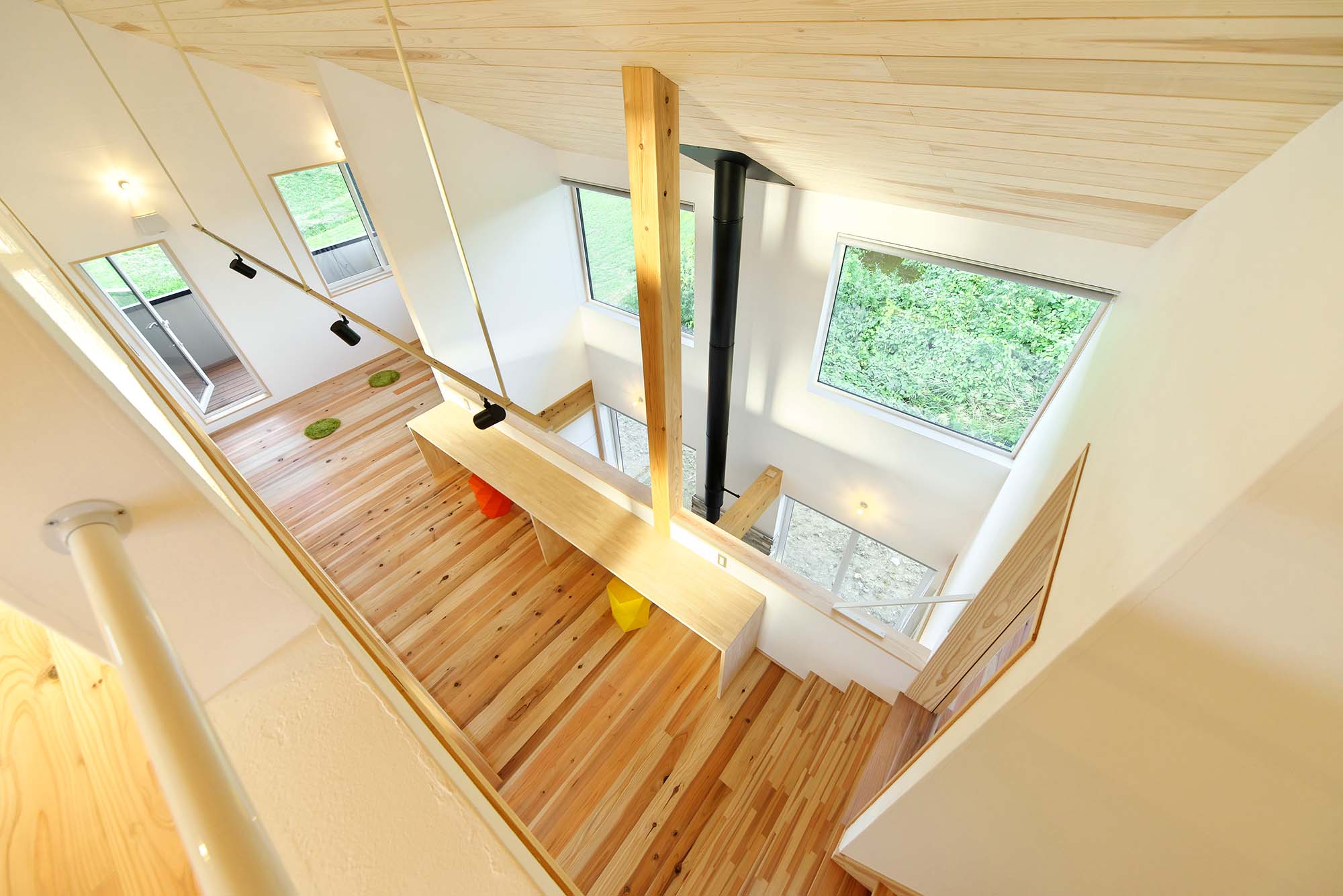 見晴らしの良い土地の利点を生かし、外の景色を室内に取り込むオープンなプラン。玄関からつながる広々とした使い勝手のいい土間スペースには、Eさまが「ぜひに」とご希望された薪ストーブを設置しました。薪ストーブの温もりが、吹き抜けを介して家中をくまなく暖めます。自然素材に包まれた心地よさも特徴です。景色もエネルギーも自然の恵みを存分に享受し、自然と寄り添う住まいとなりました。