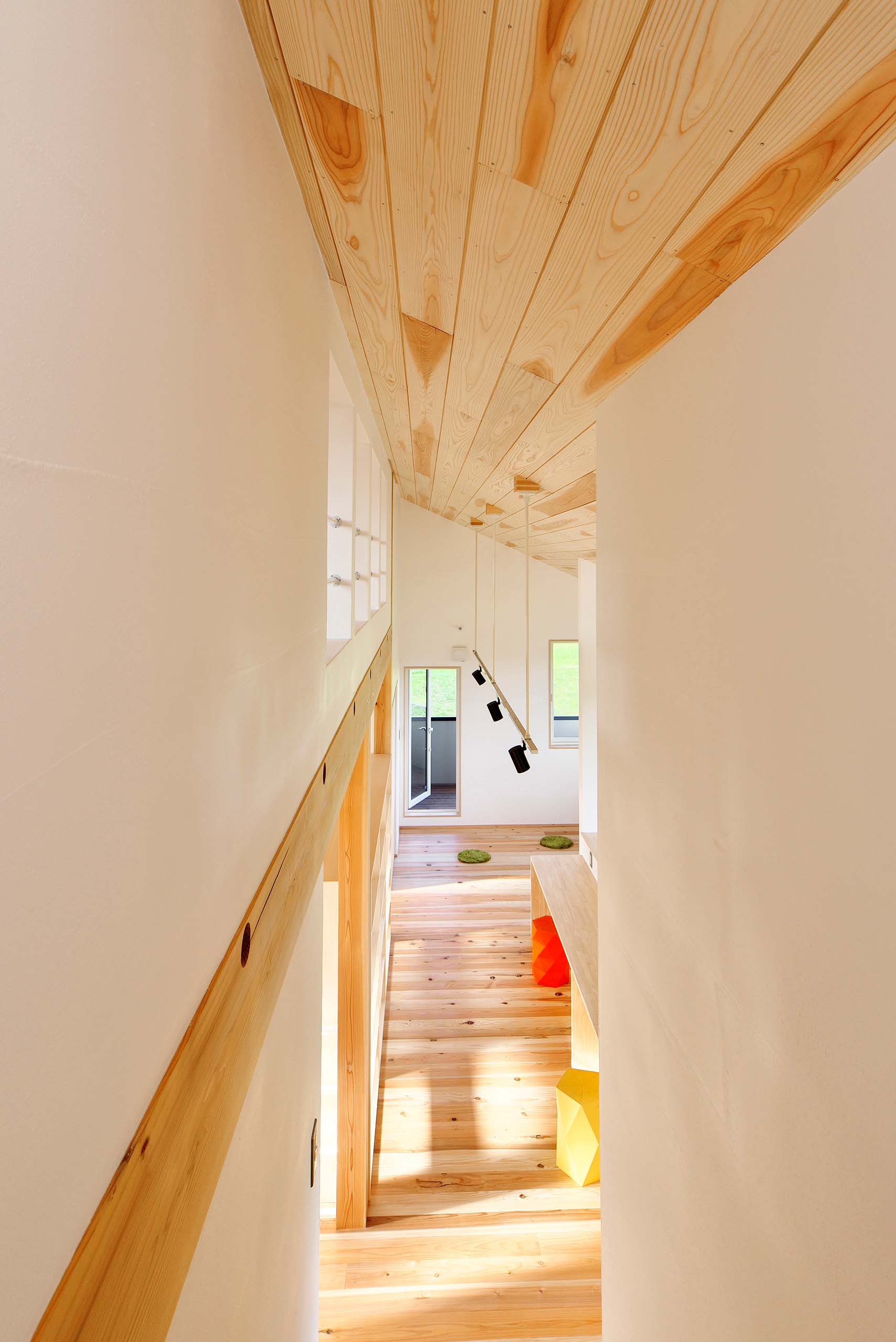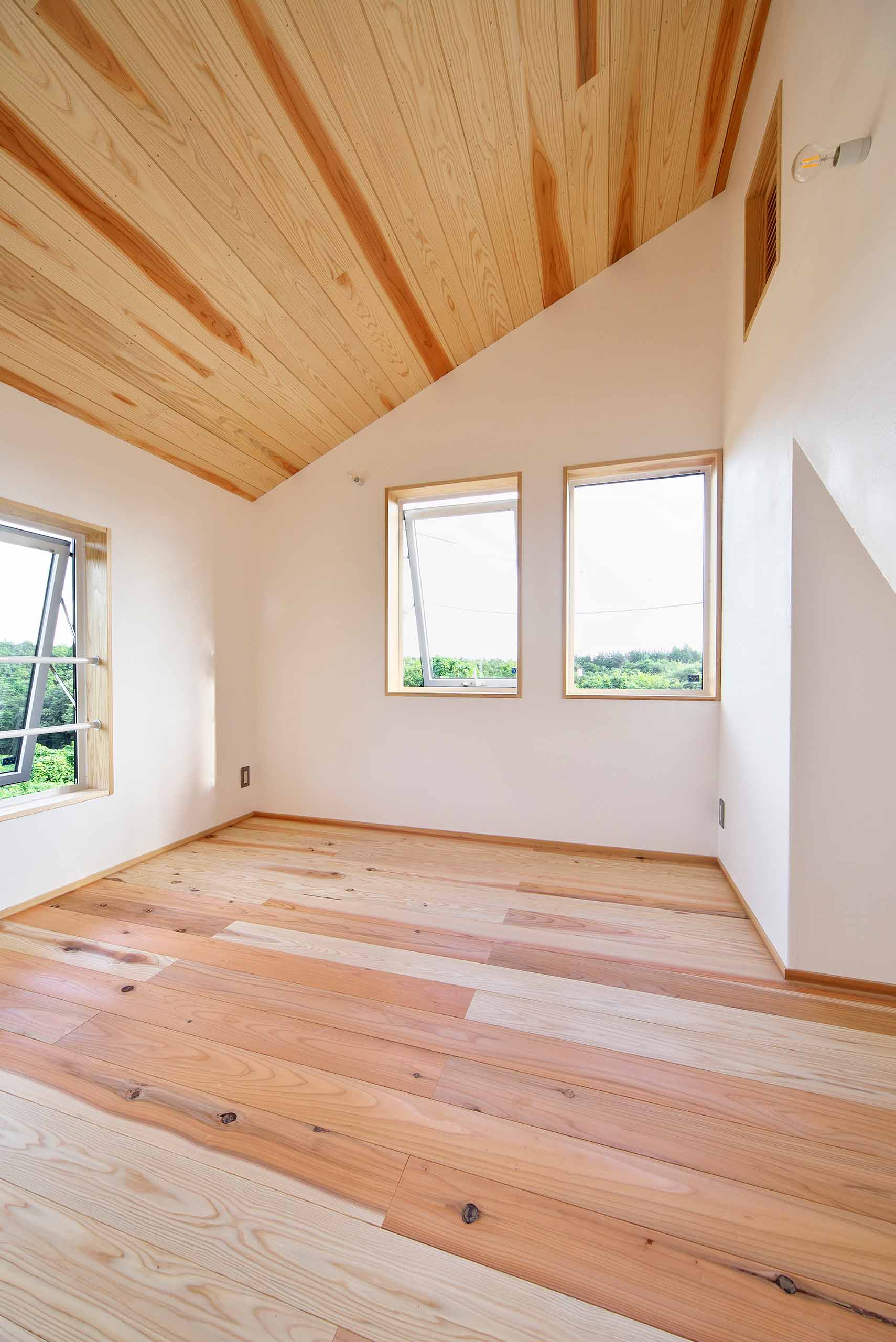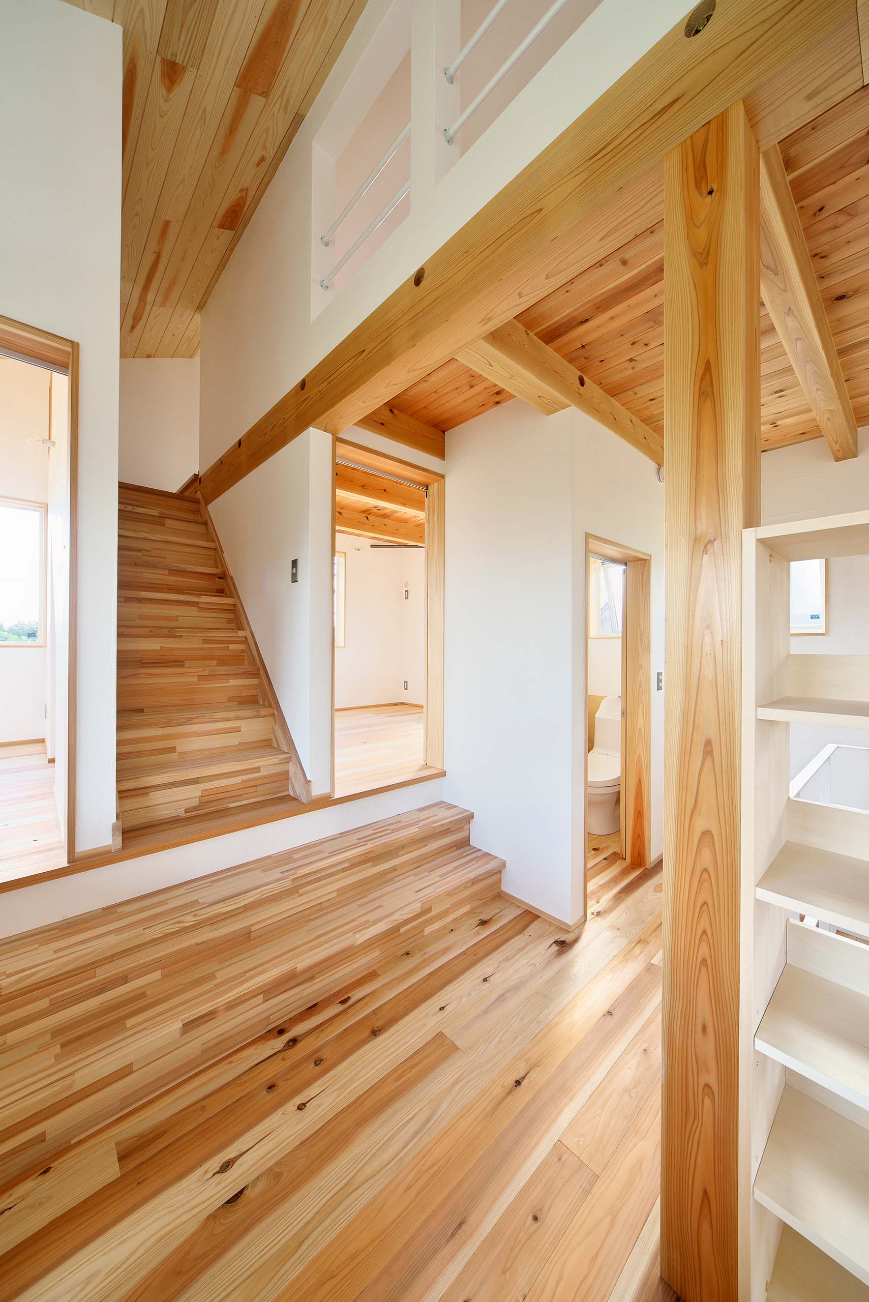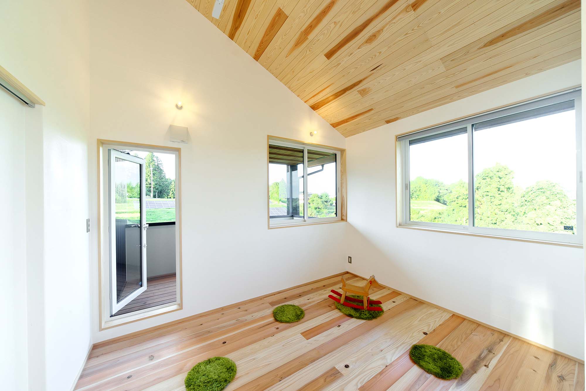 見晴らしの良い土地の利点を生かし、外の景色を室内に取り込むオープンなプラン。玄関からつながる広々とした使い勝手のいい土間スペースには、Eさまが「ぜひに」とご希望された薪ストーブを設置しました。薪ストーブの温もりが、吹き抜けを介して家中をくまなく暖めます。自然素材に包まれた心地よさも特徴です。景色もエネルギーも自然の恵みを存分に享受し、自然と寄り添う住まいとなりました。