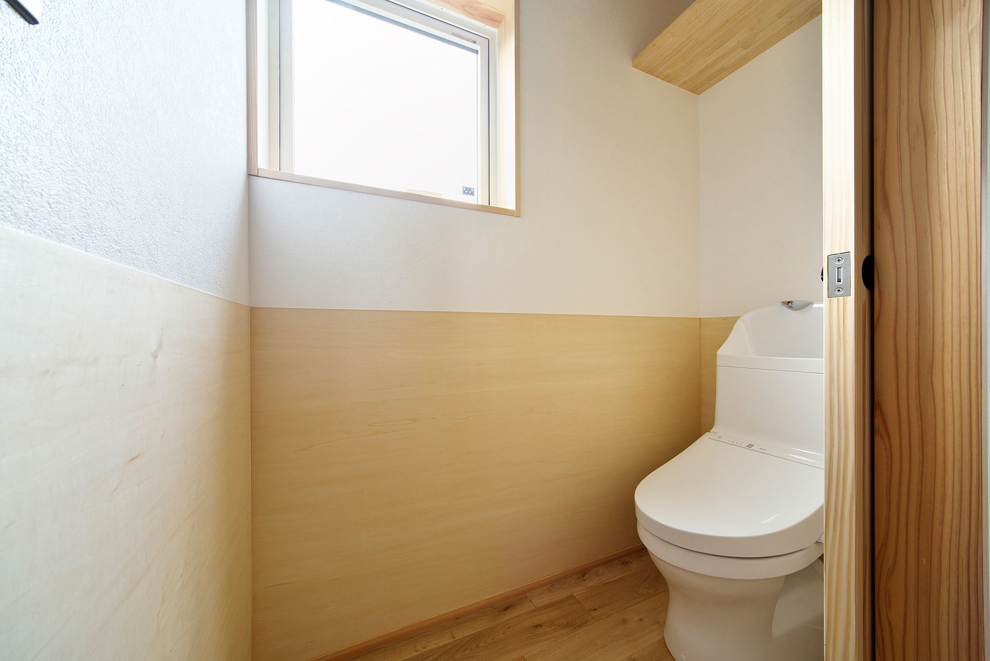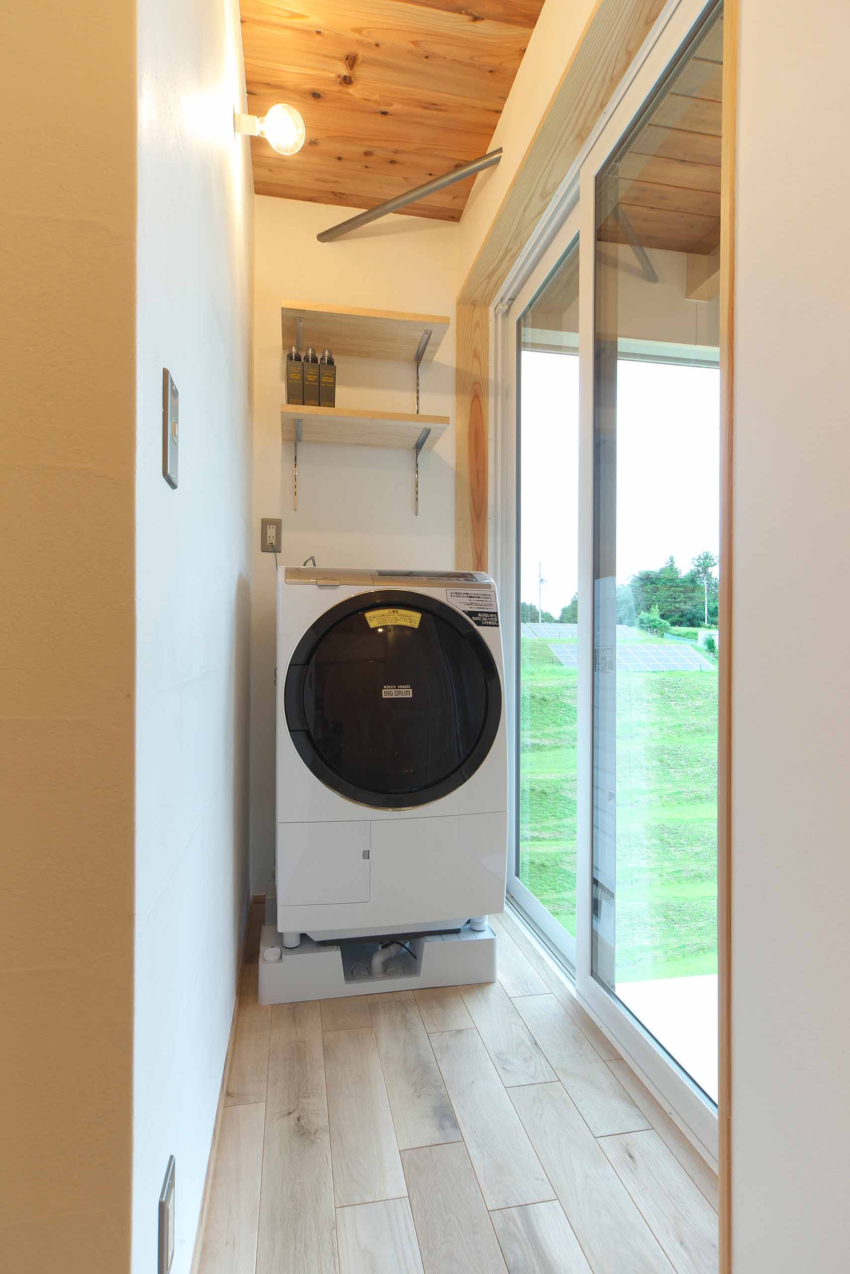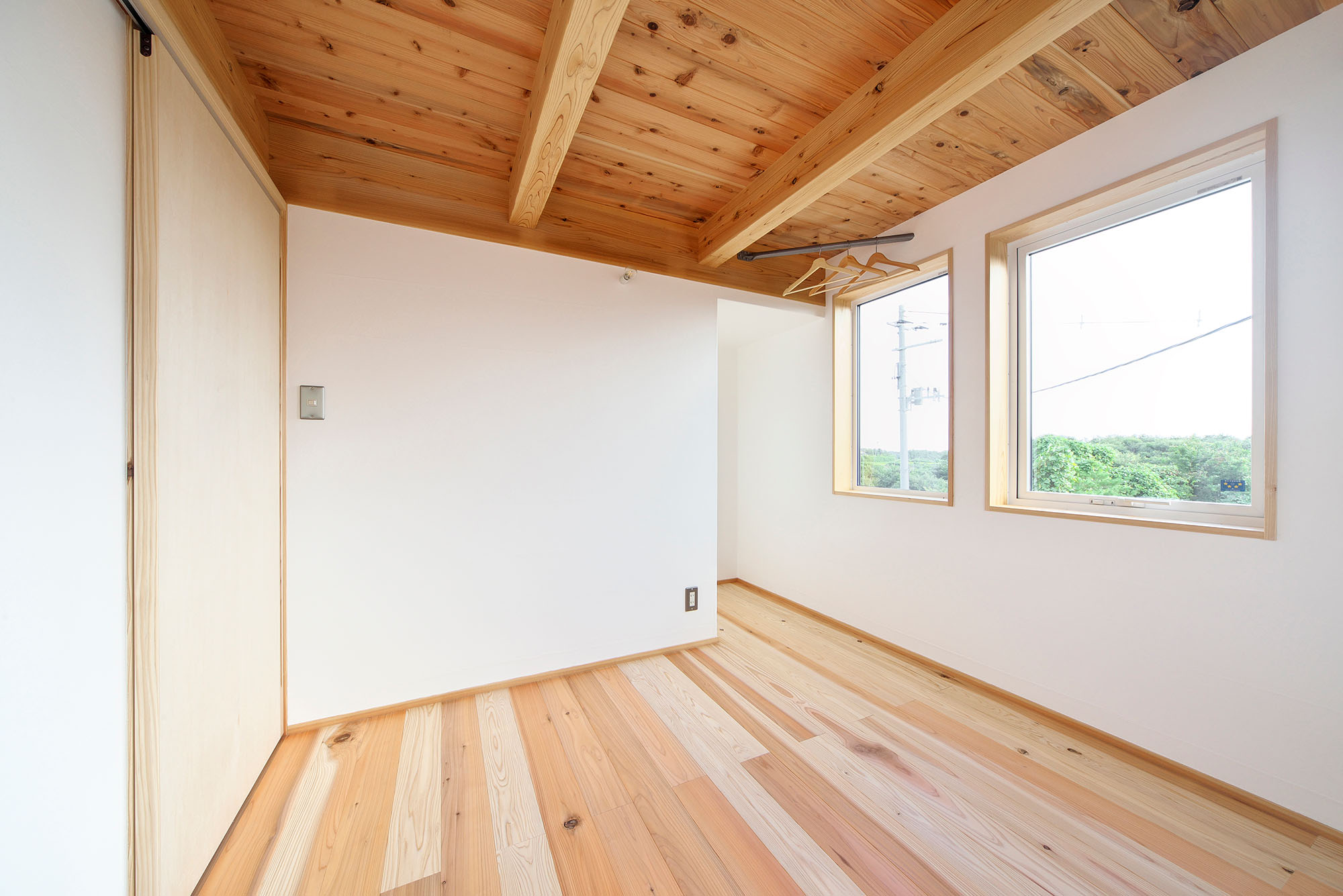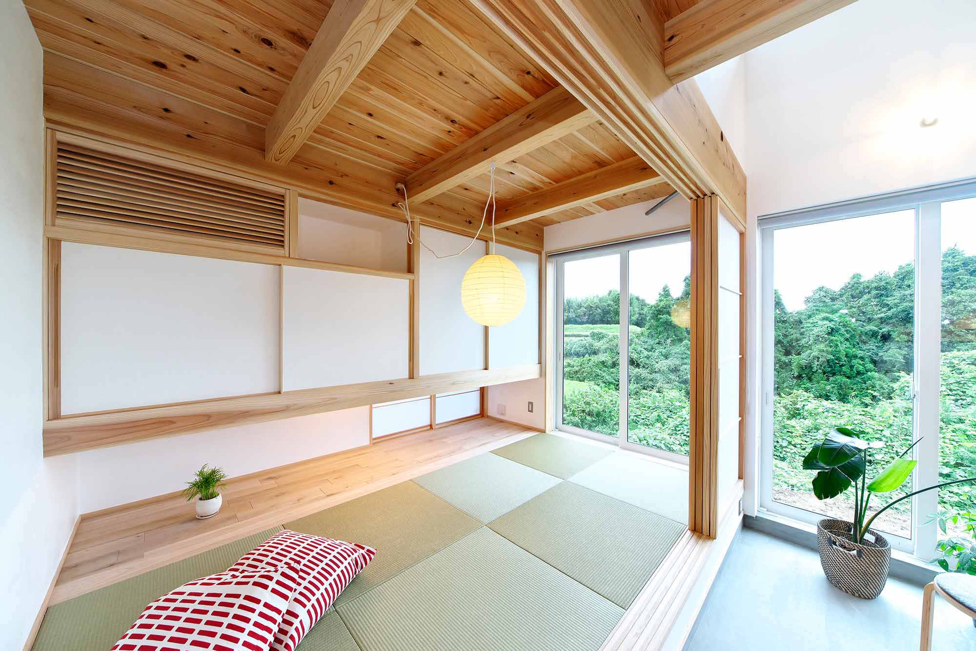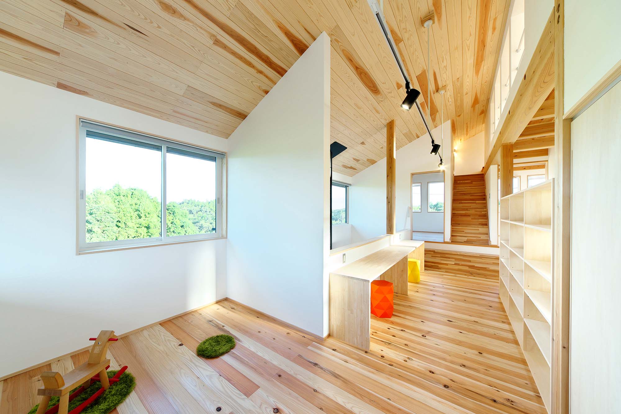 見晴らしの良い土地の利点を生かし、外の景色を室内に取り込むオープンなプラン。玄関からつながる広々とした使い勝手のいい土間スペースには、Eさまが「ぜひに」とご希望された薪ストーブを設置しました。薪ストーブの温もりが、吹き抜けを介して家中をくまなく暖めます。自然素材に包まれた心地よさも特徴です。景色もエネルギーも自然の恵みを存分に享受し、自然と寄り添う住まいとなりました。