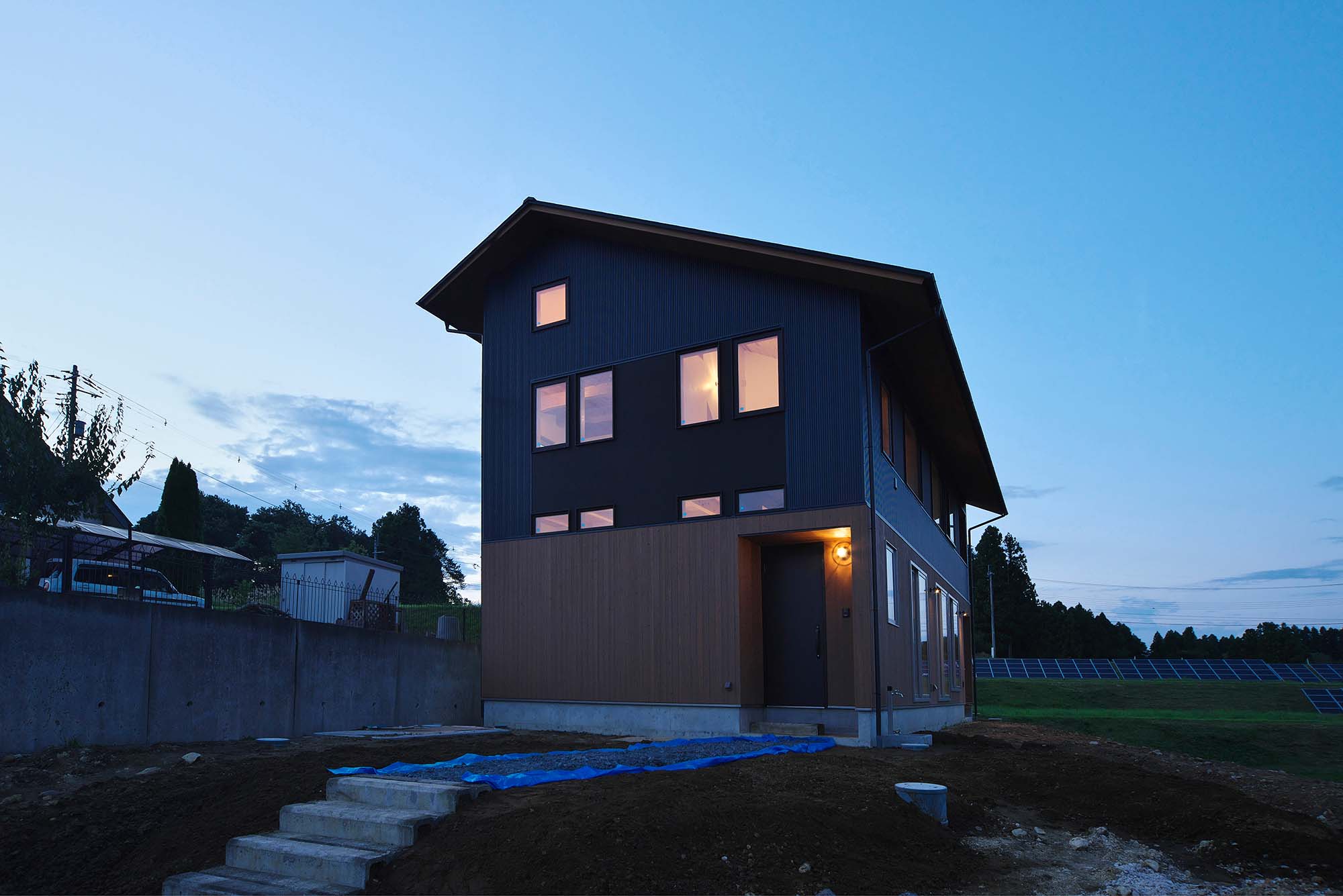 屋久杉とガルバリウムで設えた外観は。夕焼けに灯る暖かな照明の光が美しい