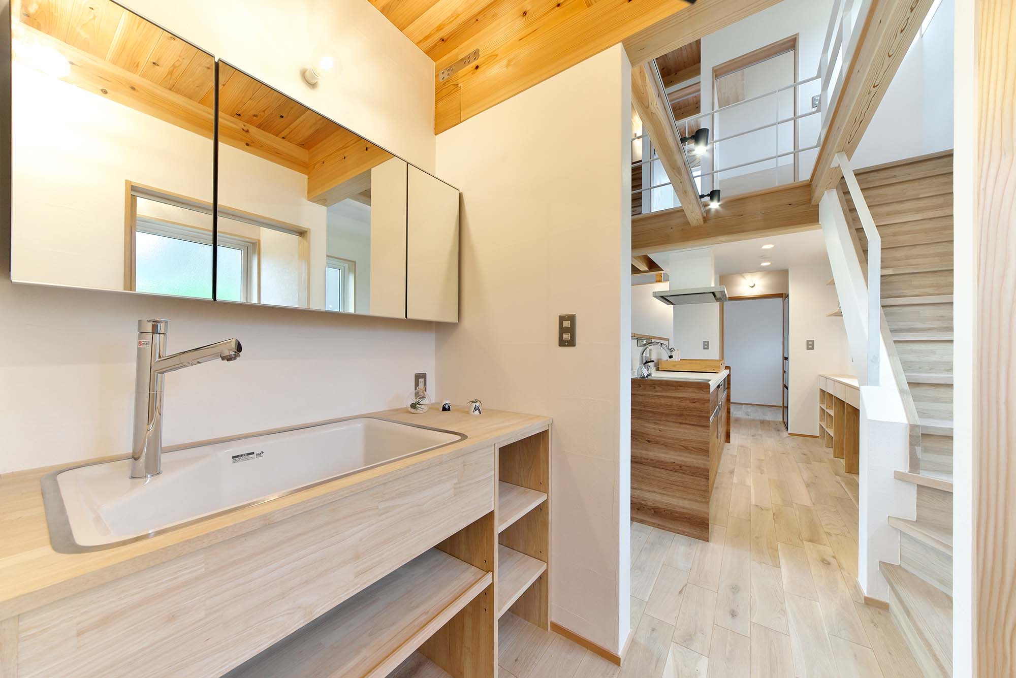 忙しい朝も家族が便利に使えるよう造作した広い洗面化粧台