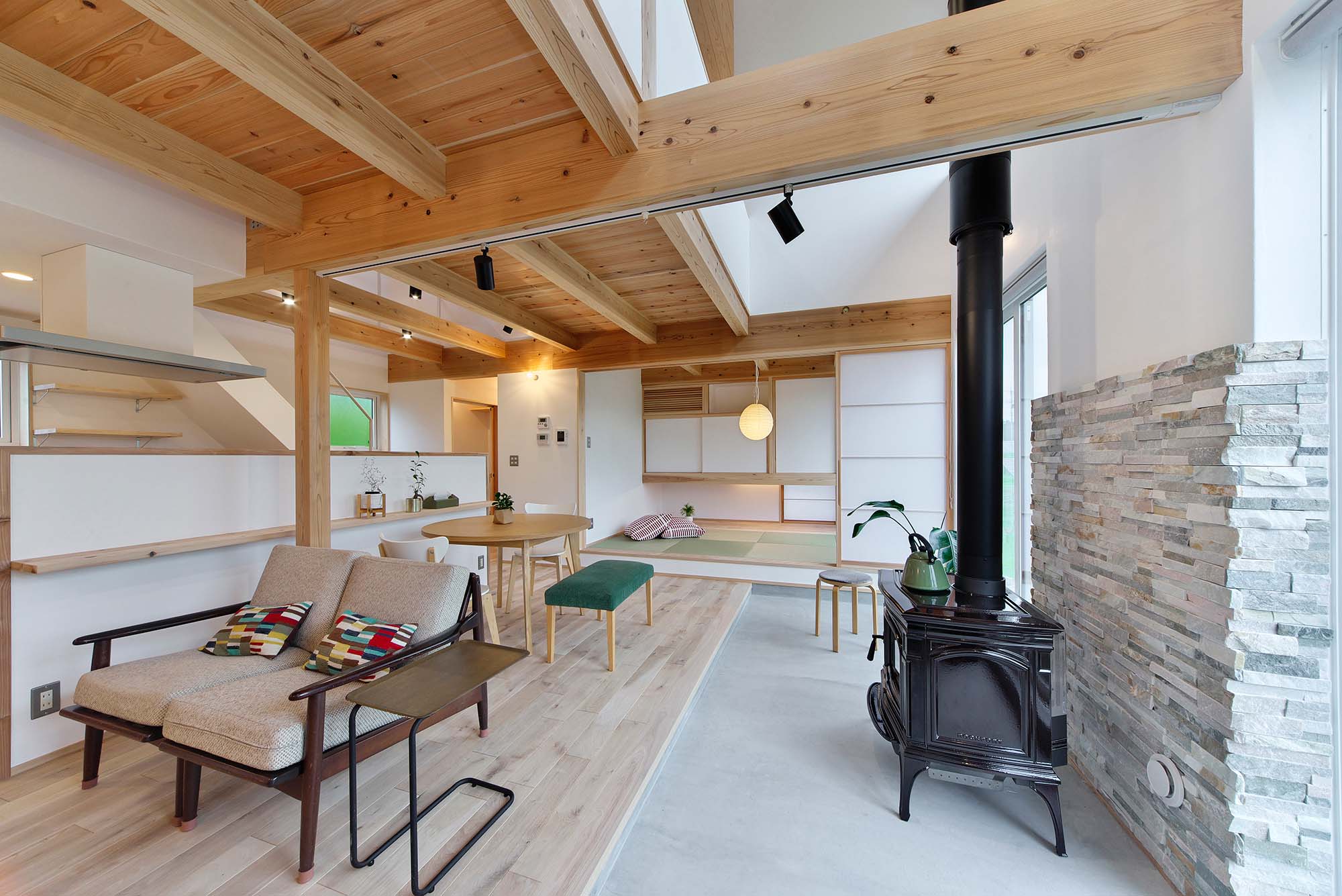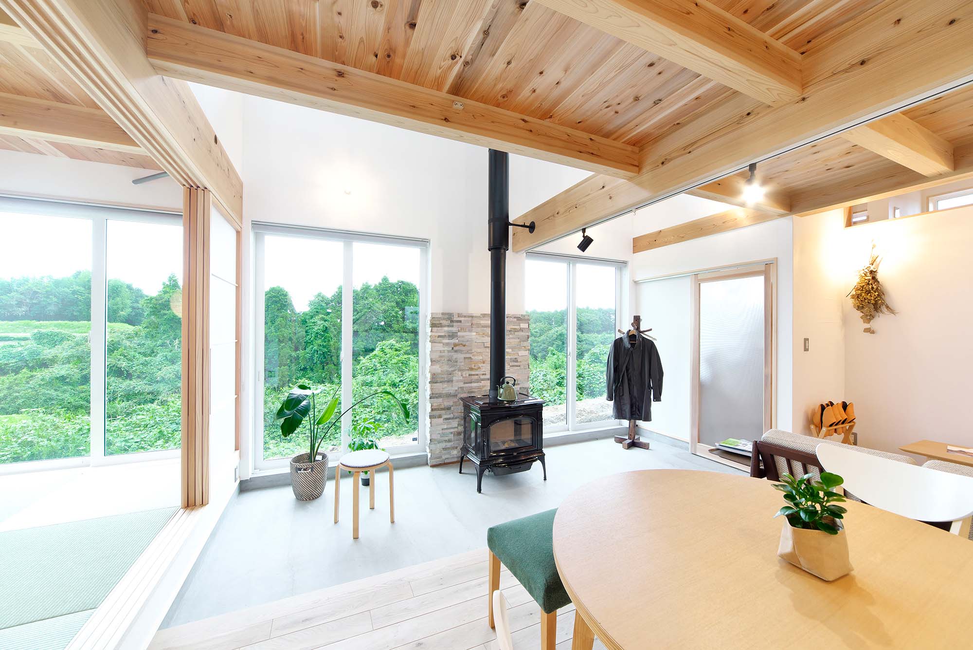 見晴らしのいい土地の利点を暮らしに生かすオープンな間取りを提案。使い勝手の良い土間には高性能な薪ストーブを採用