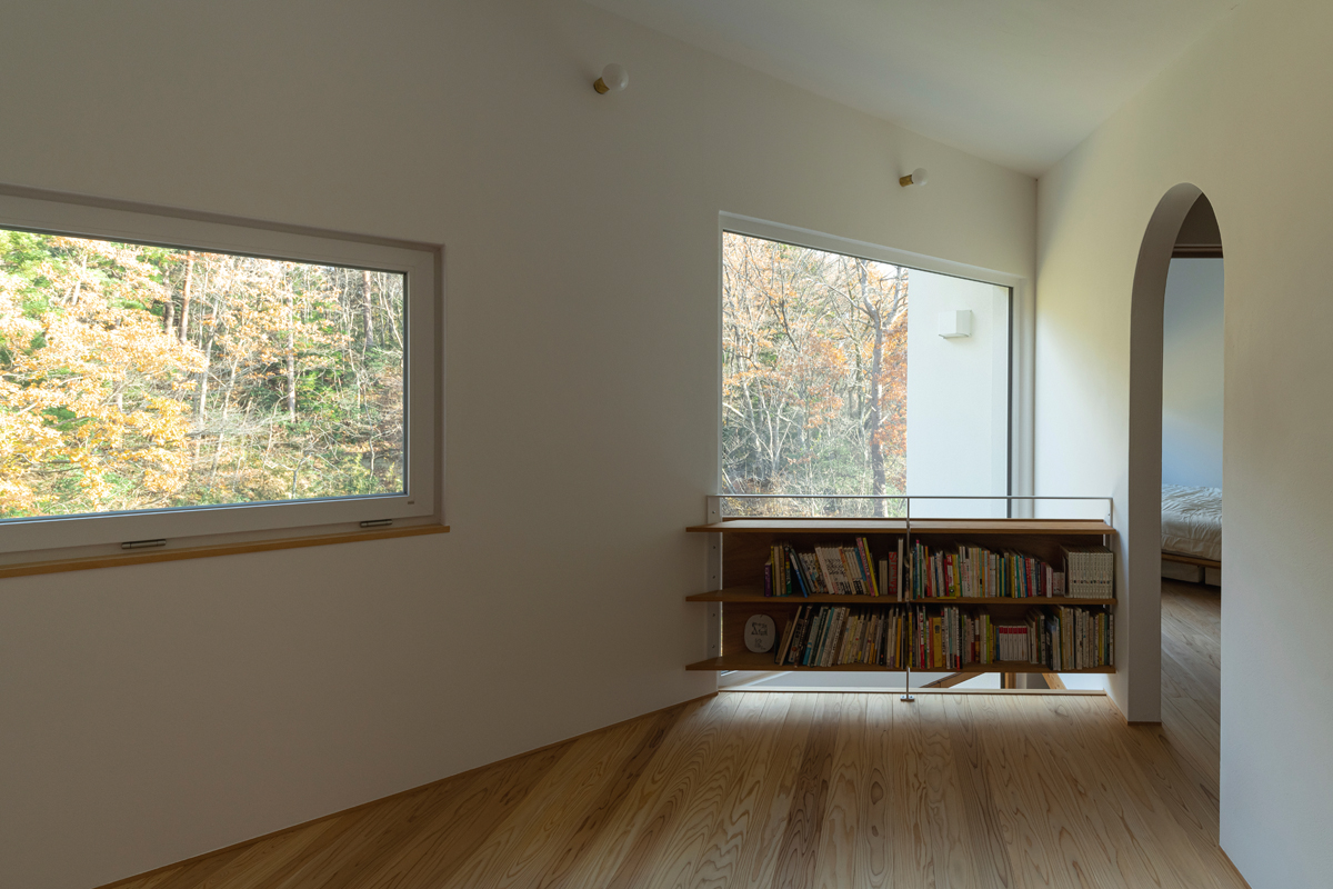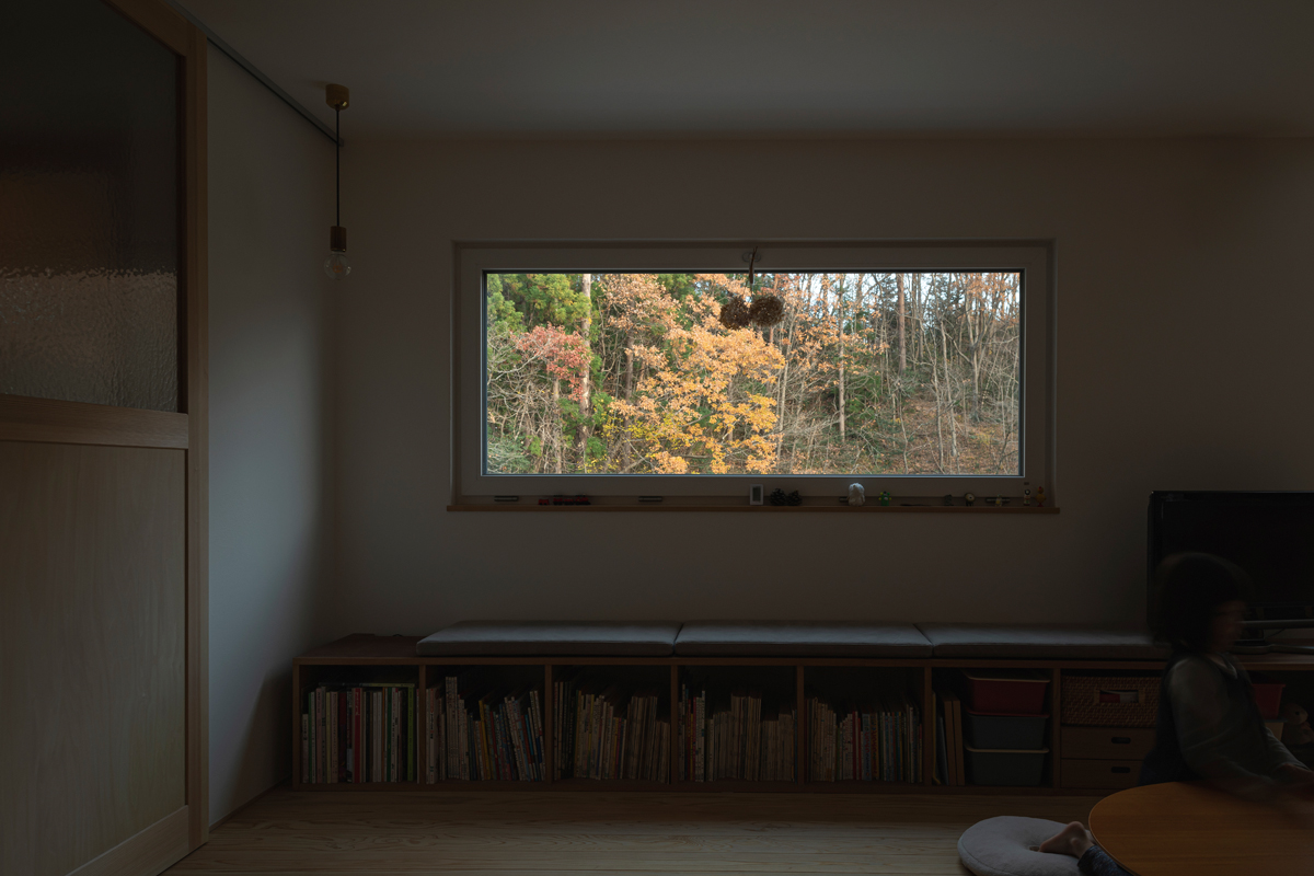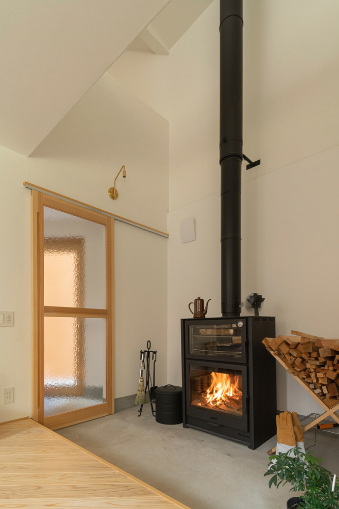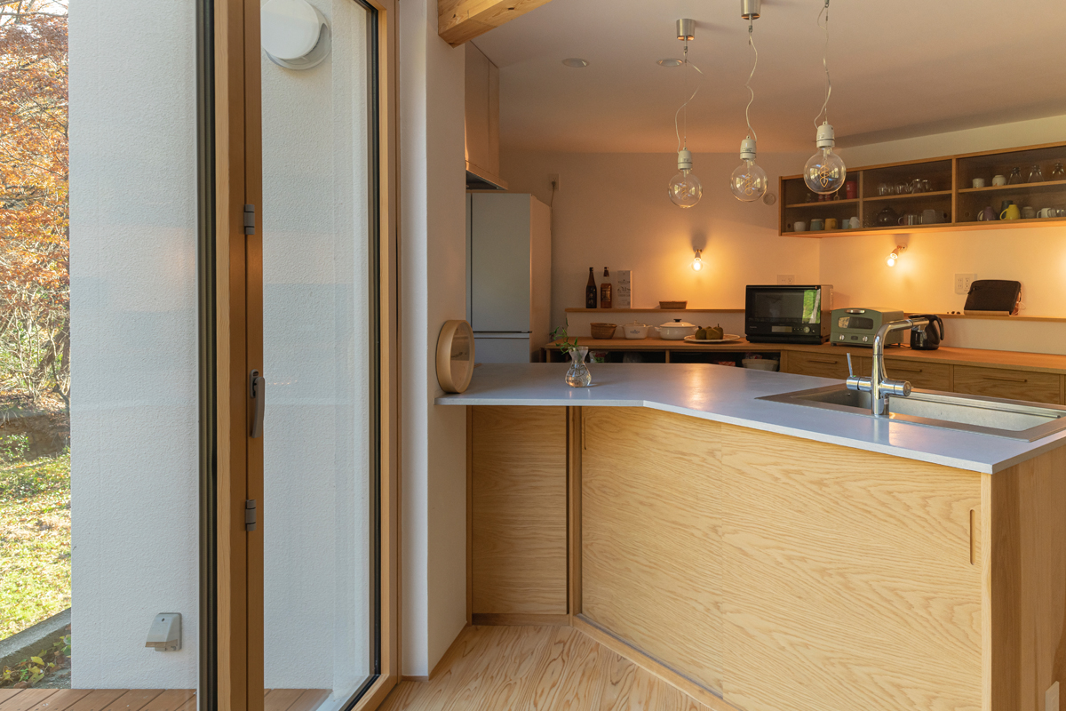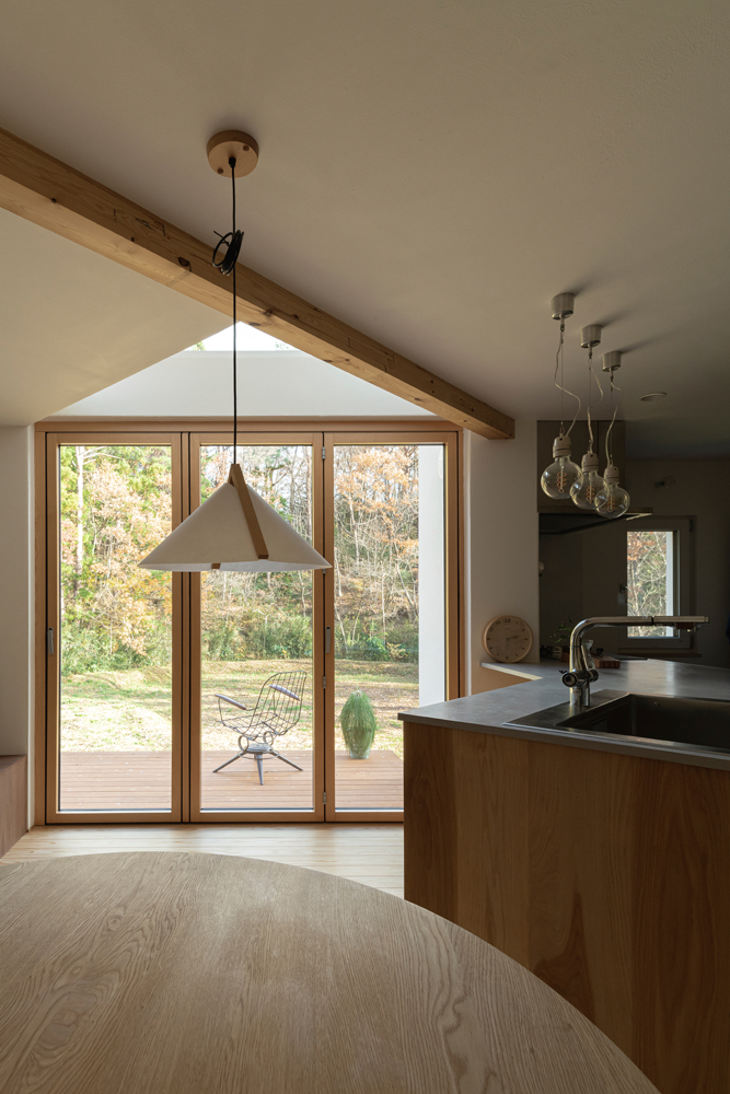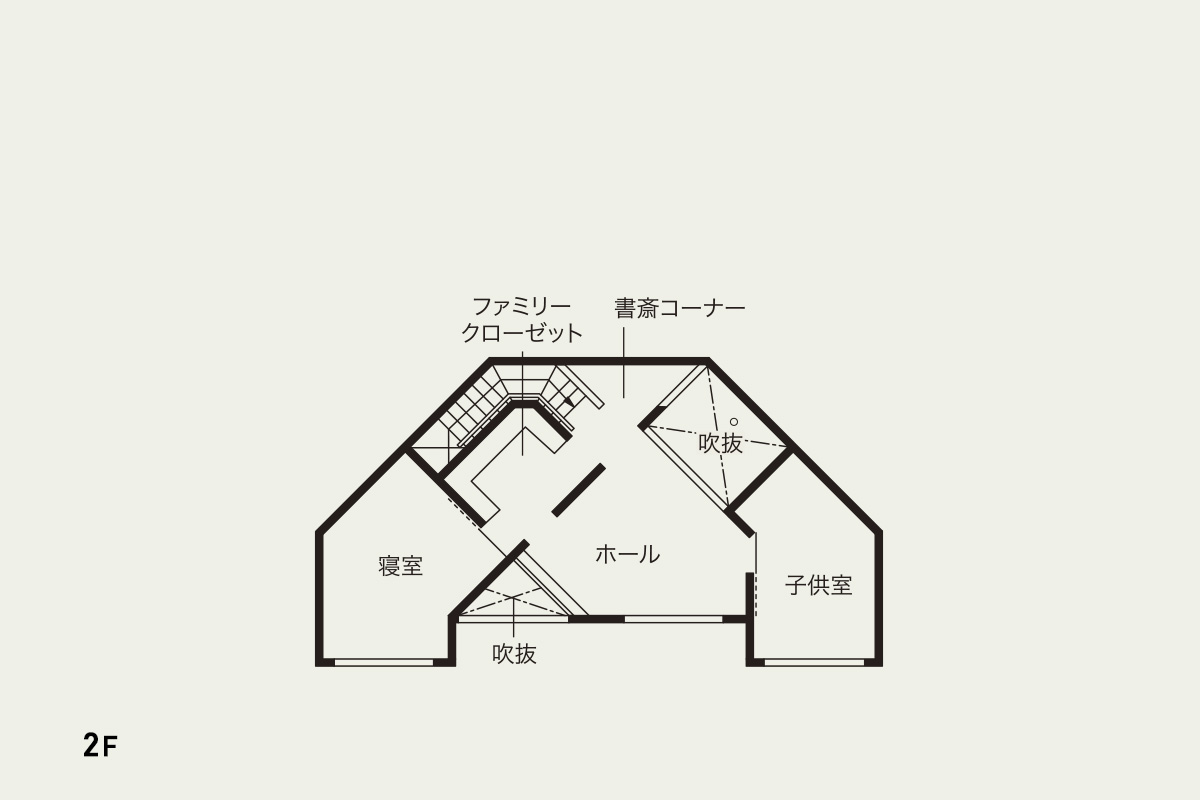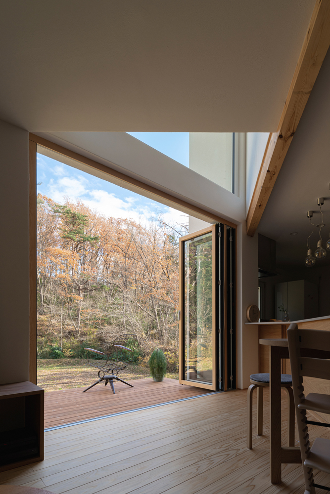 扇型の敷地に立つ六角形の住まい。変形地を巧みに生かし、住宅街側はプライバシーを確保しつつ、敷地の東側に広がる森側には窓をたくさん設けて大きく開くプランとなっています。室内に現れる複数の不規則な形や斜めのラインは変化に富んだ空間を生み出し、同時に天井高や建具の寸法などの工夫ですっきりとした印象に。家のどこにいても周囲の自然を感じられるように、空間ごとに切り取り方が計画された窓、三角形の吹き抜け、リビングとフラットにつながるウッドデッキなど、外部を取り込む工夫が凝らされています。家族が長く心地よく過ごせるよう、国産木材や漆喰など、自然素材を多用。調理にも使用できる薪ストーブを導入し、高性能な住宅をやわらかな温もりが満たしています。